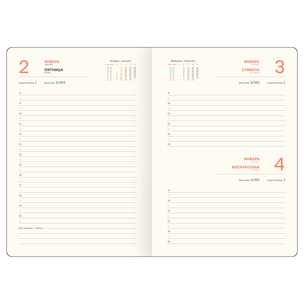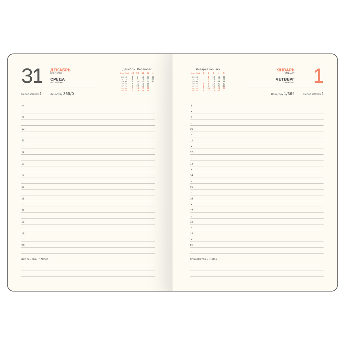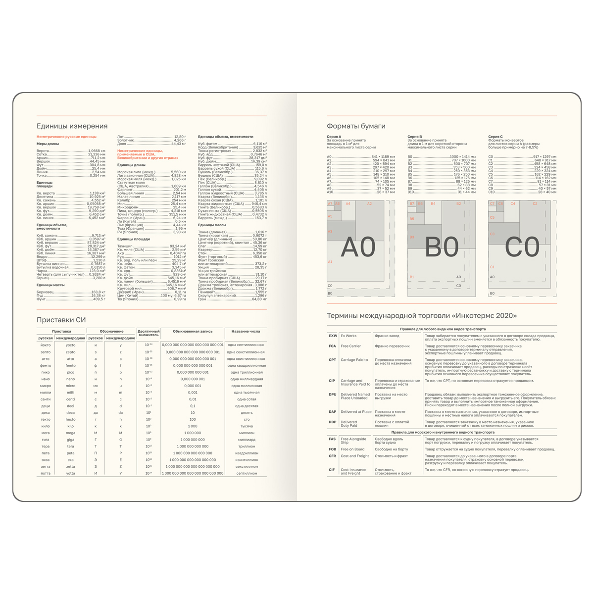 Изделие формата А5 (145*205 мм) состоит из 176 листов тонированной бумаги плотностью 70 г/м2, которая подходит для любых типов ручек и не будет просвечиваться. Перфорированные уголки и закладка-ляссе обеспечат комфорт и удобство при использовании. В ежедневнике предусмотрена справочная информация, ежемесячный планер, календарь и другие полезные сведения. Индивидуальная упаковка в термоусадочную пленку.
