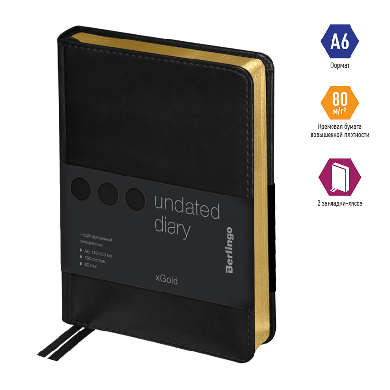О товаре «Ежедневник недатированный, А6, 160л., кожзам, Berlingo "xGold", зол. срез, черный»
