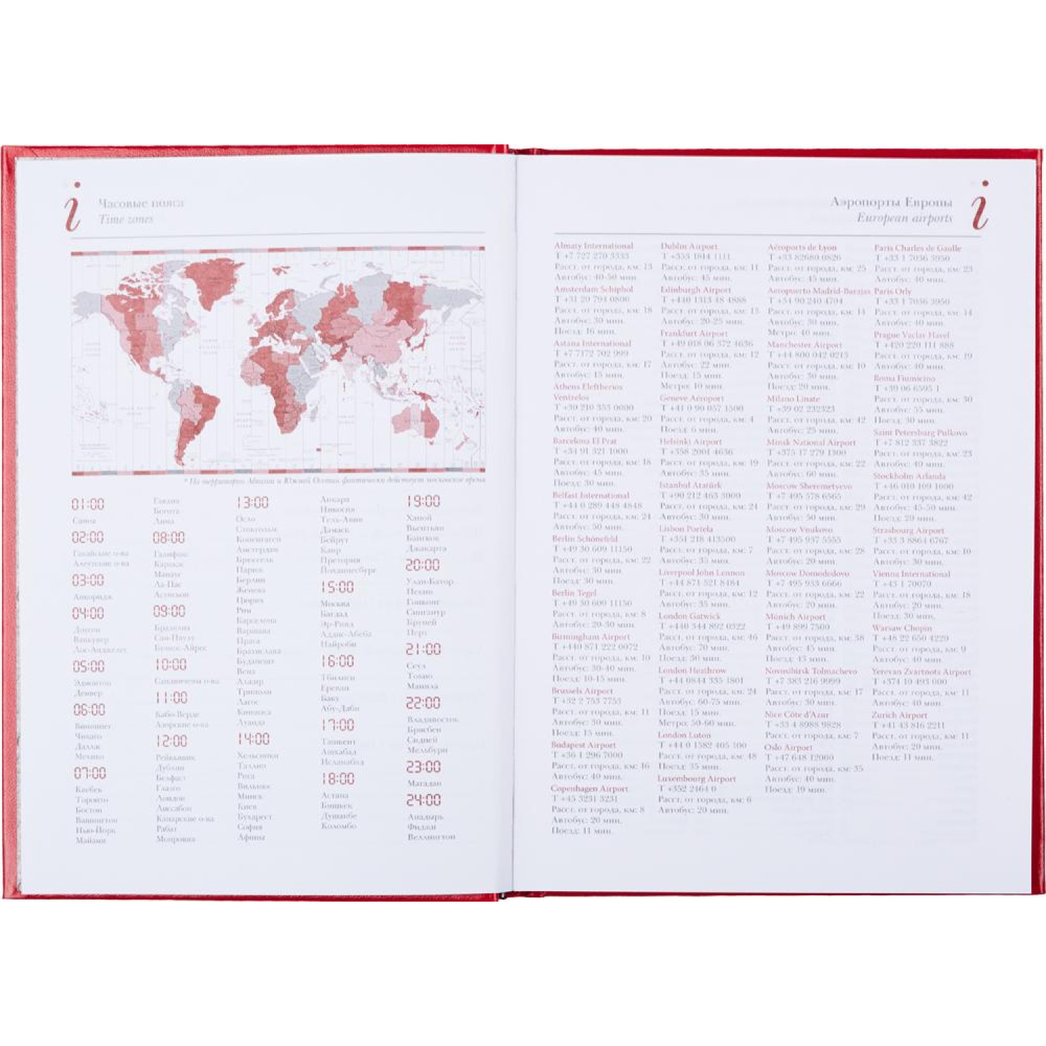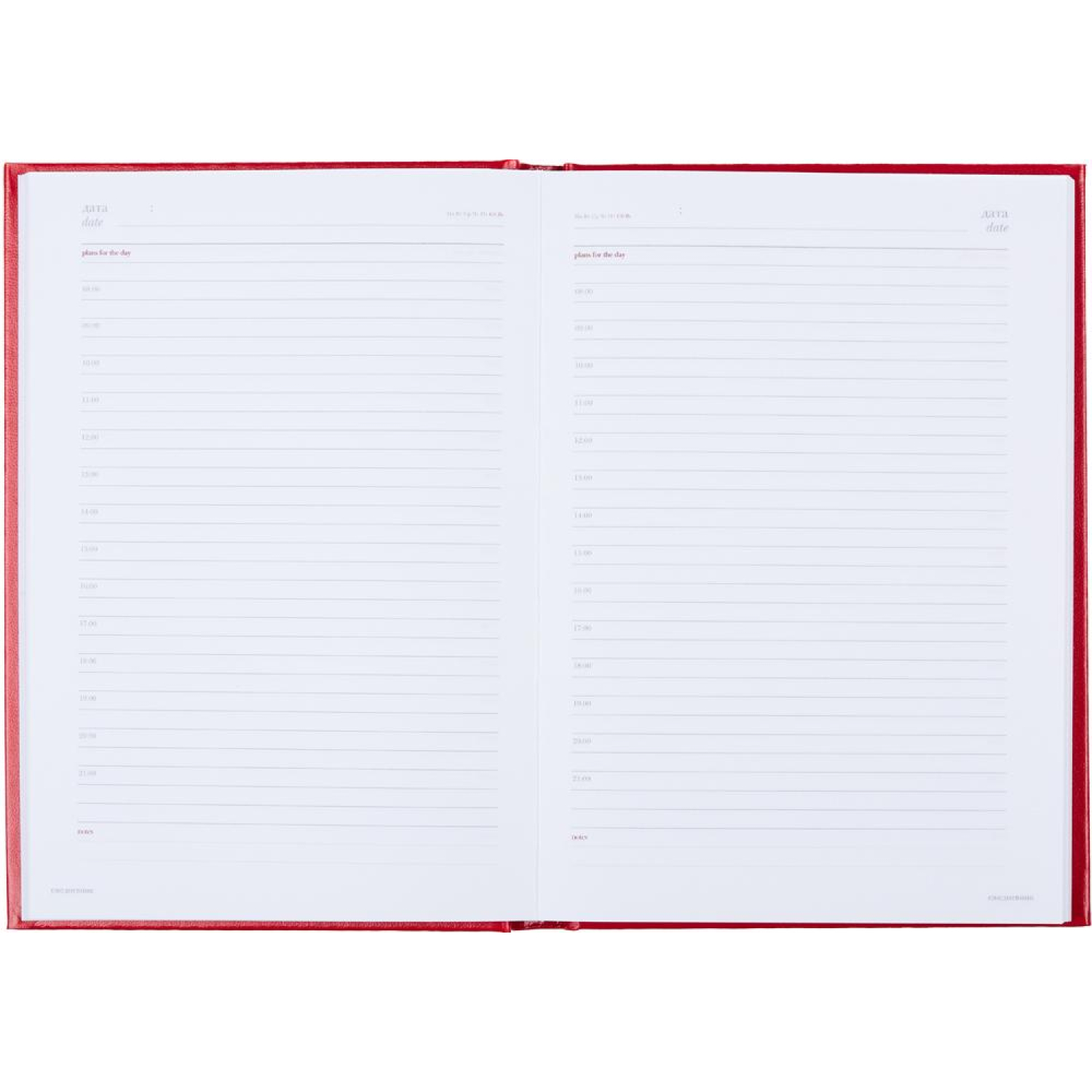 Формат А5+ (146×206 мм) делает ежедневник удобным для записи и использования в течение рабочего дня. Внутренний блок состоит из 136 листов (272 страницы) белой офсетной бумаги плотностью 90 г/кв.м., с линовкой в линейку и печатью в два цвета. Каждая страница содержит место для написания текущей даты и почасовую разбивку, что делает ежедневник удобным для планирования дня. Также предусмотрены две строчки для комментариев.