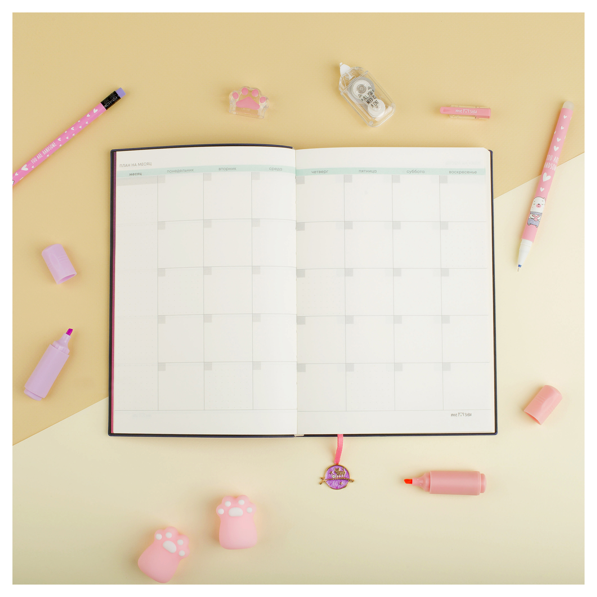 Недатированный ежедневник MESHU "Find your way. Pink" формата А5 — отличный помощник для тех, кто ценит своё время. Размер изделия — 143*210 мм. Внутренний блок состоит из 136 листов кремовой бумаги повышенной плотности 80 г/м². Ежедневник содержит справочные материалы. Обложка сделана из ультрамягкой экокожи. Дизайн подчёркивают закладка-ляссе с подвеской и отделка глиттером.