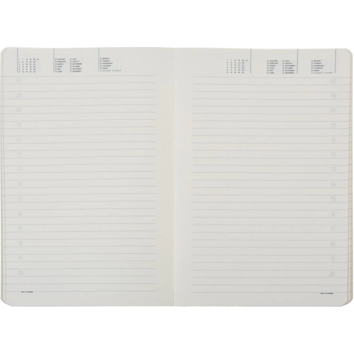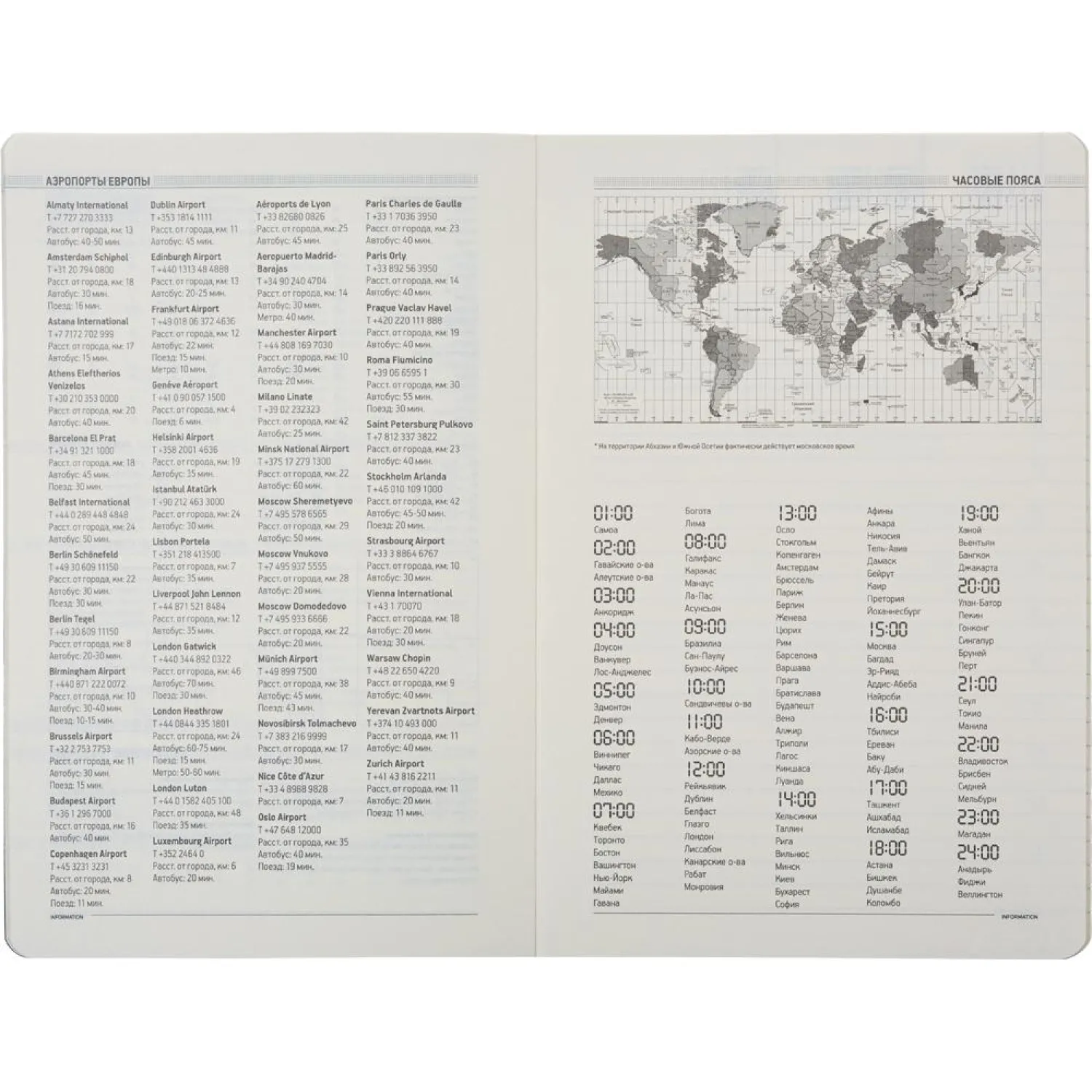 Внутренний блок на 136 страниц состоит из бежевого офсетного материала повышенной плотности (90 г/кв.м.). Блок не привязан к датам, которые можно указывать в выделенном поле вверху страницы. Тонированная бумага снижает утомляемость глаз. Внутри ежедневника также есть справочный раздел и телефонная книга.