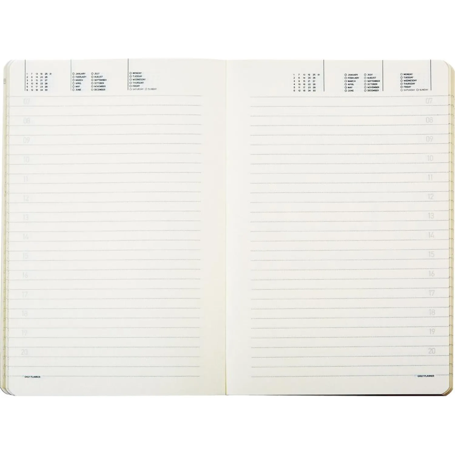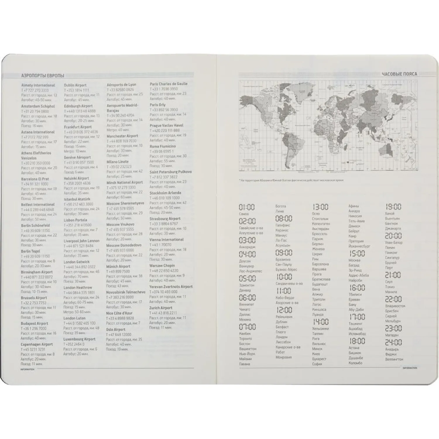 Внутренний блок на 136 страниц состоит из бежевого офсетного материала с плотностью 90 г/кв.м. Блок не привязан к датам, которые можно указывать в выделенном поле вверху страницы. Тонированная бумага снижает утомляемость глаз. В ежедневнике также есть справочный раздел и телефонная книга.