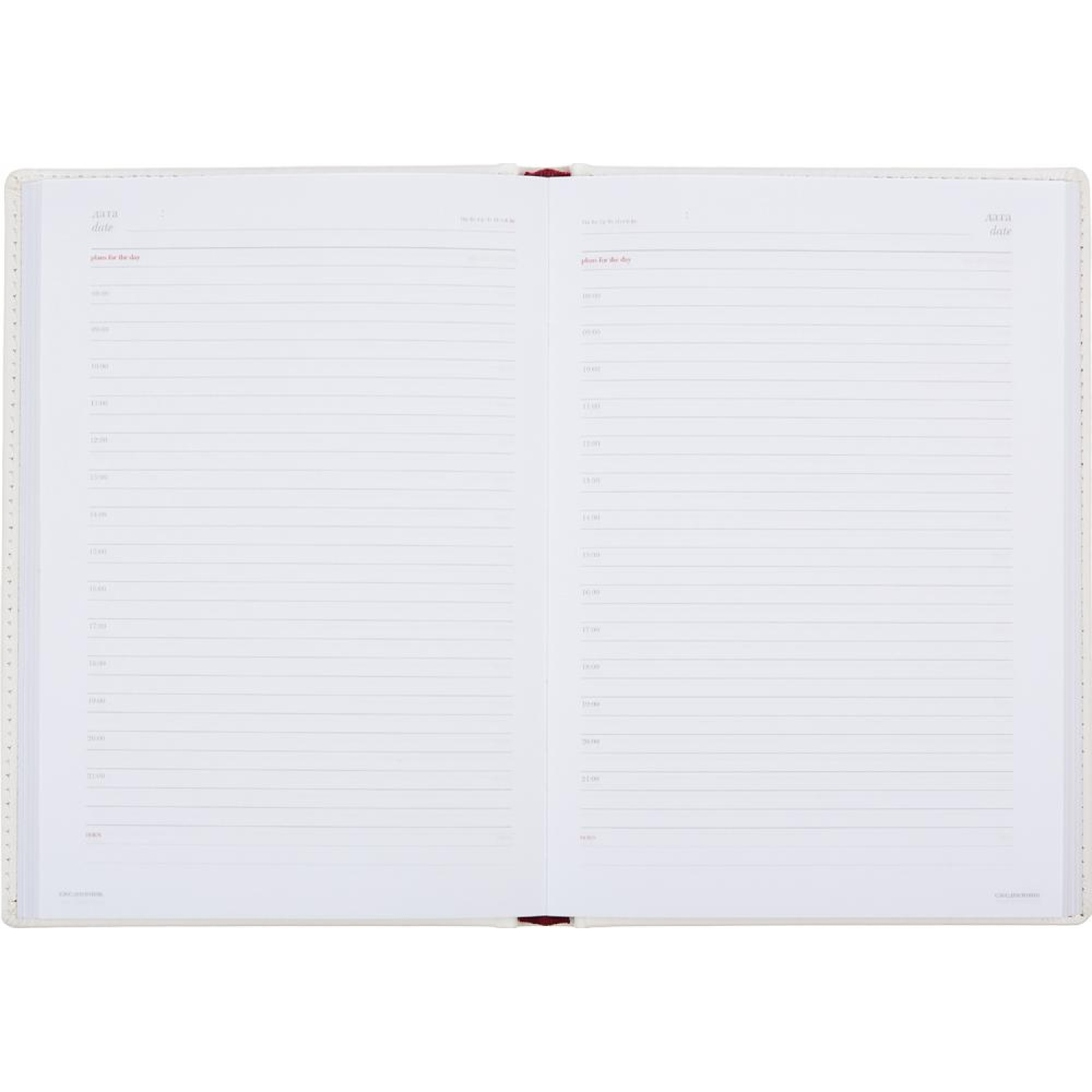 Внутренний блок на 136 листов из белой офсетной бумаги плотностью 90 г/кв.м. включает линейку с печатью в два цвета и почасовую разметку, что помогает удобно планировать день. Внутри также есть справочный раздел (14 страниц) и телефонная книга (18 страниц), структурированная по алфавиту. Ежедневник имеет размер 14.6×20.6 см и тип крепления блока — сшивка.