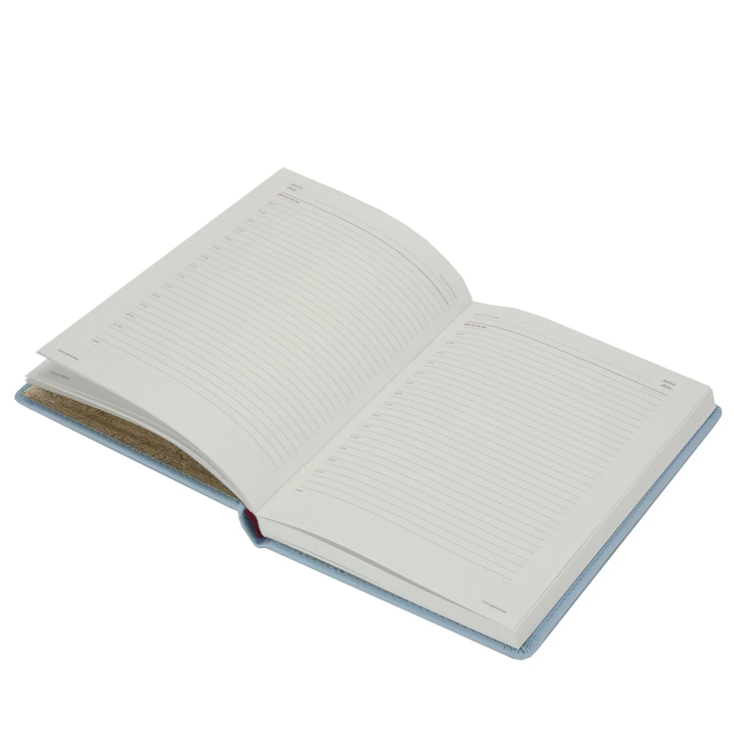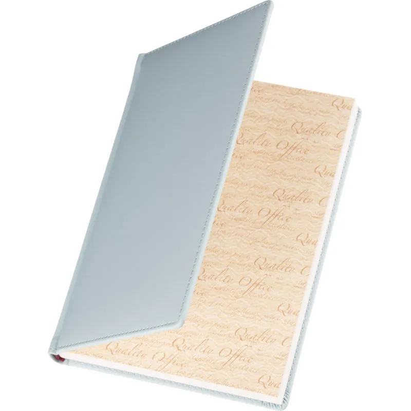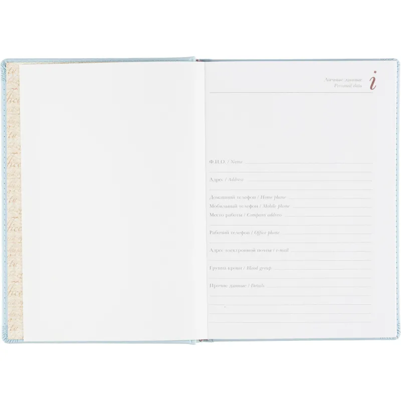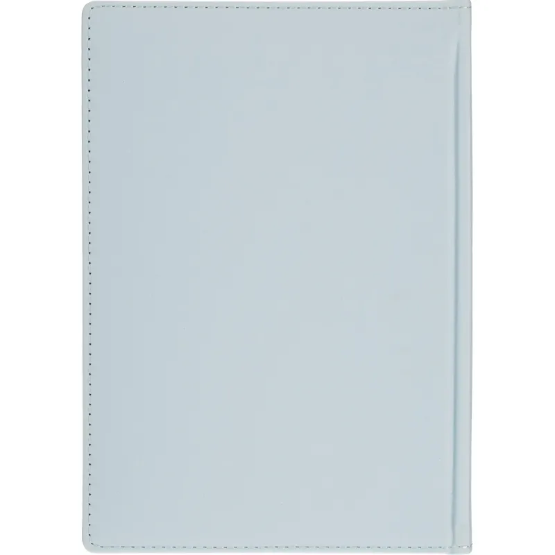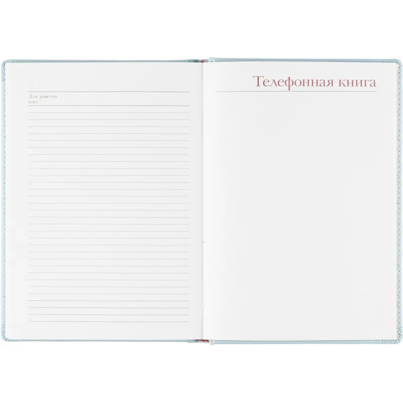 Ежедневник формата A5+ с твёрдой обложкой голубого цвета, выполненной из материала, имитирующего кожу, станет стильным и удобным аксессуаром для ежедневных записей. Внутренний блок состоит из 136 листов (272 страницы) белой офсетной бумаги плотностью 90 г/кв.м. с линейкой. Печать выполнена в два цвета.
