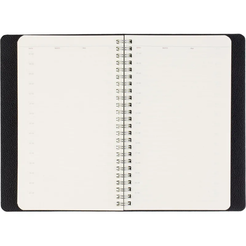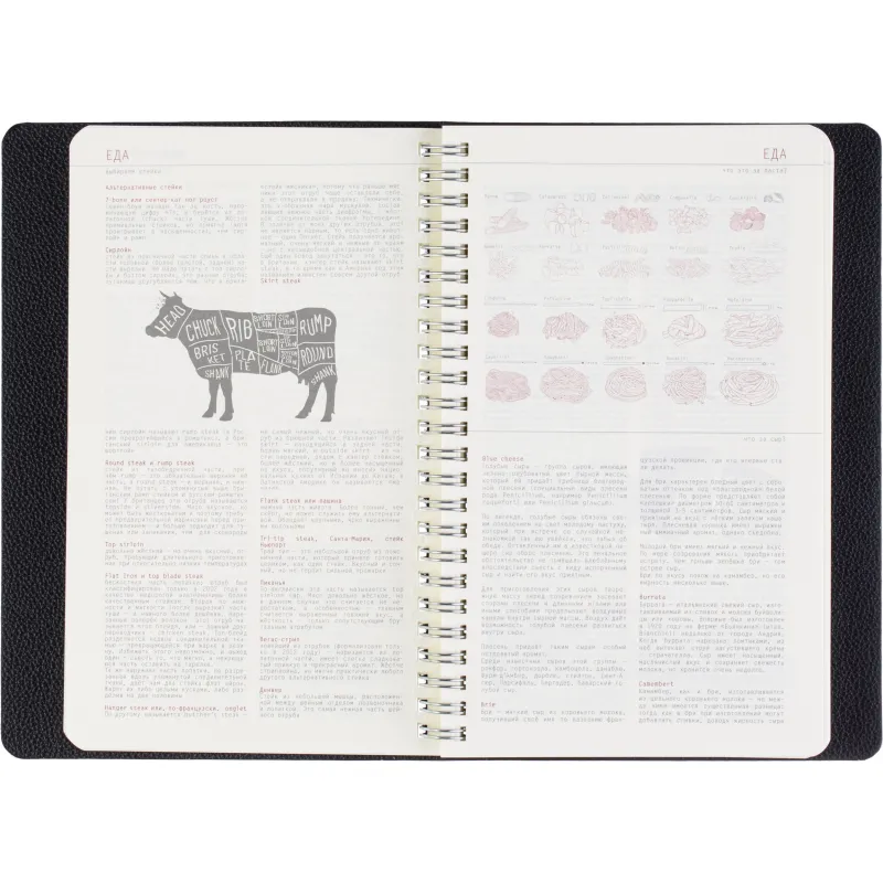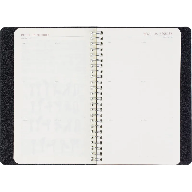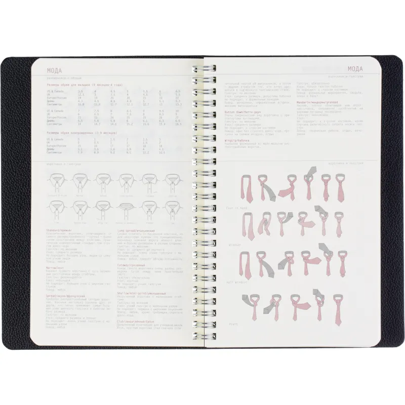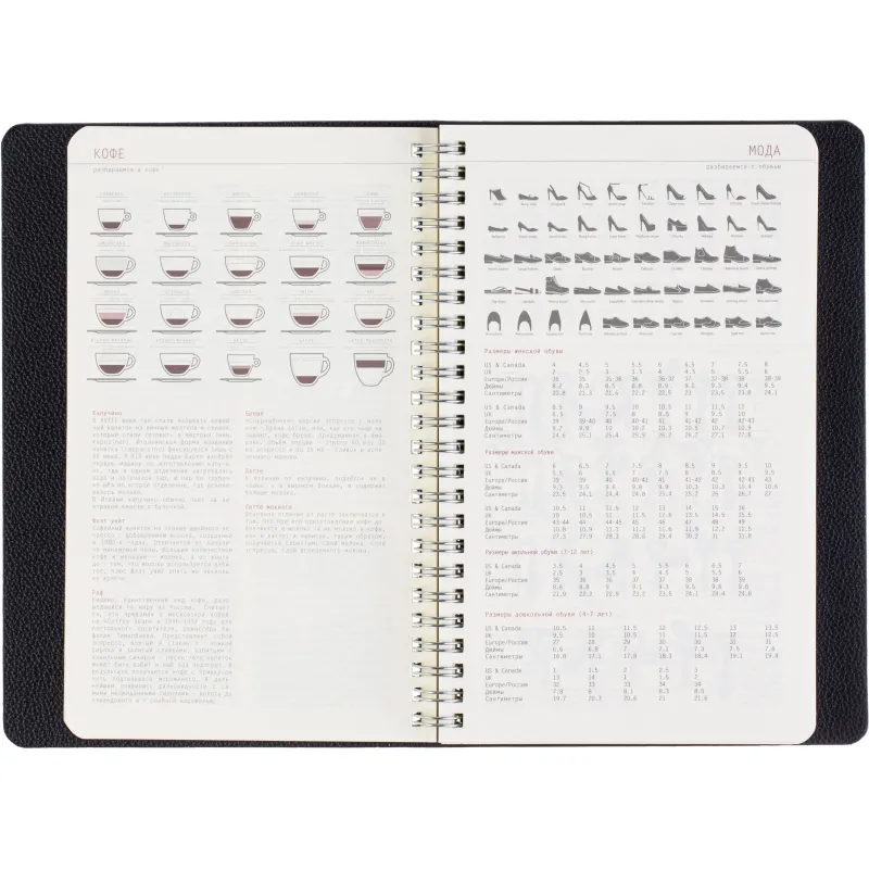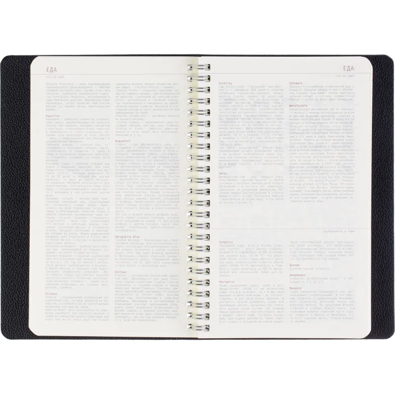 Недатированный ежедневник формата А5 сочетает мягкую обложку и полускрытый гребень, позволяющий раскрывать блок на 360 градусов. Обложка выполнена из искусственной кожи с аккуратной прострочкой по периметру. Внутри - офсетная бумага бежевого оттенка плотностью 70 г/кв.м, с печатью в две краски и линовкой в линию. Блок включает 272 страницы, среди которых 19 отведены под справочную информацию. Крепление на спирали. Ежедневник упакован в подарочную коробку.