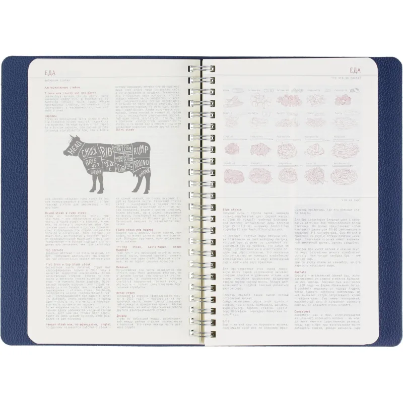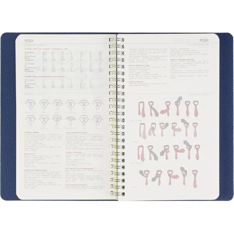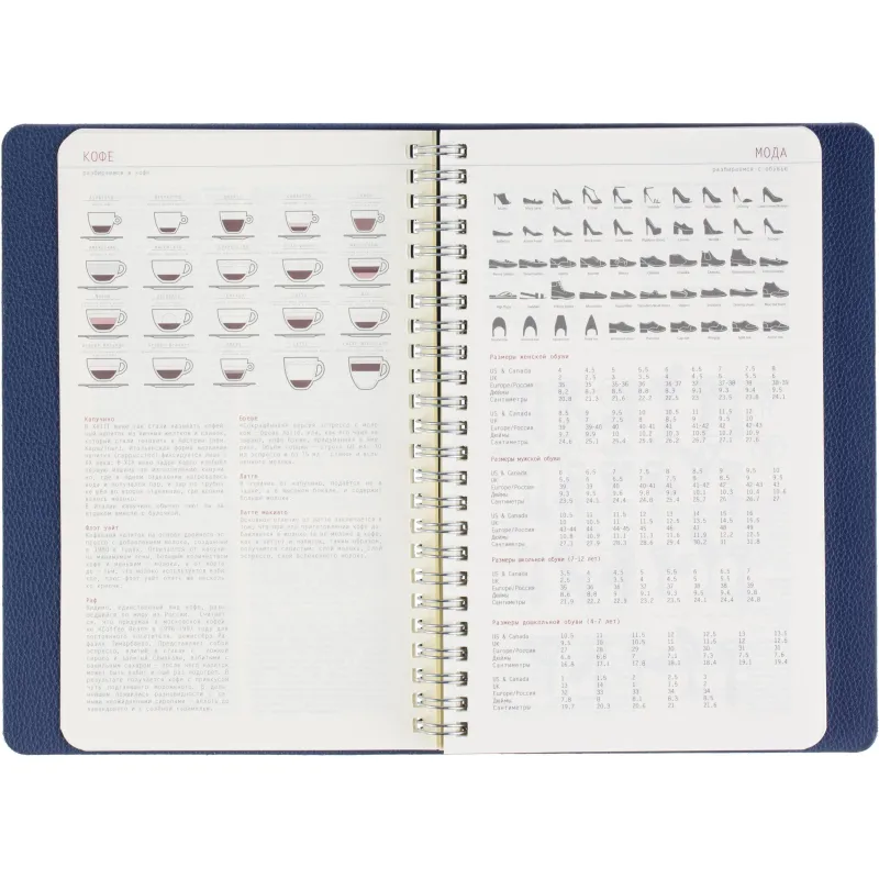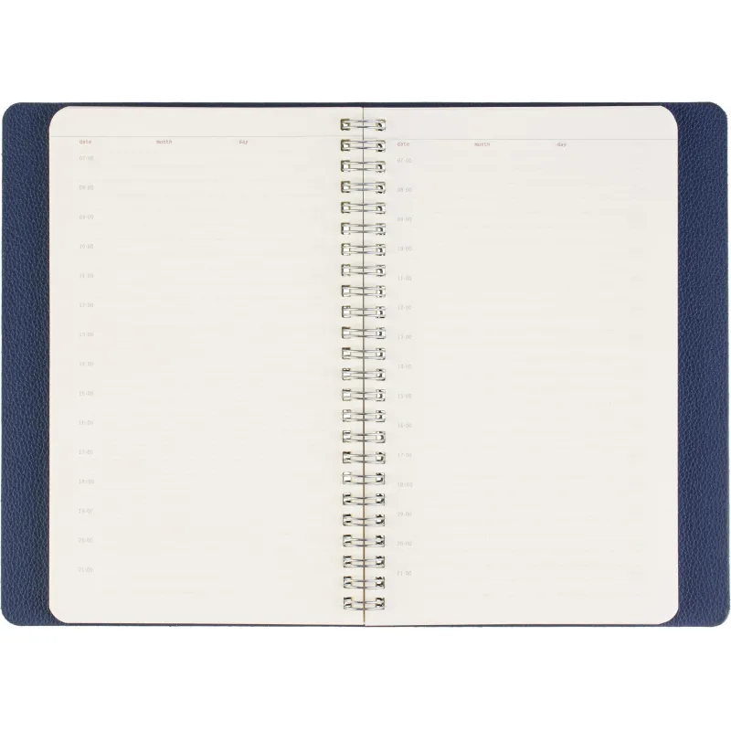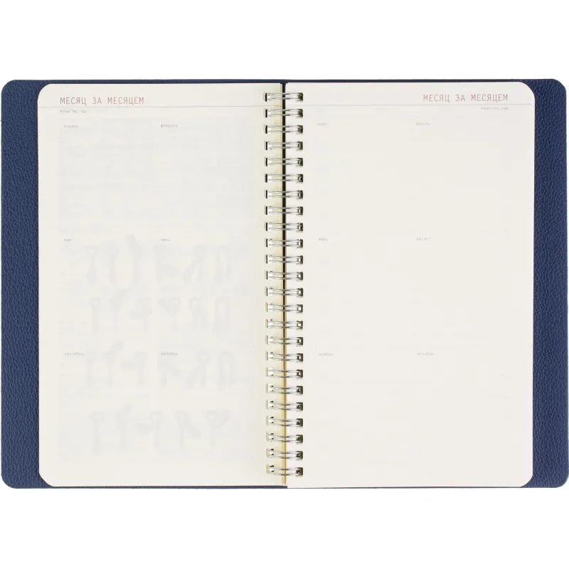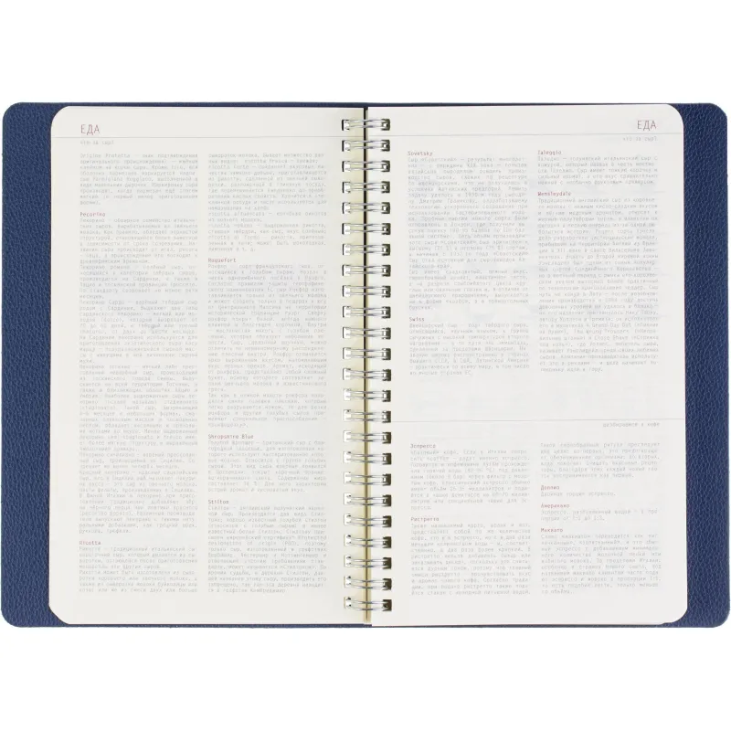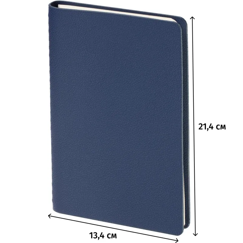Недатированный ежедневник формата А5 сочетает гибкую мягкую обложку и полускрытый гребень, позволяющий раскрывать блок на 360 градусов. Обложка выполнена из синей искусственной кожи с аккуратной прострочкой по периметру. Внутри - офсетная бумага тонированного бежевого оттенка плотностью 70 г/кв.м с линовкой и печатью в две краски. Внутренний блок содержит 272 страницы, включая 19 страниц справочной информации. Удобный формат и прочное спиральное крепление делают ежедневник практичным инструментом для планирования. Упакован в подарочную коробку.