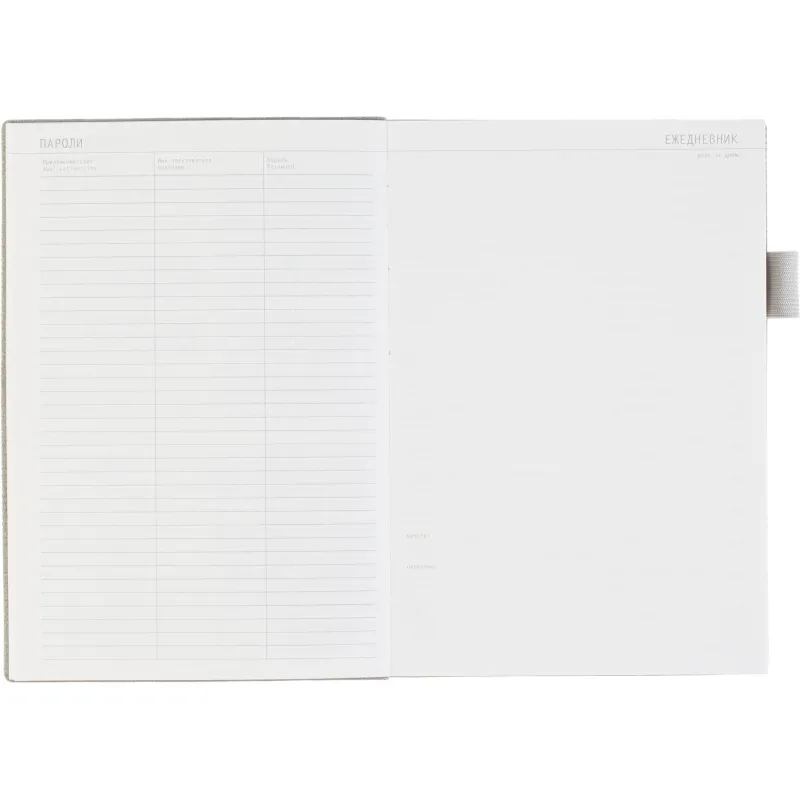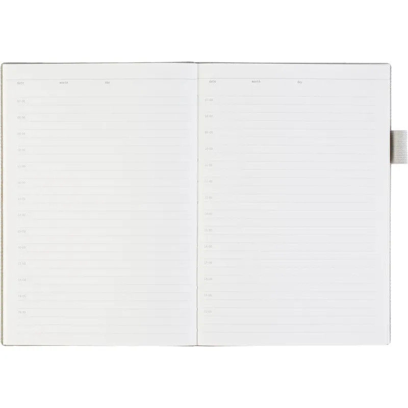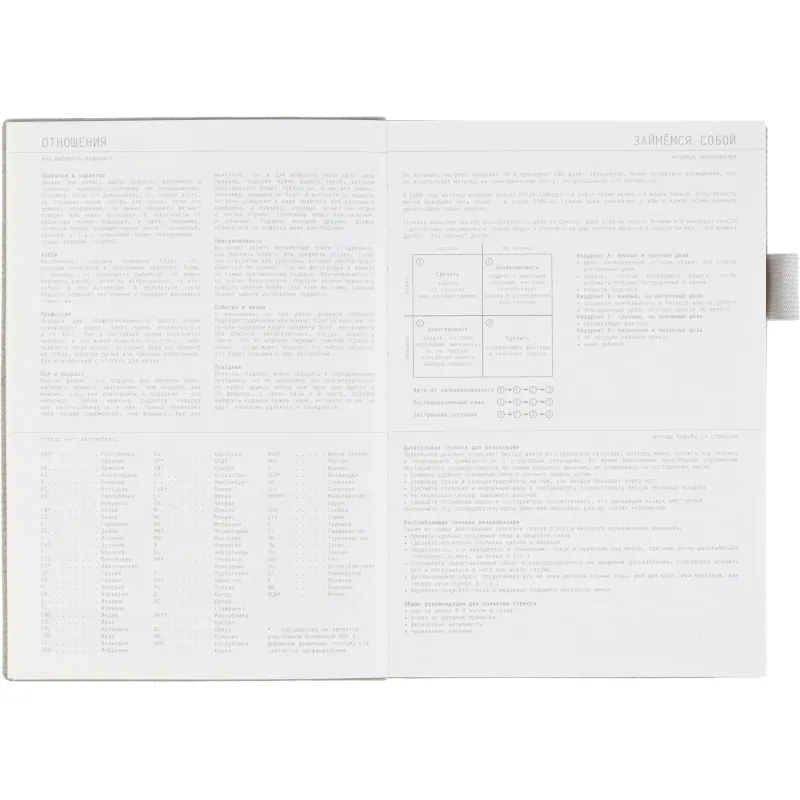 Недатированный ежедневник формата А5 выполнен в мягкой гибкой обложке из искусственной кожи. Модель оснащена петлёй под ручку и двойным ляссе, зафиксированным на корешке. Внутренний блок включает 128 листов офсетной бежевой бумаги плотностью 80 г/кв.м с линовкой и печатью в одну краску. В начале размещены 14 страниц справочной информации. Ежедневник прошит, не имеет скруглённых углов и подходит для персонализации.