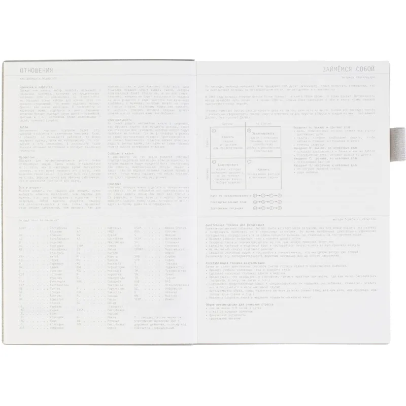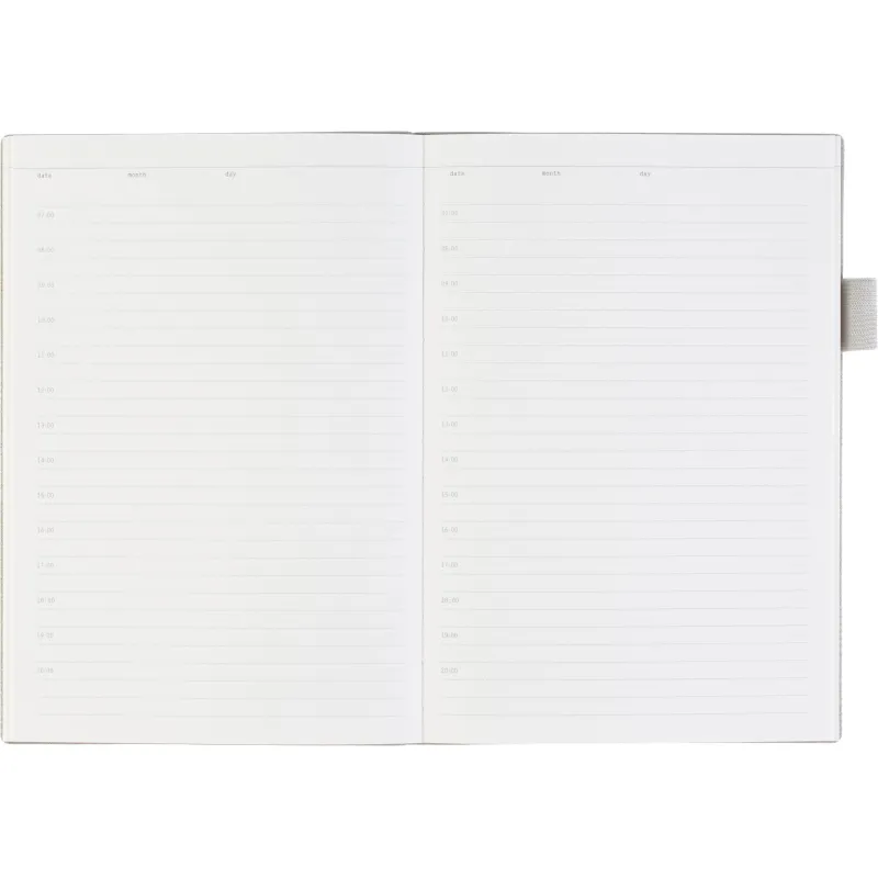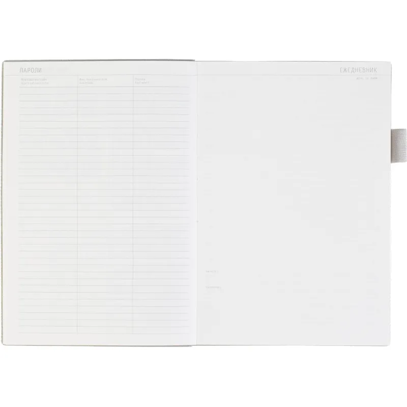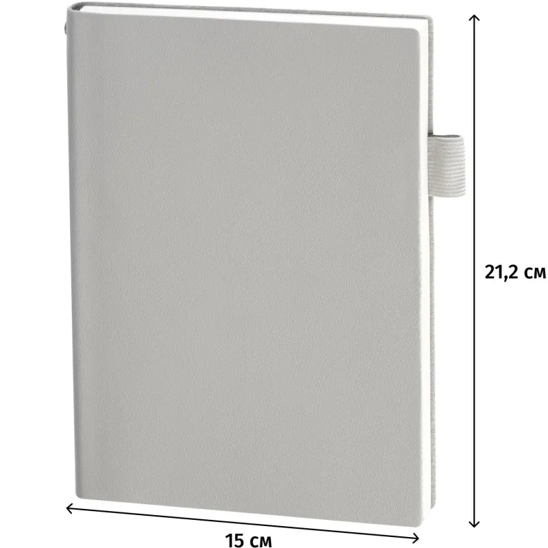 Недатированный ежедневник формата А5 выполнен в мягкой серой обложке из искусственной кожи. Гибкая конструкция дополнена петлёй под ручку и двойным ляссе, закреплённым на корешке. Такое решение подчёркивает внимание к деталям. Внутренний блок включает 128 листов тонированной офсетной бумаги плотностью 80 г/кв.м с линовкой и печатью в одну краску. В начале предусмотрено 14 страниц справочной информации. Крепление выполнено на сшивке. Ежедневник не имеет скруглённых углов и подходит для персонализации.