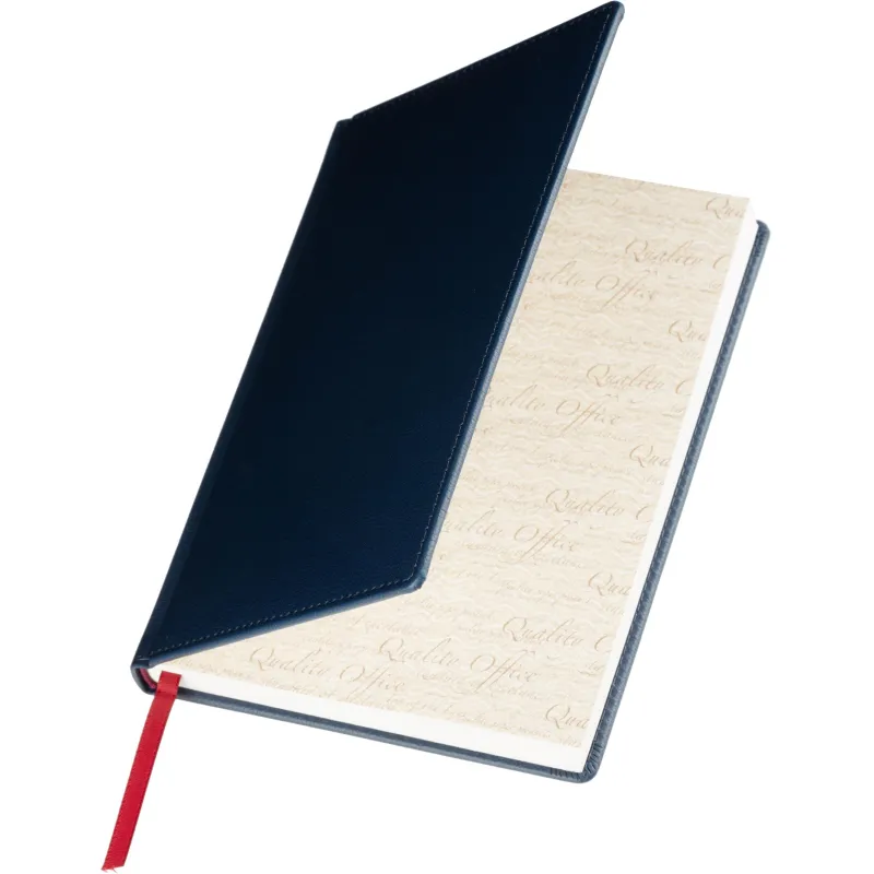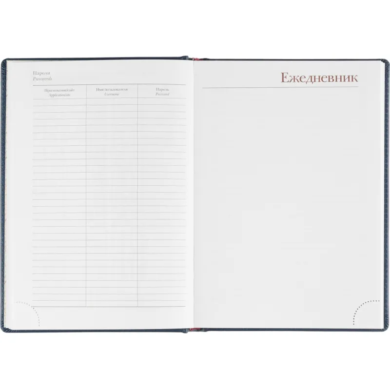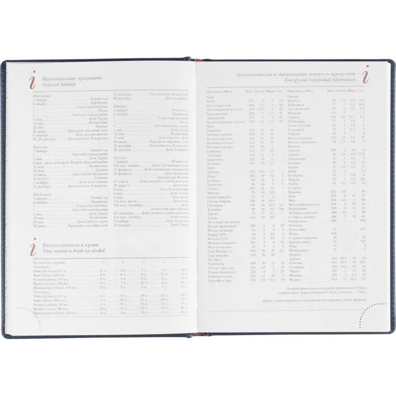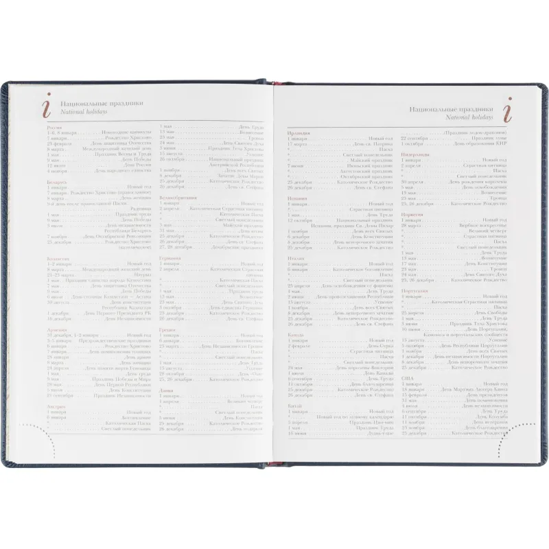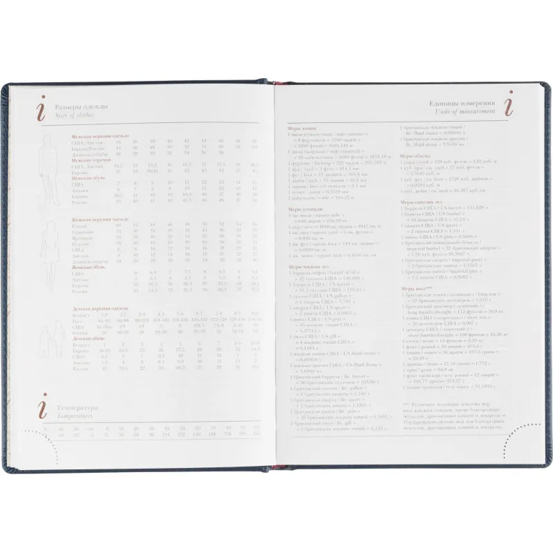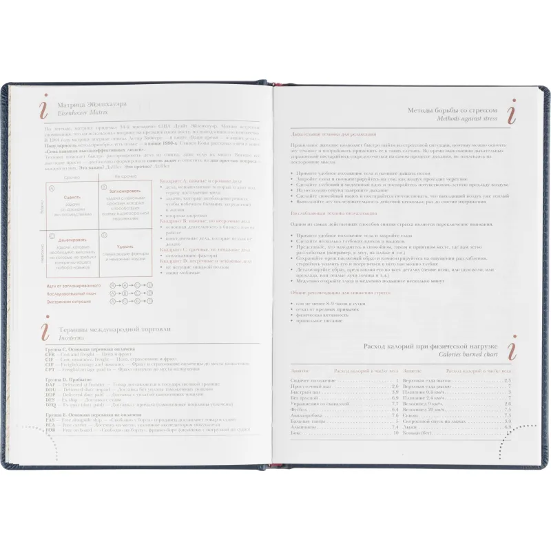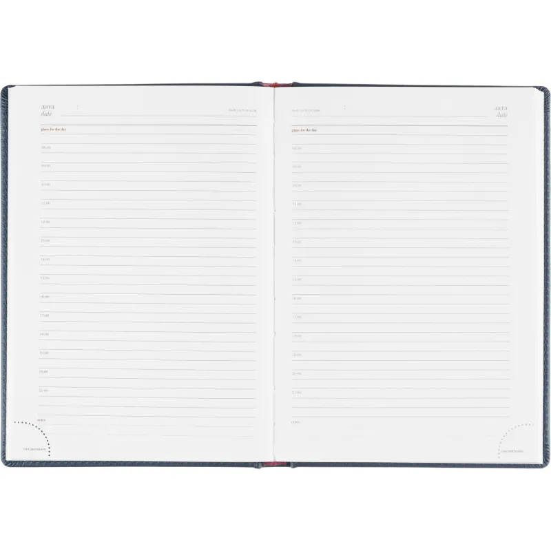 Ежедневник формата А5 (14,5×20,5 см) включает 136 страниц белой офсетной бумаги с плотностью 90 г/кв.м. Линовка в линейку с указанием времени суток позволяет удобно планировать рабочий день и эффективно использовать ежедневник в офисе. На каждой странице есть бордовое ляссе для навигации, что улучшает удобство работы с ним.