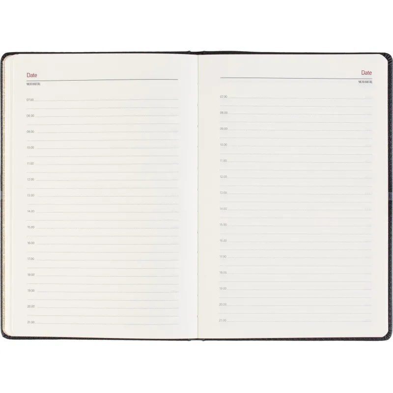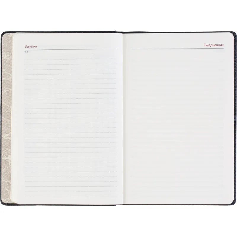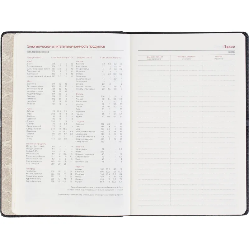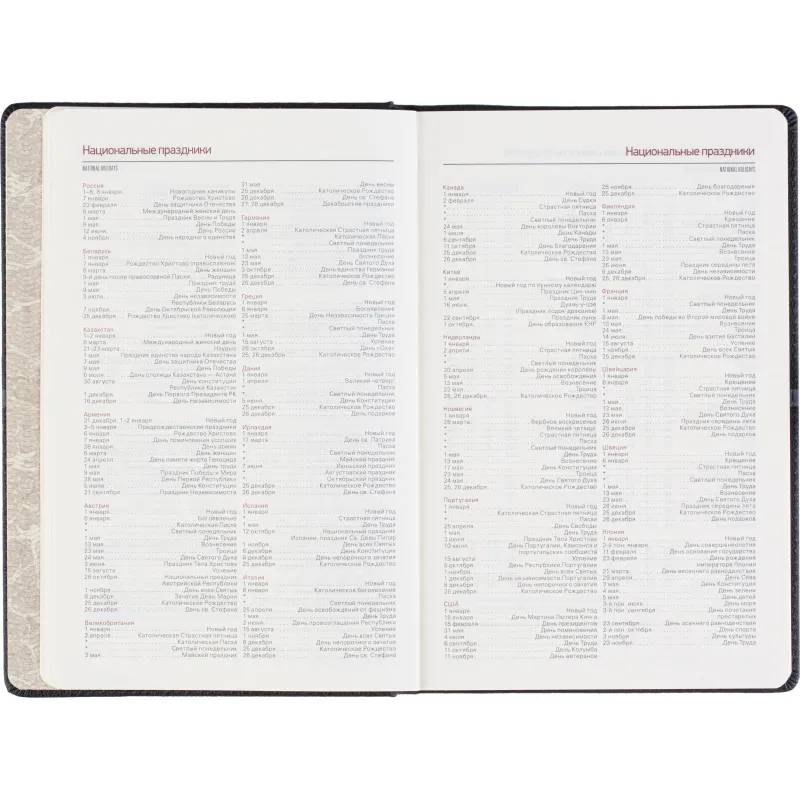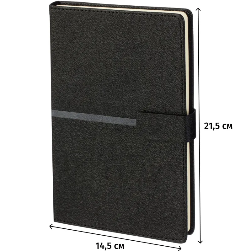 Недатированный ежедневник формата А5 выполнен в твёрдой чёрной обложке из искусственной кожи с декоративной строчкой по периметру. Классический сшивной переплёт дополнен магнитным хлястиком и ляссе в цвет обложки. Внутренний блок содержит 272 страницы тонированной офсетной бумаги плотностью 70 г/кв.м с линовкой и печатью в две краски. В структуру включены страницы для персональных данных, планирования по месяцам и записи задач по времени с шагом один час. Также предусмотрено 9 страниц справочной информации. Модель подходит под персонализацию и поставляется в подарочной упаковке.