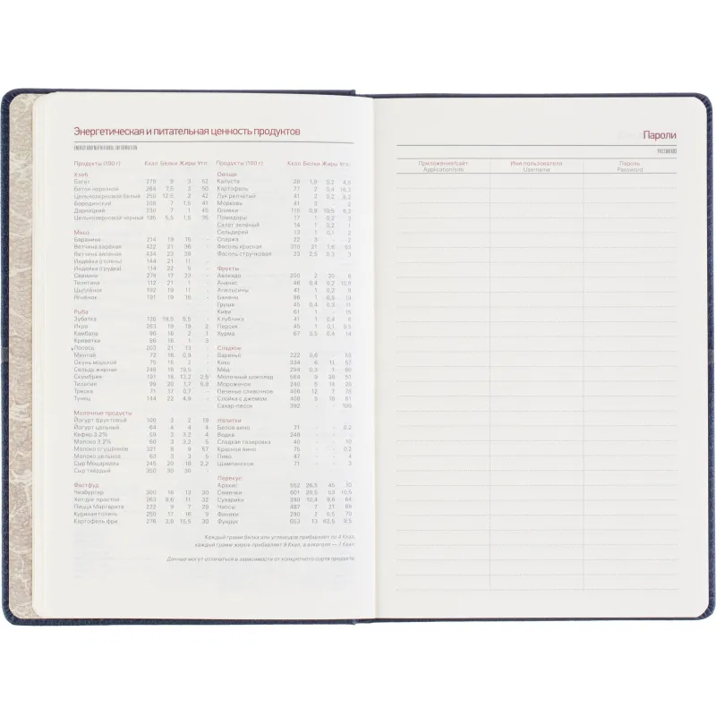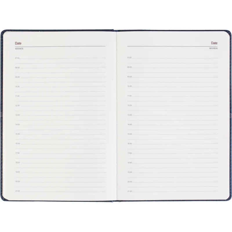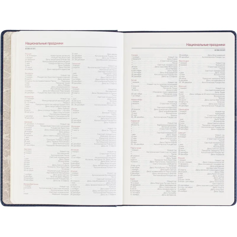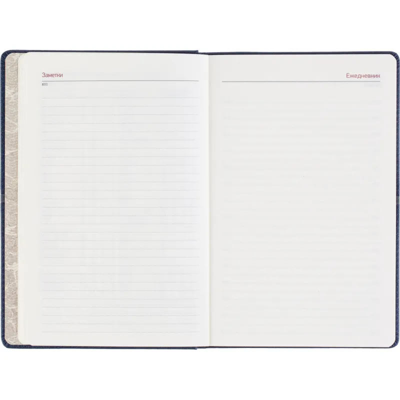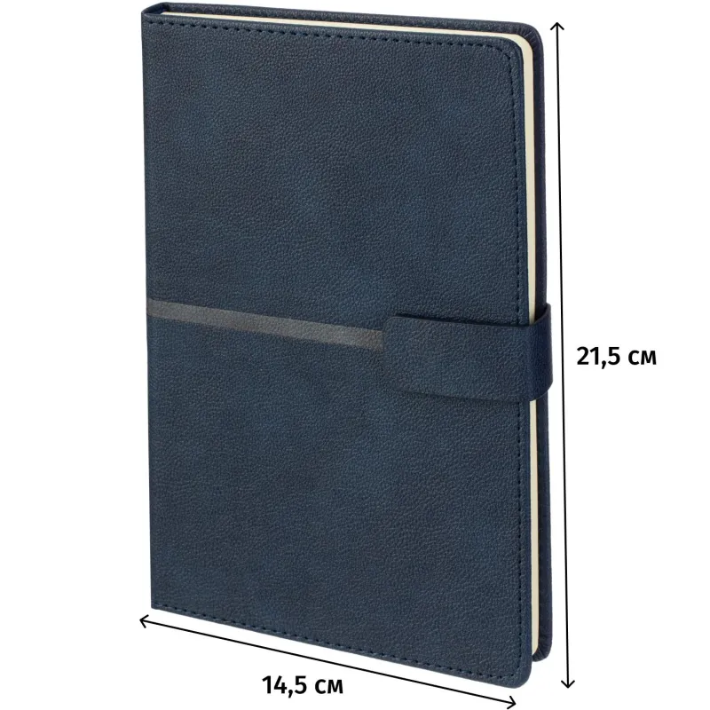 Недатированный ежедневник формата А5 выполнен в жёсткой обложке из синей искусственной кожи с декоративной прострочкой по периметру. Классический сшивной переплёт и магнитный хлястик подчёркивают строгость оформления. Ляссе выполнено в тон обложки. Внутренний блок включает 272 страницы тонированной офсетной бумаги плотностью 70 г/кв.м с линовкой и печатью в две краски. В структуре ежедневника предусмотрены разделы для персональных данных, помесячного планирования и записи задач по времени с шагом в один час. В справочную часть включены 9 страниц с полезной информацией. Ежедневник поставляется в подарочной упаковке и подходит для персонализации.