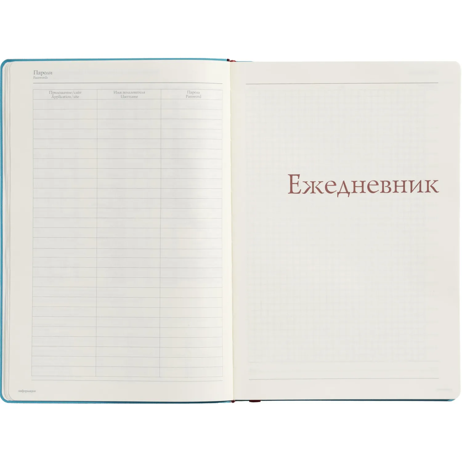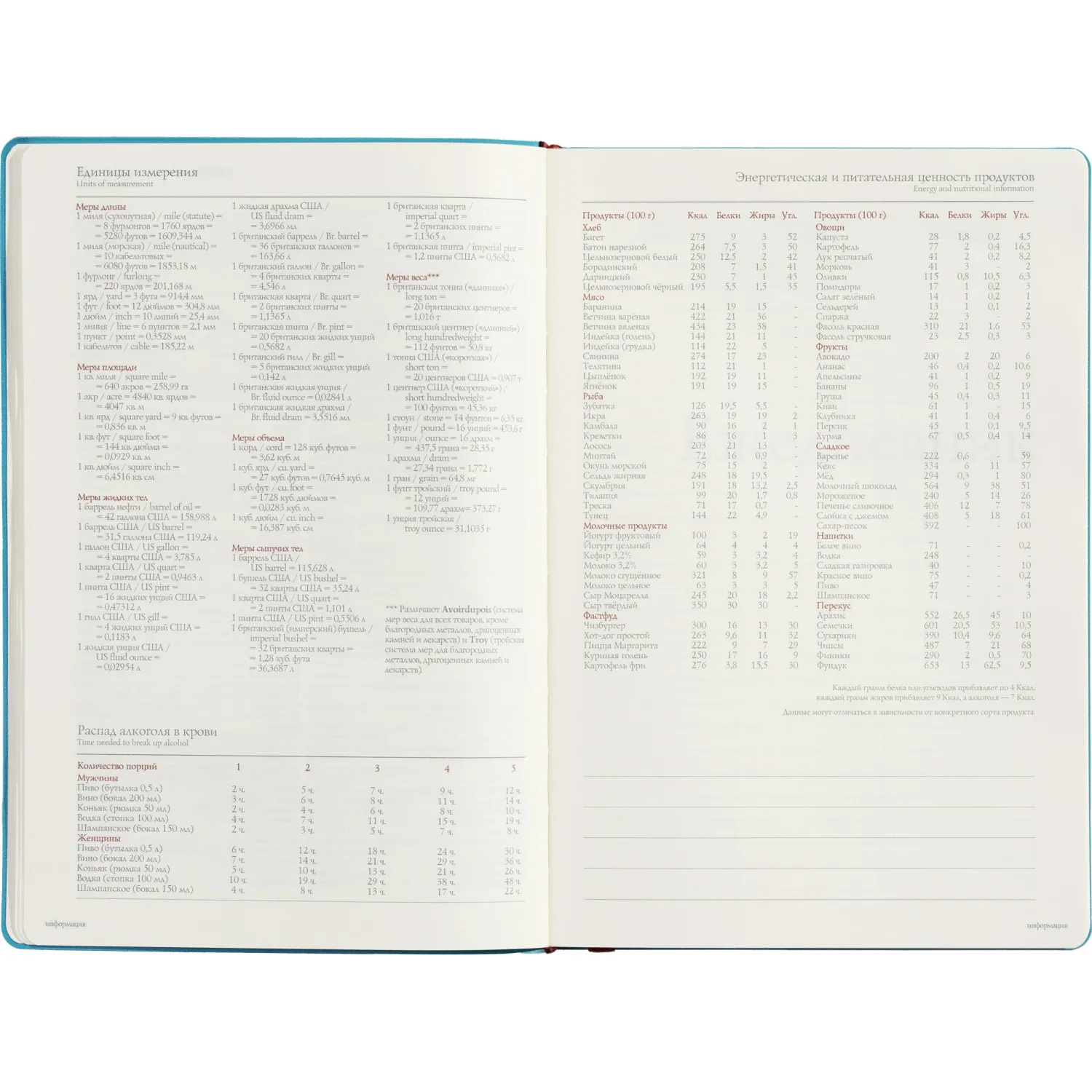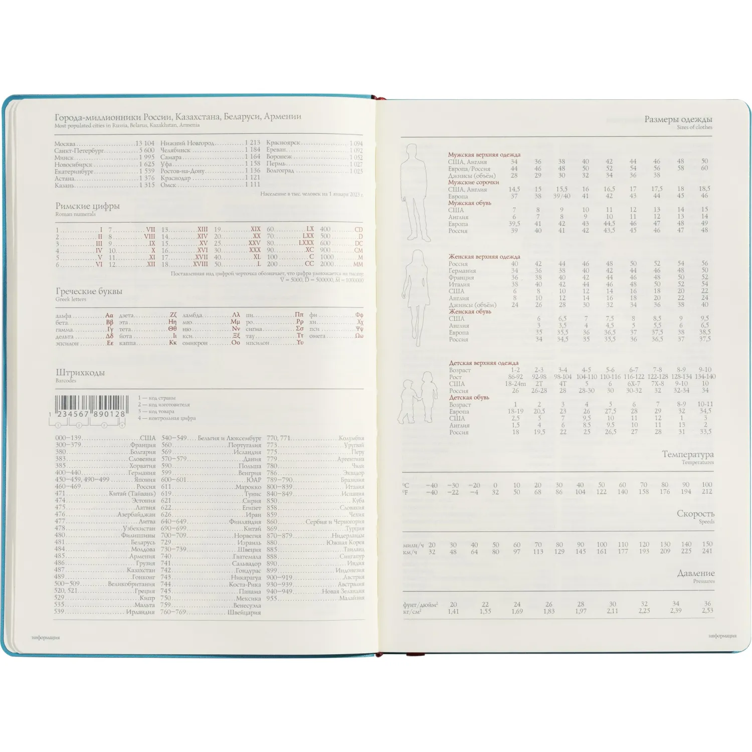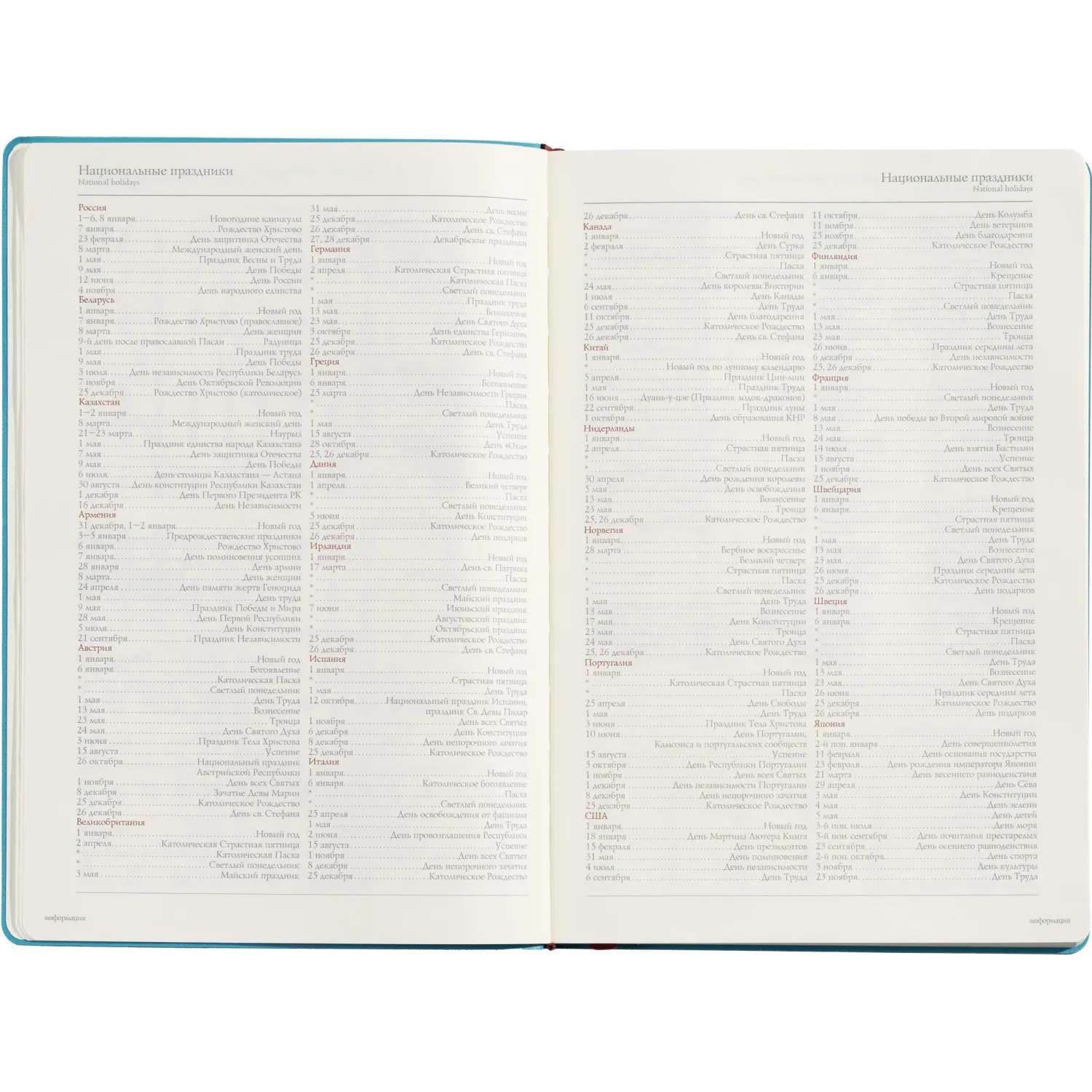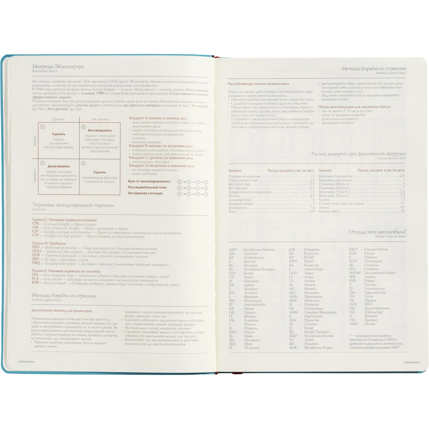 Ежедневник формата A5 (14,5×21,2 см) включает 136 страниц тонированной офсетной бумаги плотностью 90 г/кв.м., с клеточной линовкой, подходящей для записи. В нём также присутствует справочный раздел на 17 страницах, содержащий полезную информацию: часовые пояса, аэропорты Европы, телефонные коды, международные праздники, цифровые коды субъектов РФ и СНГ и многие другие данные, которые делают его удобным для использования в различных ситуациях.