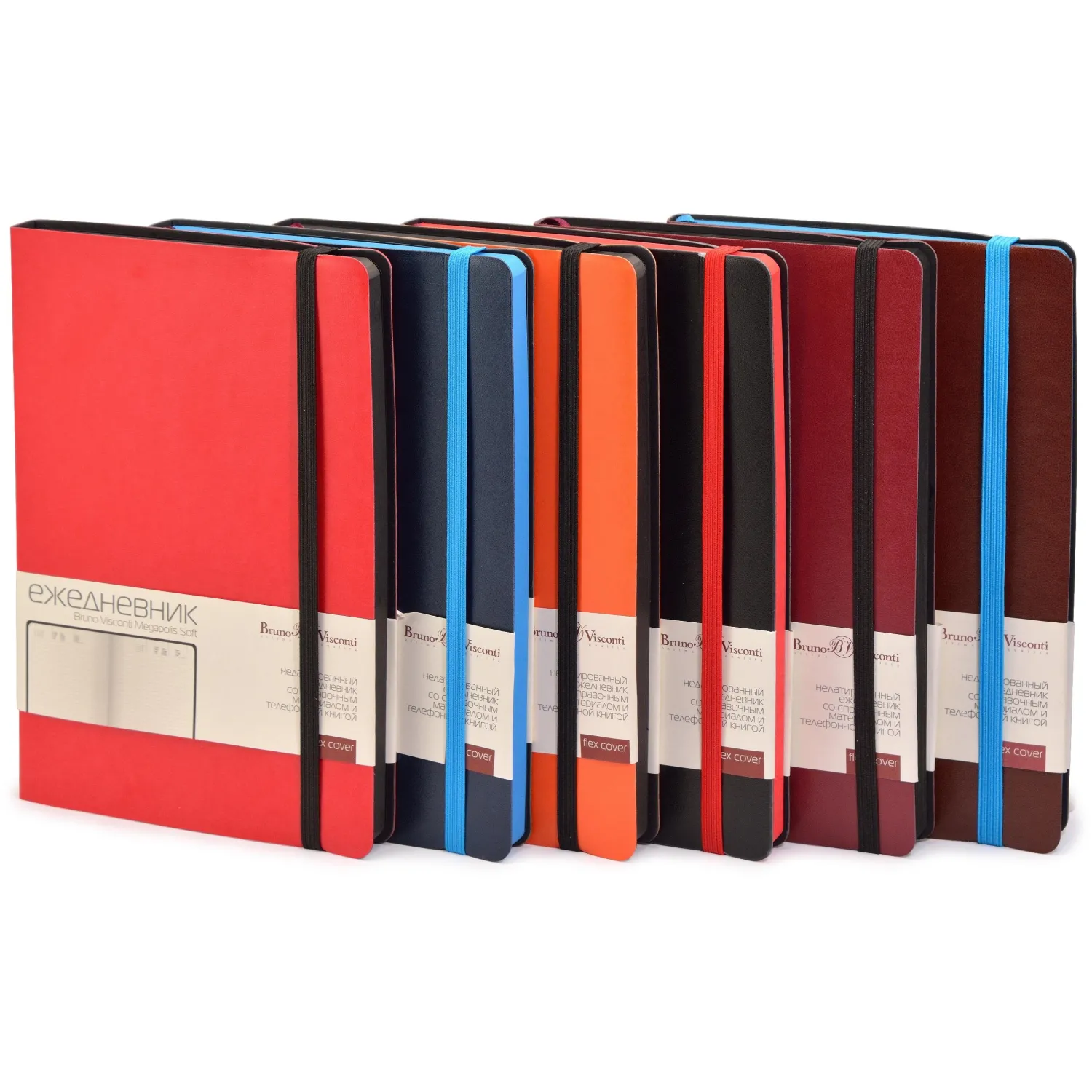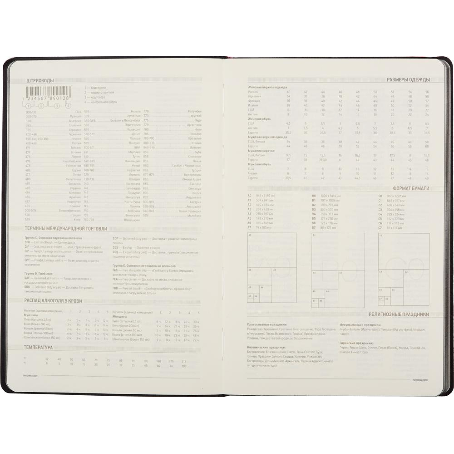 Ежедневник недатированный Bruno Visconti, цвет красный. Коллекция Megapolis Soft. Формата А5, размер изделия - 144x212 мм. Обложка ежедневника выпускается мягкой и гибкой. Черный обрез блока и такая же фиксирующая резинка. Тип возможного тиснения - фольгирование и шелкотрафаретная печать. Края блока имеют закругленную форму и совпадают с краями обложки. Красивая обложка, плотная и приятная на ощупь бумага - эта записная книга подходит для серьёзного человека. На листах не стоят даты, а это значит, что её можно начинать вести в любой день года и располагать ровно столько записей на листе, сколько вам нужно. Блок: недатированный, 136 листов (272 страницы) бежевой бумаги с плотностью 70 г/кв.м. , печать блока в 1 краску. Конверт для визиток на последней обложке. Справочная информация включает: личные данные, часовые пояса, аэропорты Европы, межународные телефонные коды, размеры одежды, цифровые автомобильные коды России, Беларуси, Казахстана, Армении, штрих-коды , энергетическая и питательная ценность продуктов, расход калорий, формат бумаги, греческие буквы, национальные праздники, единицы измерения, страны мира, буквенные коды стран в соответствии с ISO 3166-1 alfa 3, термины международной торговли, давление, дни рождения и годовщины, поле для заметок. Последние восемь листов - отрывные и дополнены микроперфорацией.
