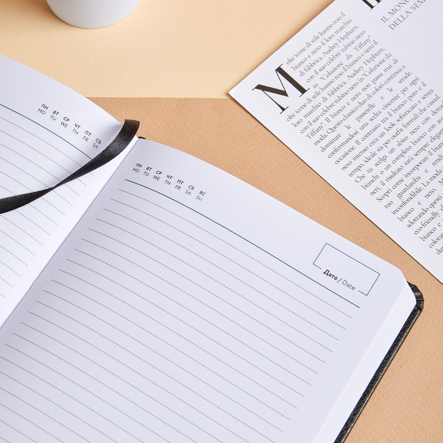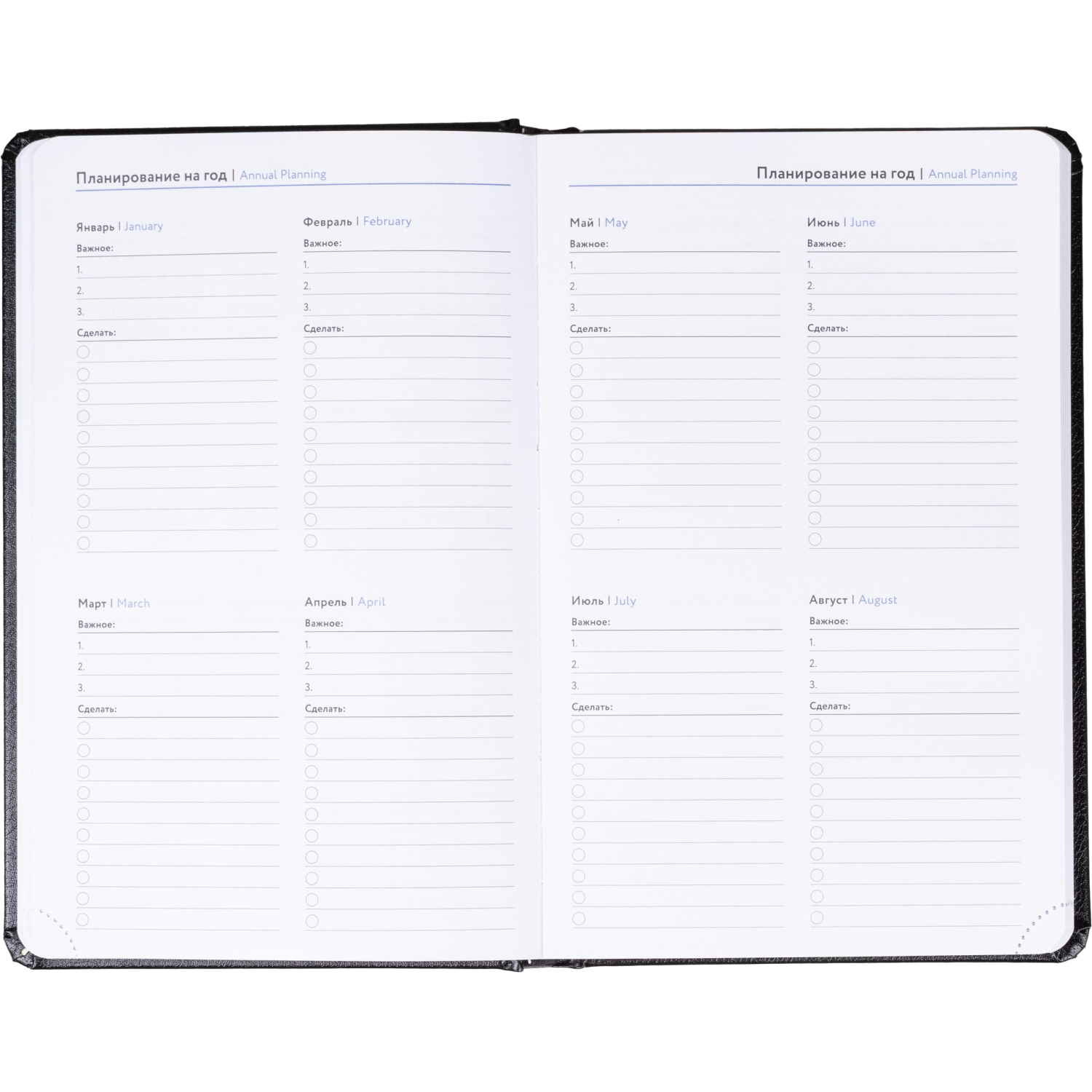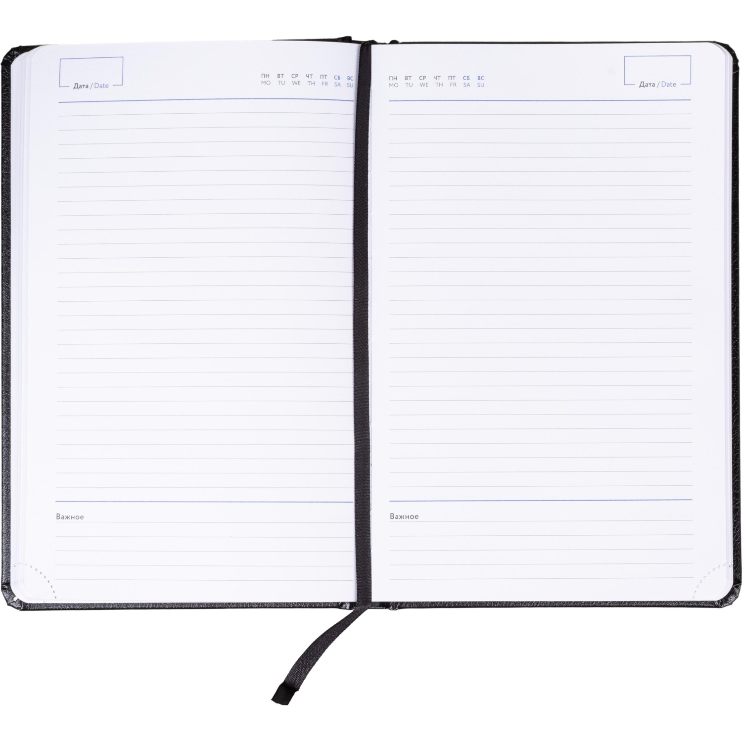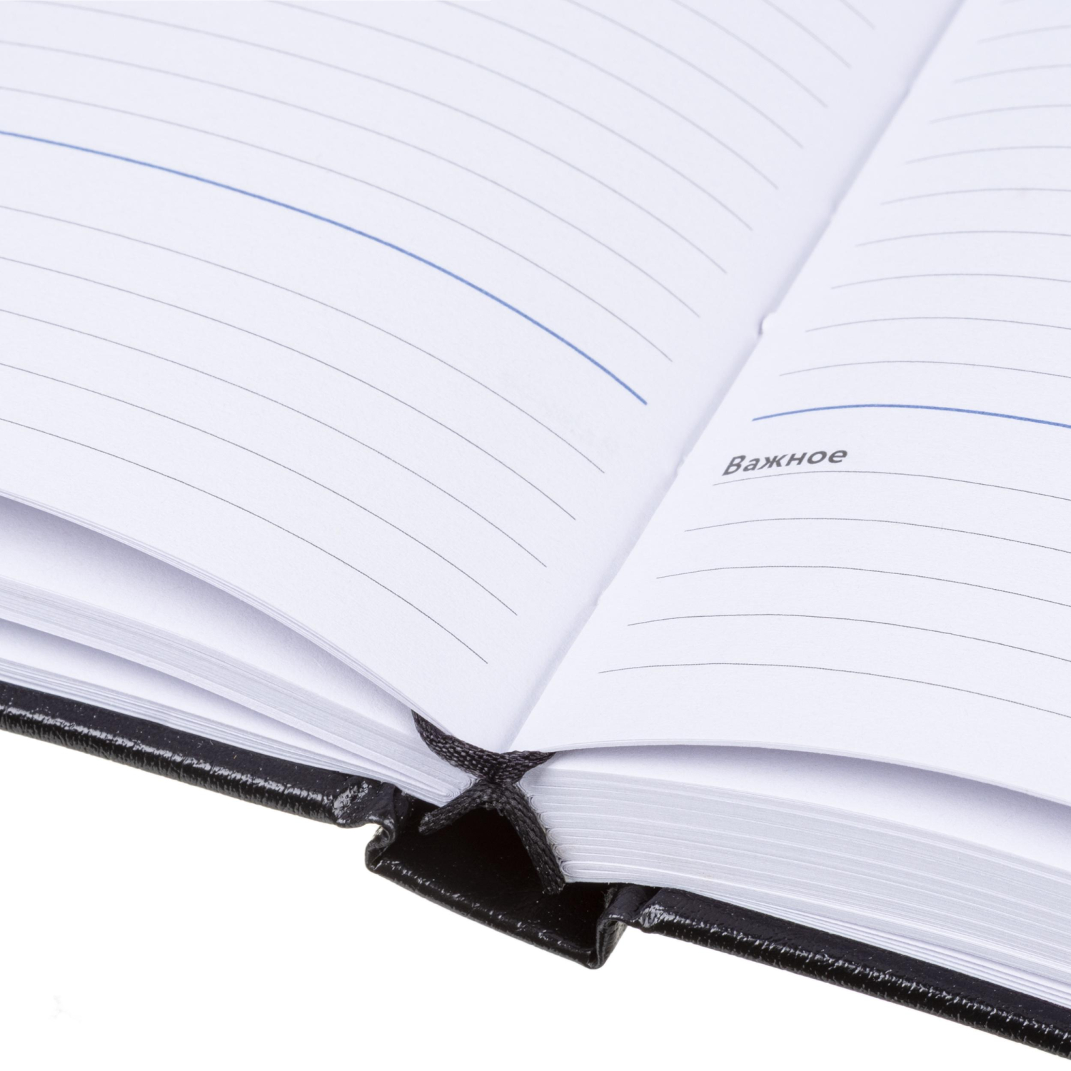 Ежедневник формата A5 предназначен для ведения записей и планирования без привязки к датам. Обложка выполнена из балакрона чёрного цвета с тиснением фольгой и оформлена в лаконичном однотонном стиле. Твёрдый переплёт сохраняет форму изделия, а сшивка блока обеспечивает надёжность при повседневном использовании.