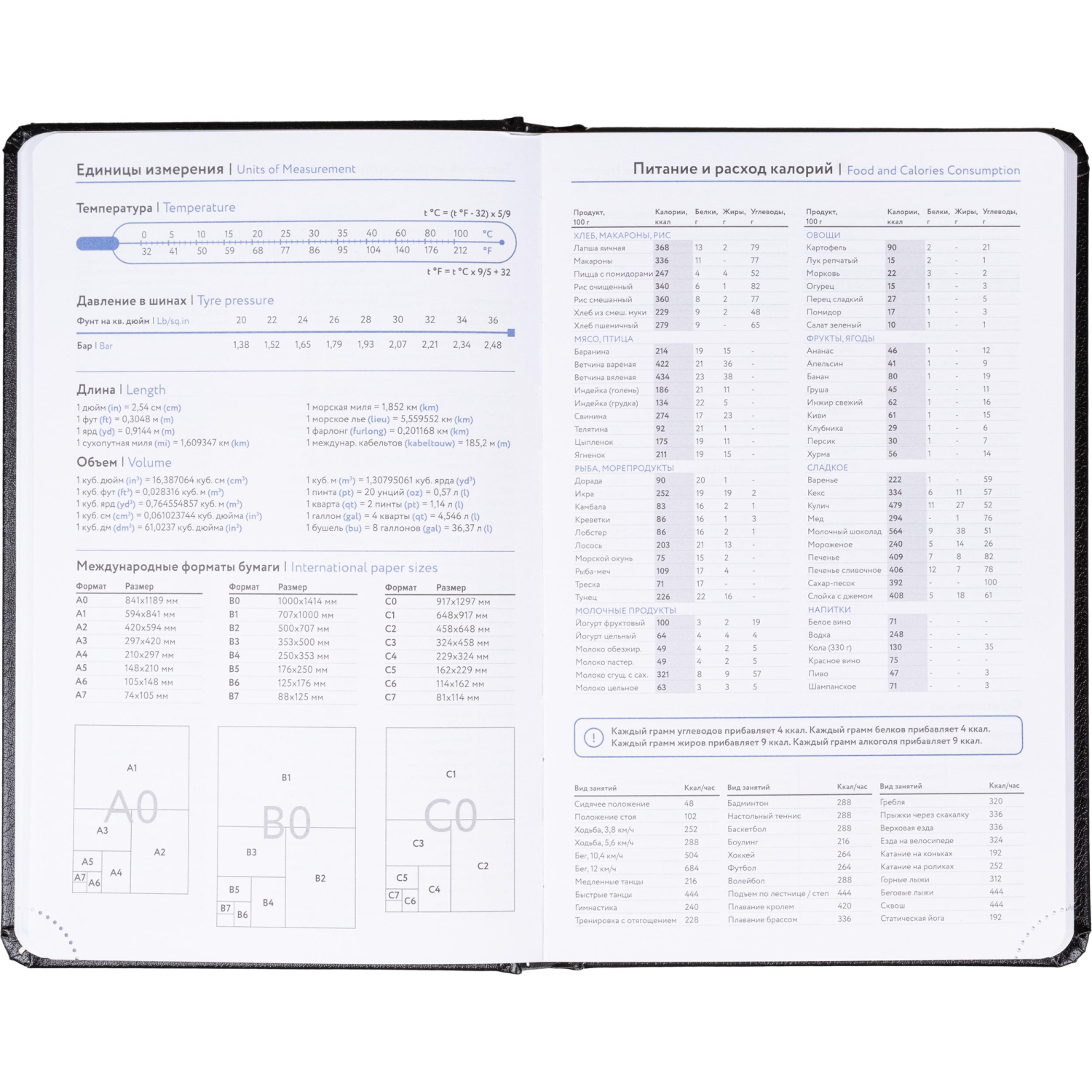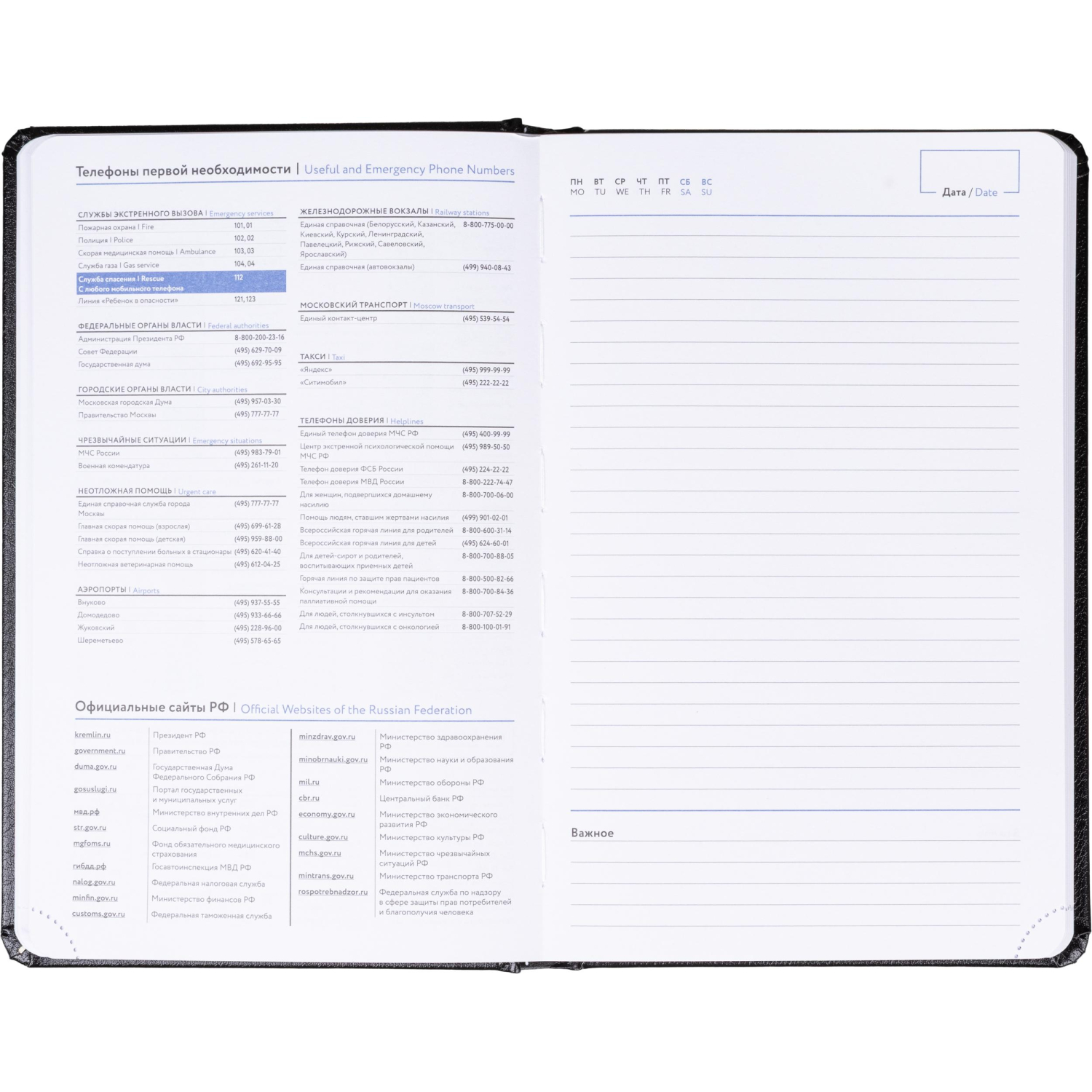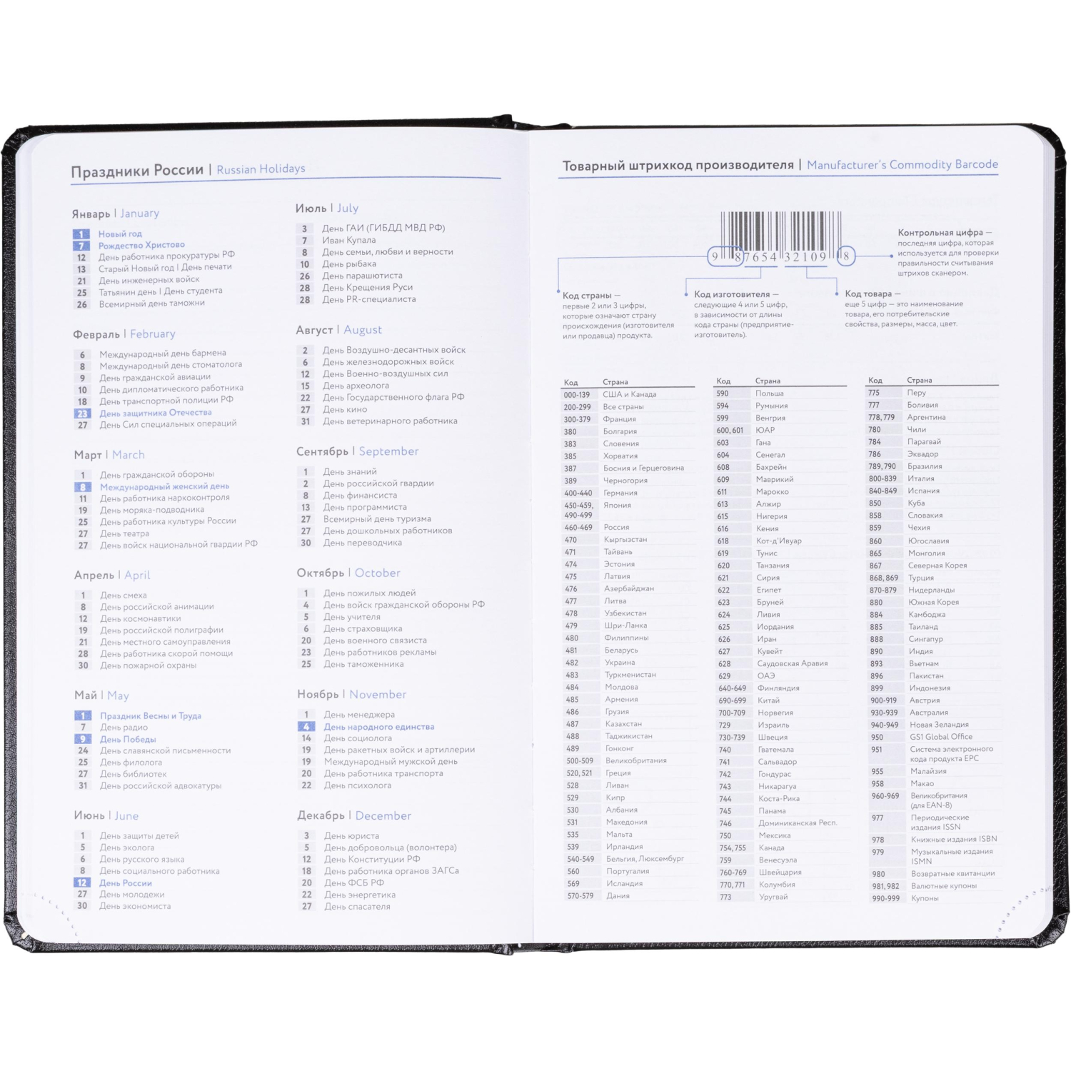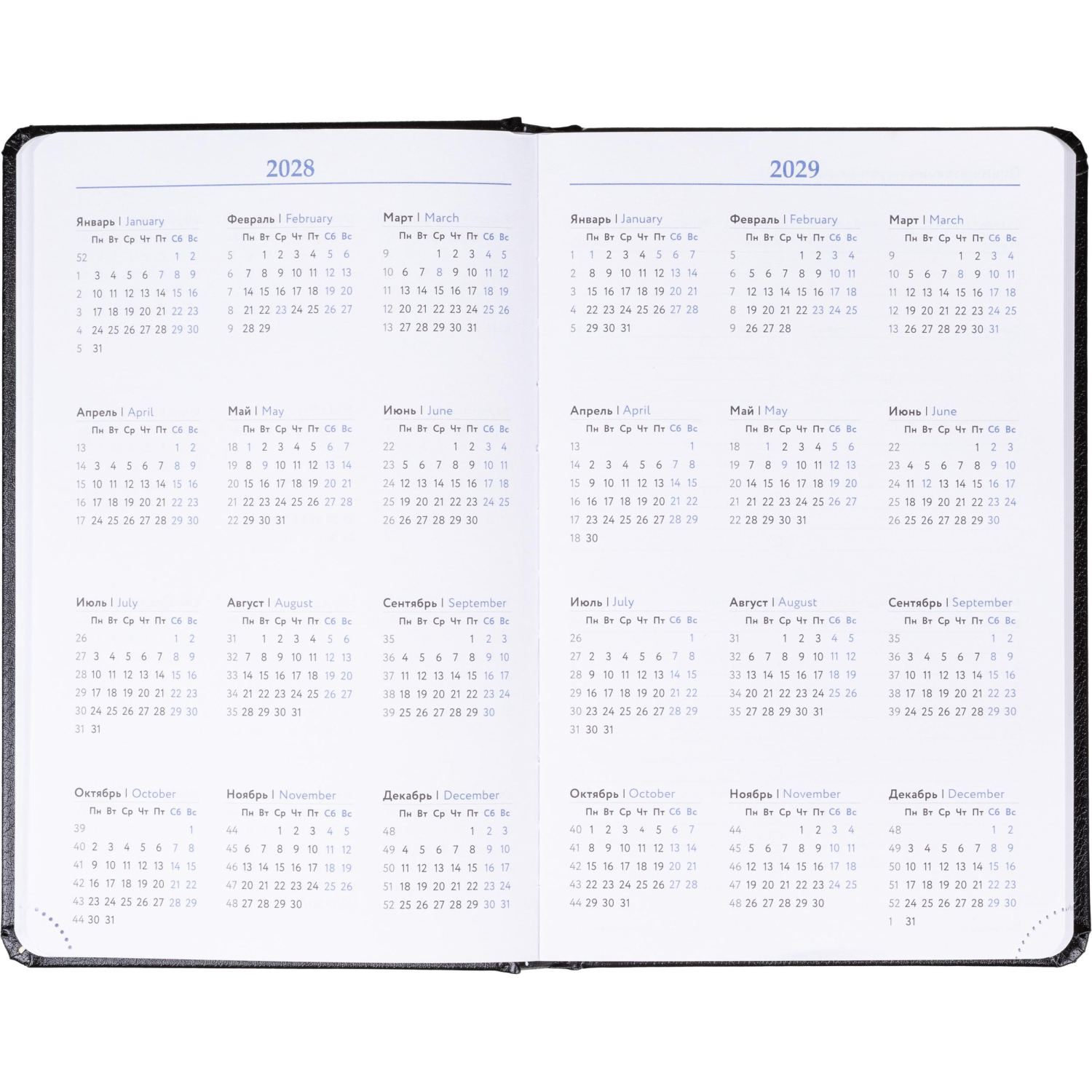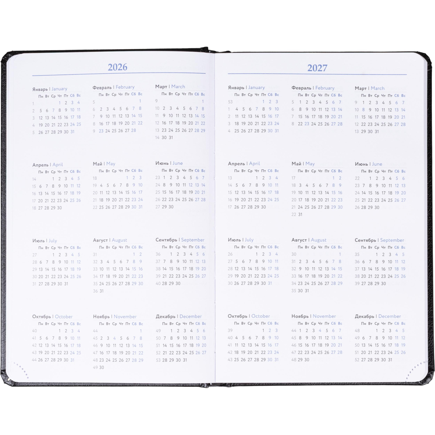 Размер изделия — 13.8×21.3 см. Внутри предусмотрен календарь на два года. Ежедневник подходит под персонализацию.