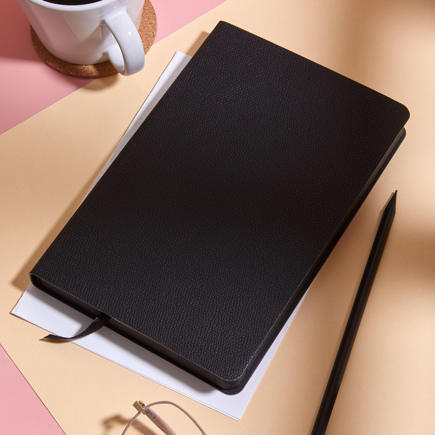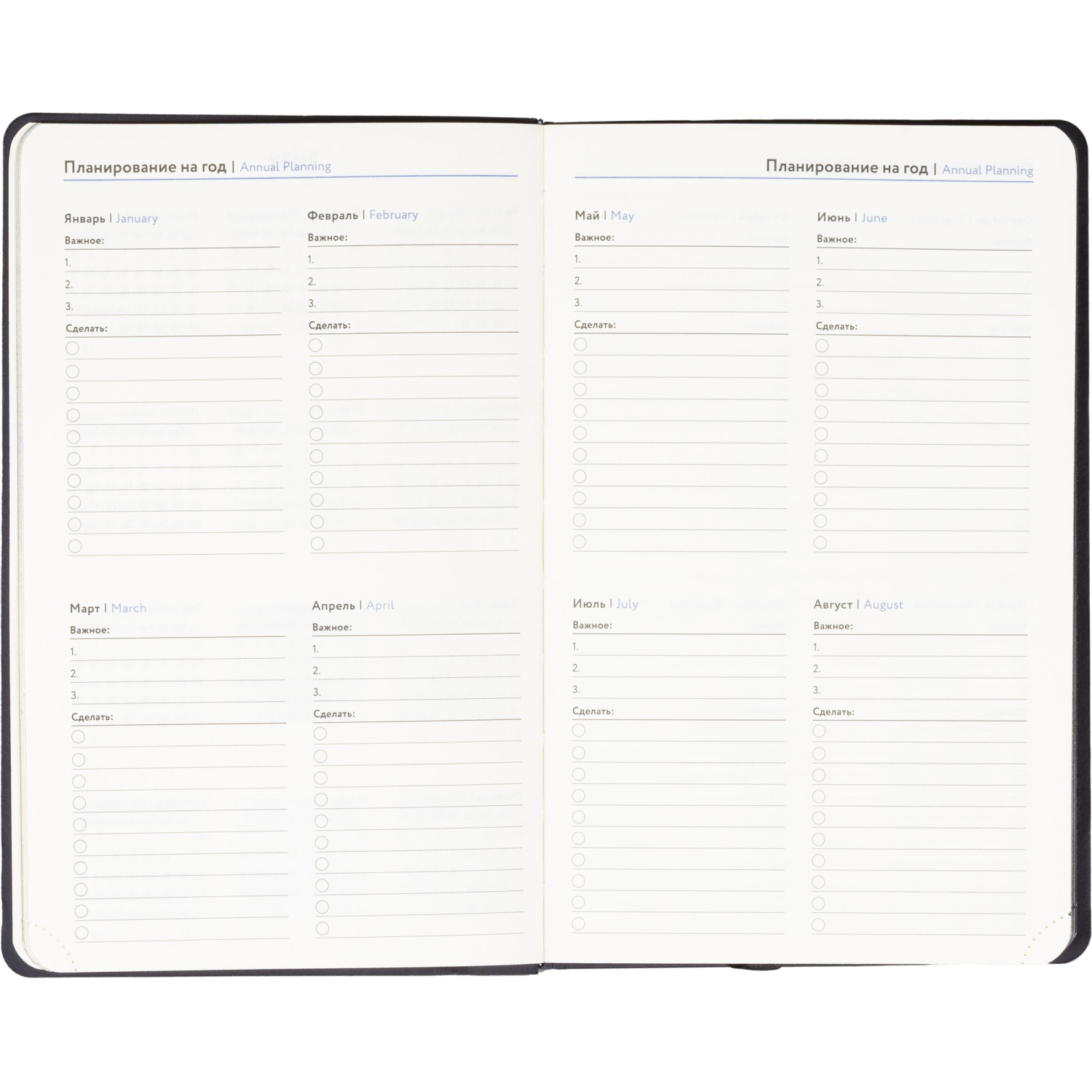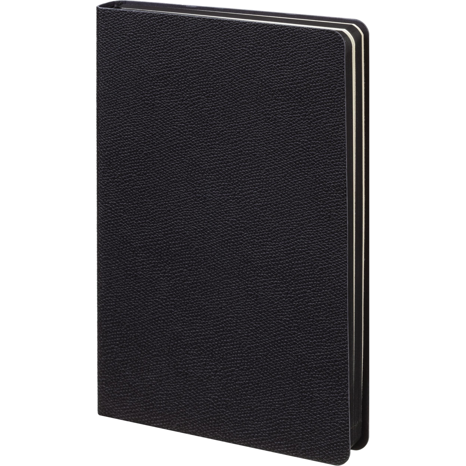 Ежедневник формата A5 предназначен для записи задач, планов и заметок без привязки к датам. Обложка выполнена из искусственной кожи чёрного цвета с тиснением и оформлена в однотонном стиле. Мягкий переплёт делает изделие удобным для повседневного использования, а сшивка блока обеспечивает его надёжность.