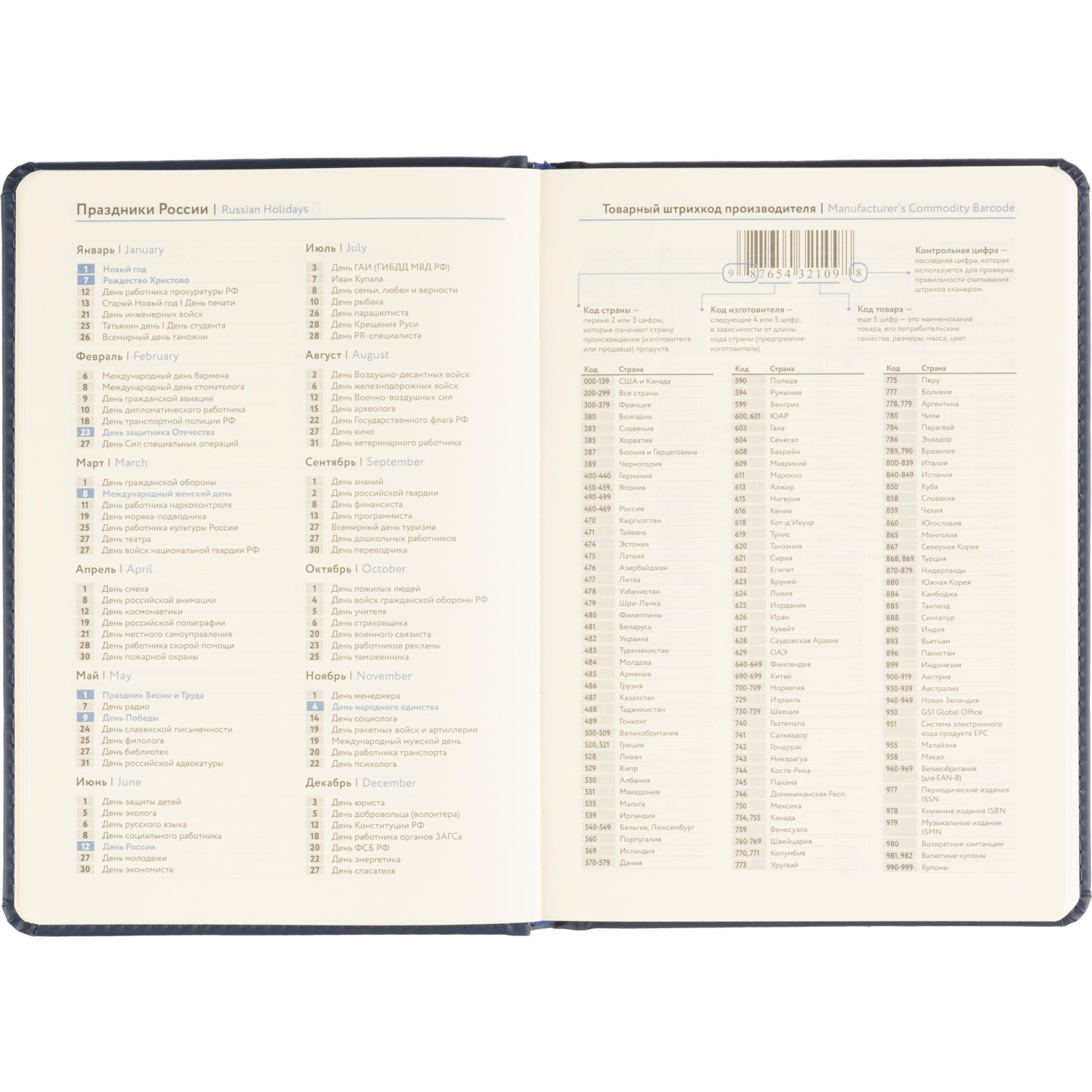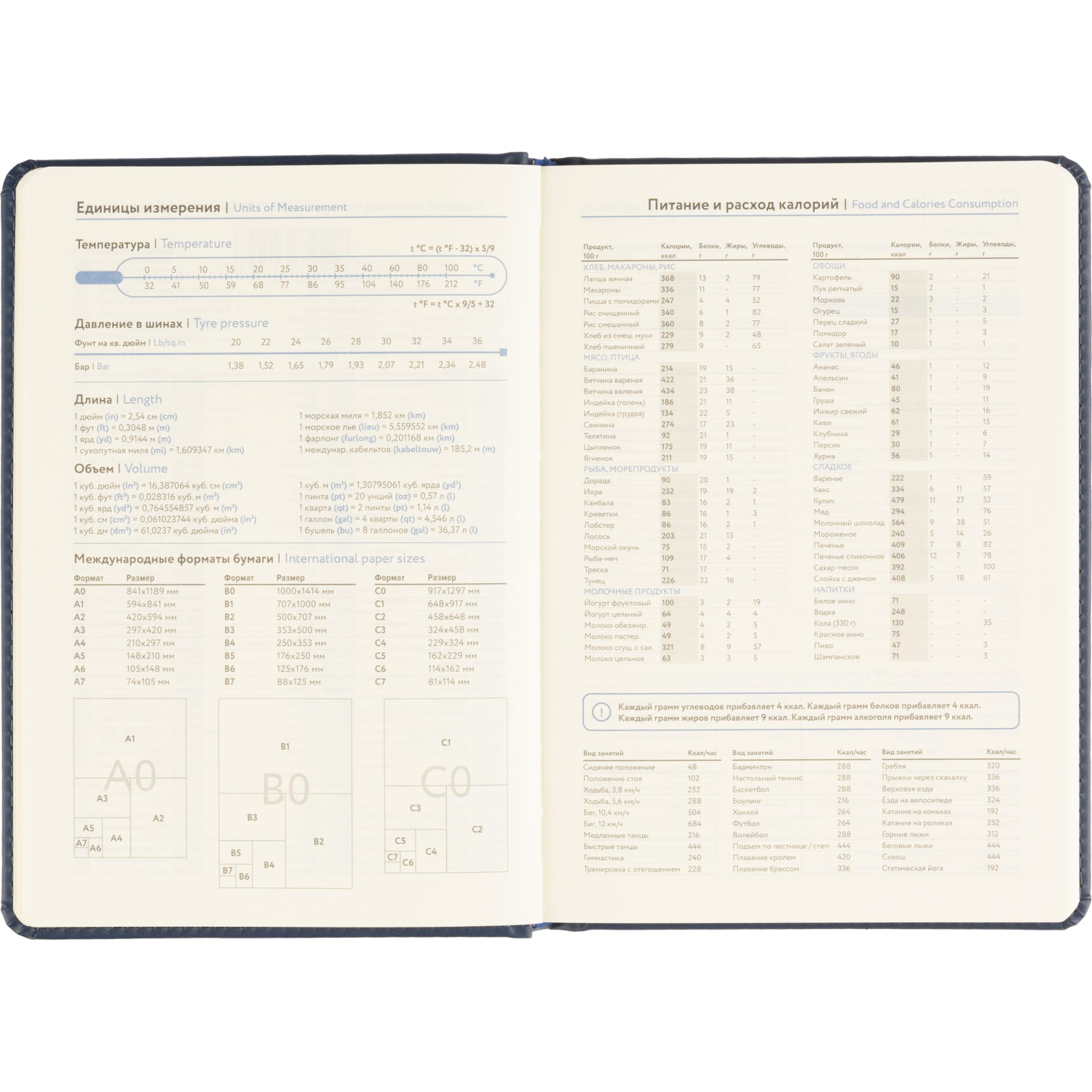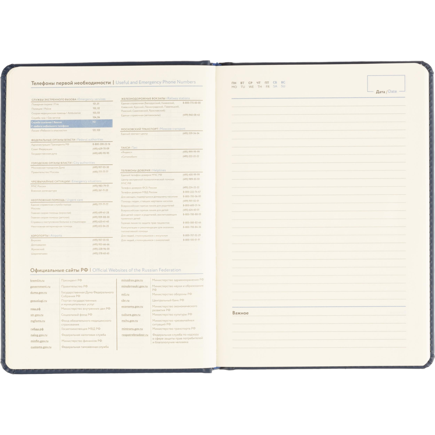 Обложка из искусственной кожи синего цвета украшена тиснением и дополнена аккуратной прострочкой по периметру. Жёсткий переплёт и надёжная сшивка блока обеспечивают устойчивость к ежедневному использованию. Скруглённые углы листов и вырубка делают перелистывание удобным, а встроенное ляссе помогает быстро находить нужную страницу.