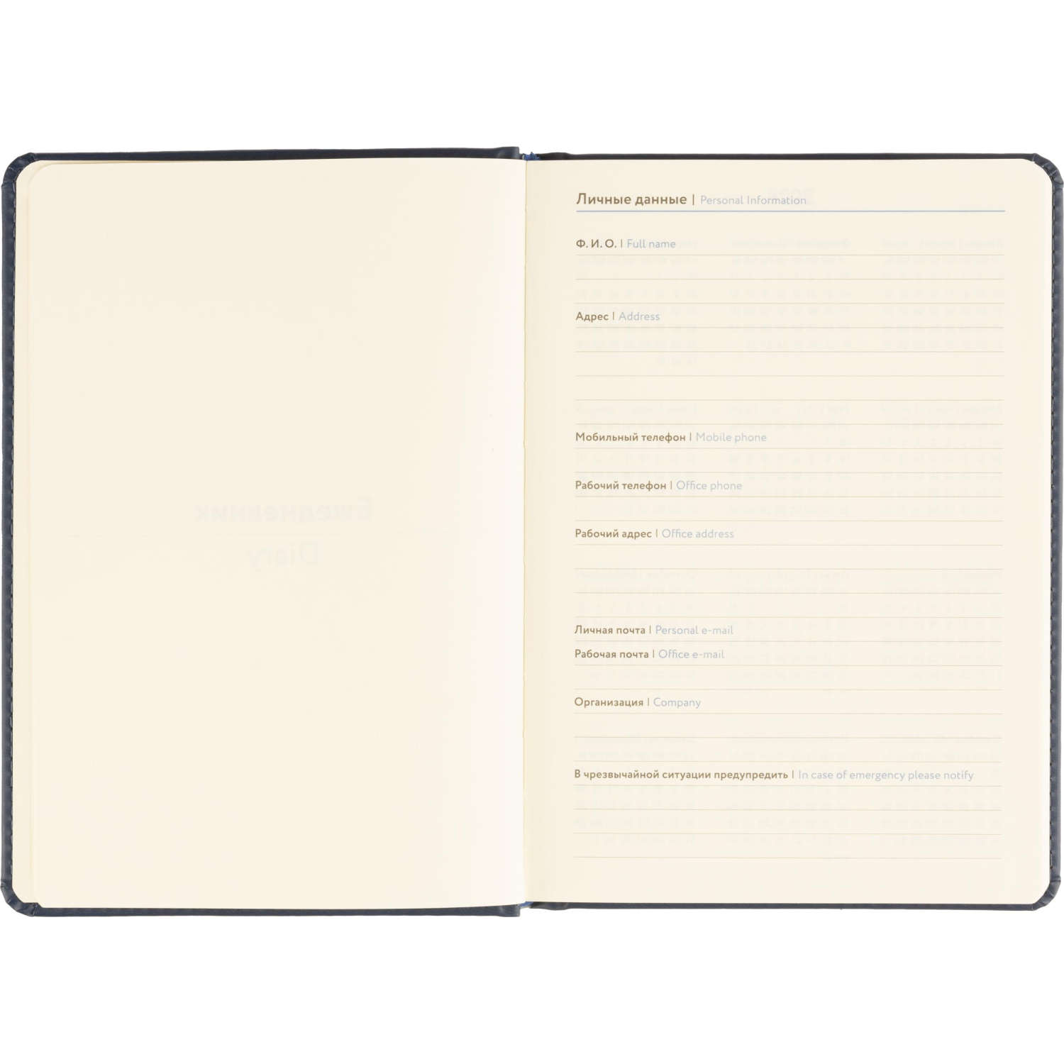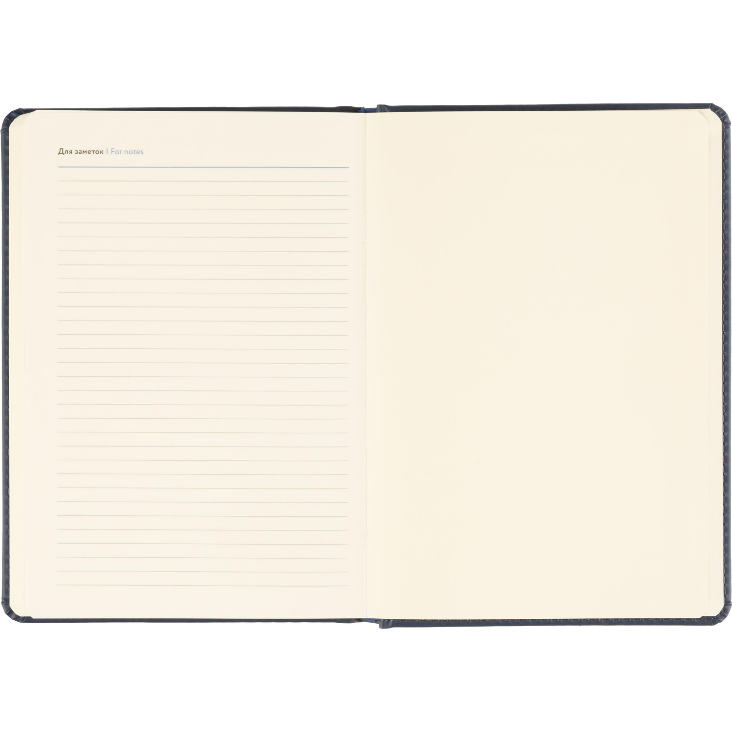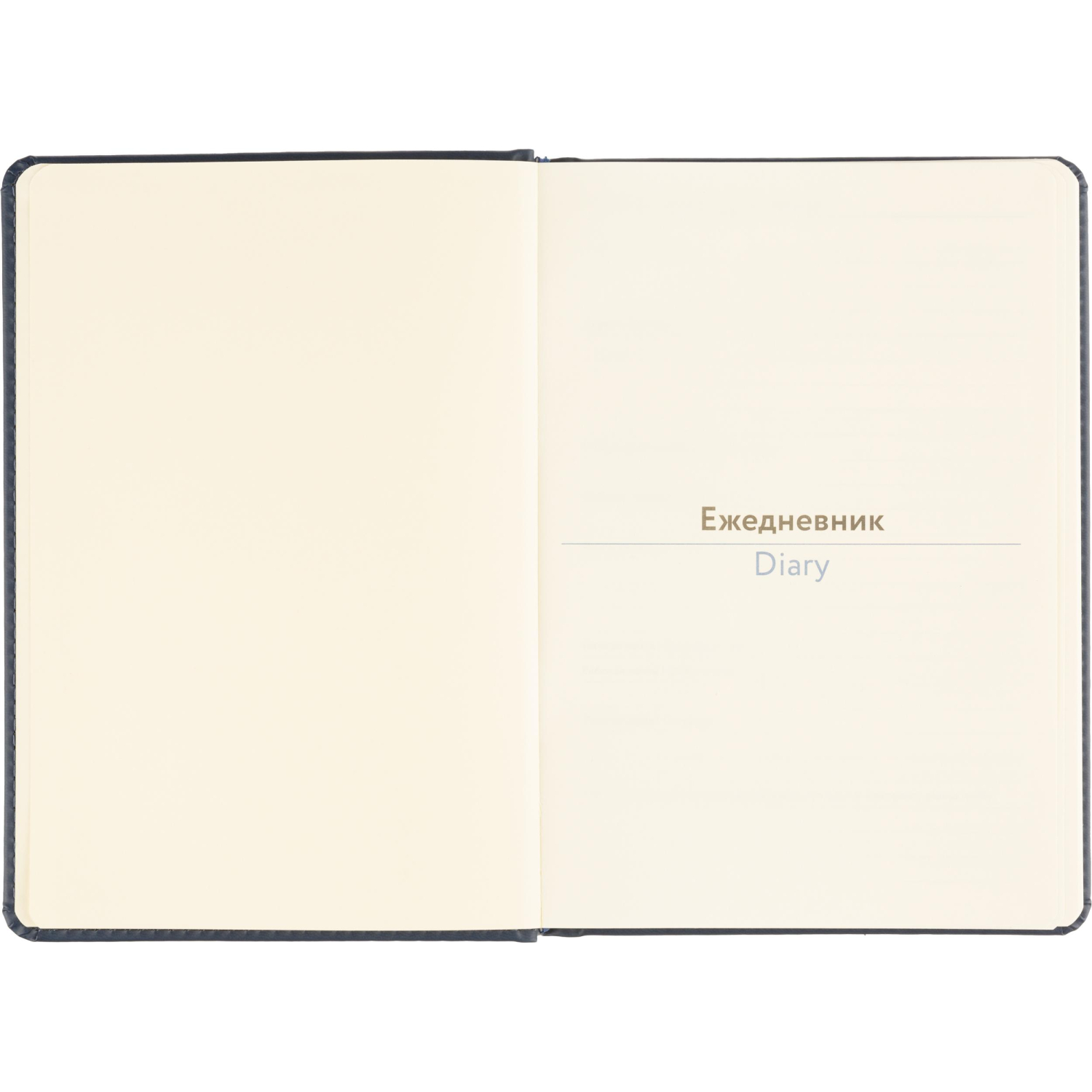 Обложка из искусственной кожи синего цвета украшена тиснением и дополнена аккуратной прострочкой по периметру. Жёсткий переплёт и надёжная сшивка блока обеспечивают устойчивость к ежедневному использованию. Скруглённые углы листов и вырубка делают перелистывание удобным, а встроенное ляссе помогает быстро находить нужную страницу.