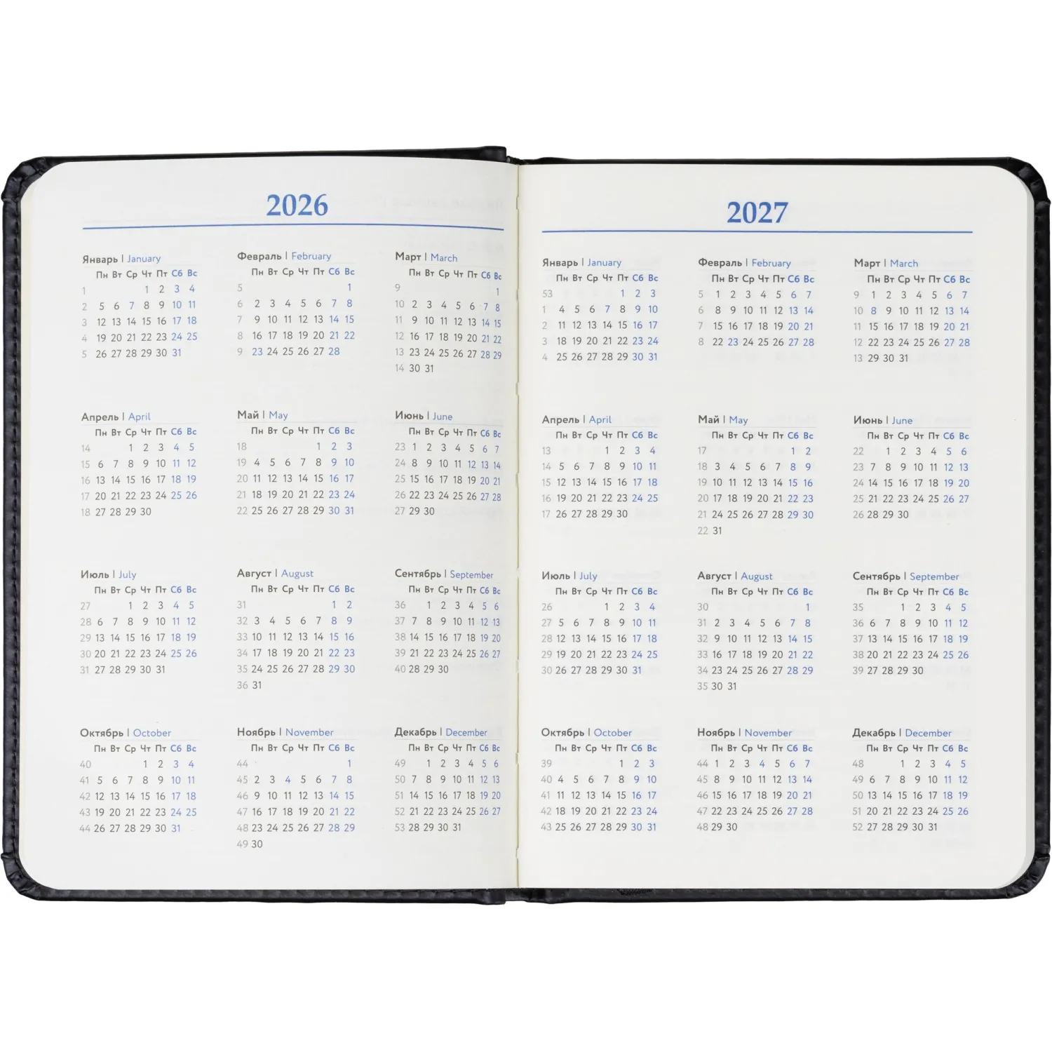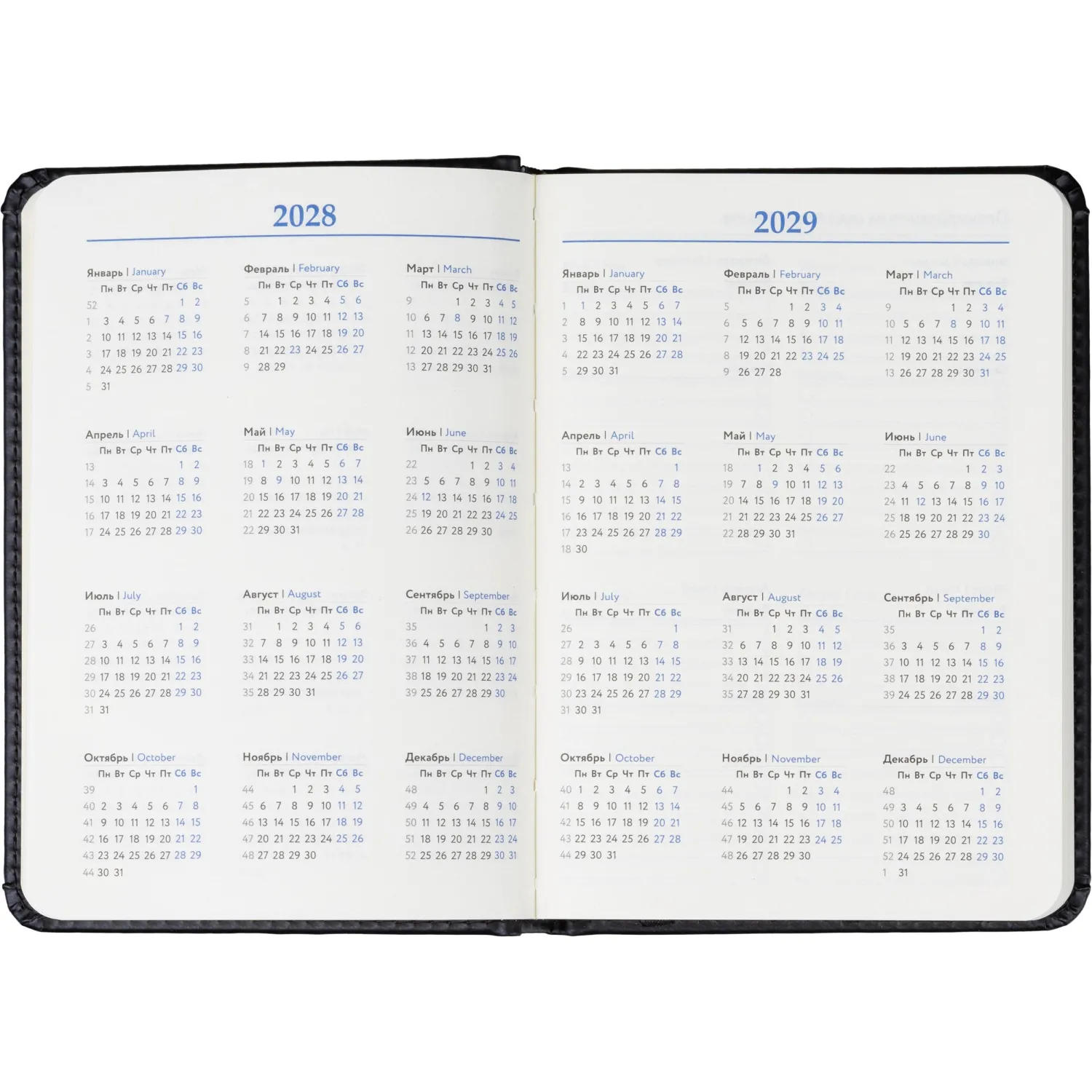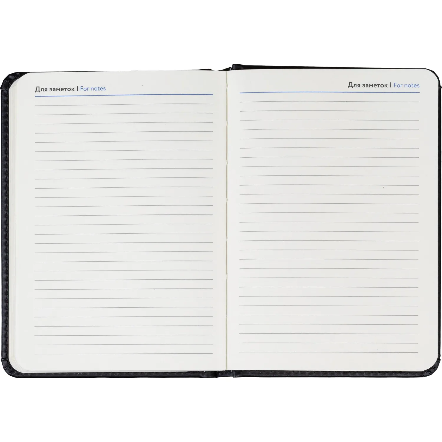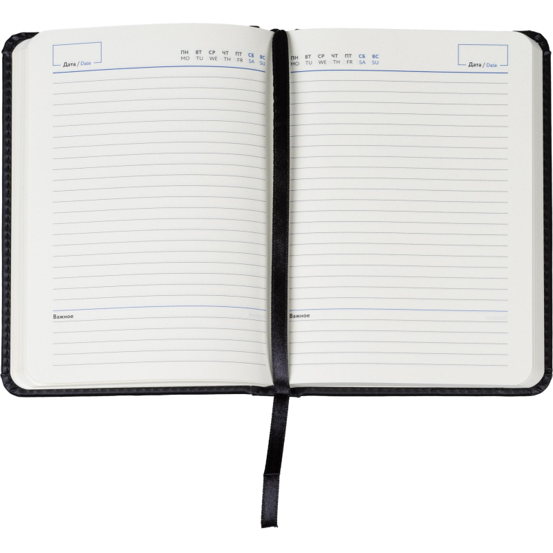 Обложка изготовлена из чёрной искусственной кожи с тиснением и прострочкой по периметру. Твёрдый переплёт на сшивке обеспечивает долговечность, а скруглённые углы и вырубка блока делают ежедневник удобным в использовании. Встроенное ляссе позволяет быстро находить нужную страницу. Внутри расположен календарь на два года. Изделие подходит для персонализации.