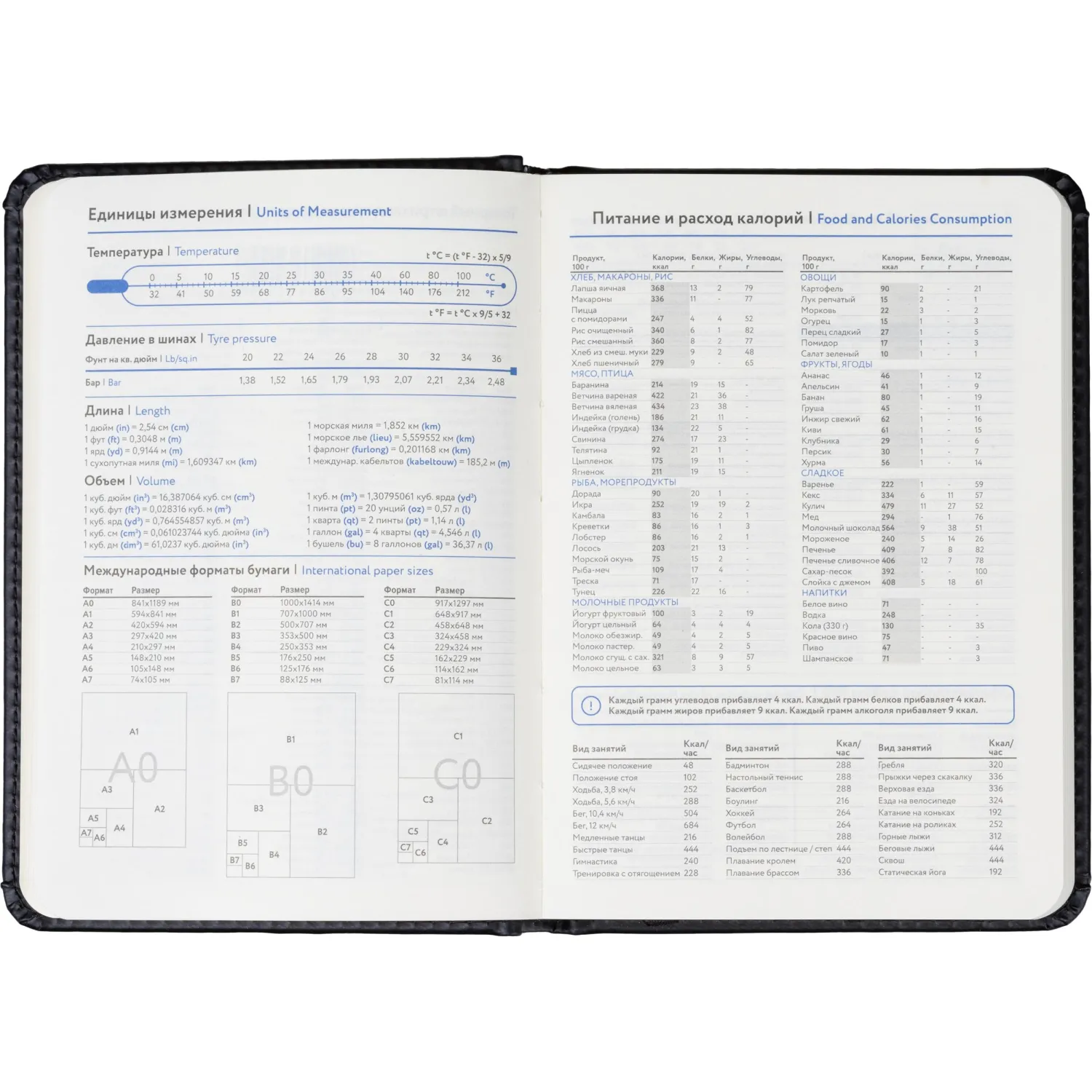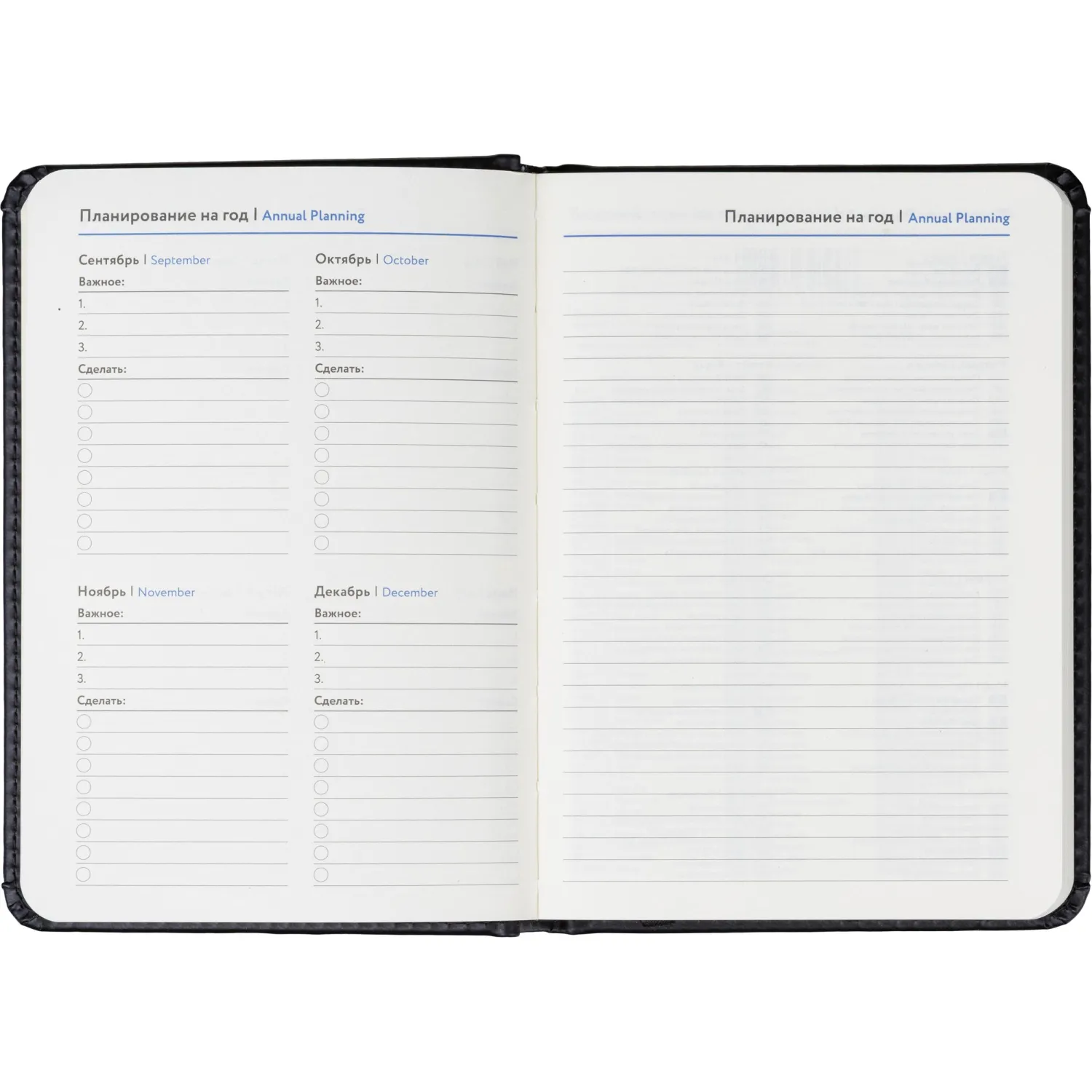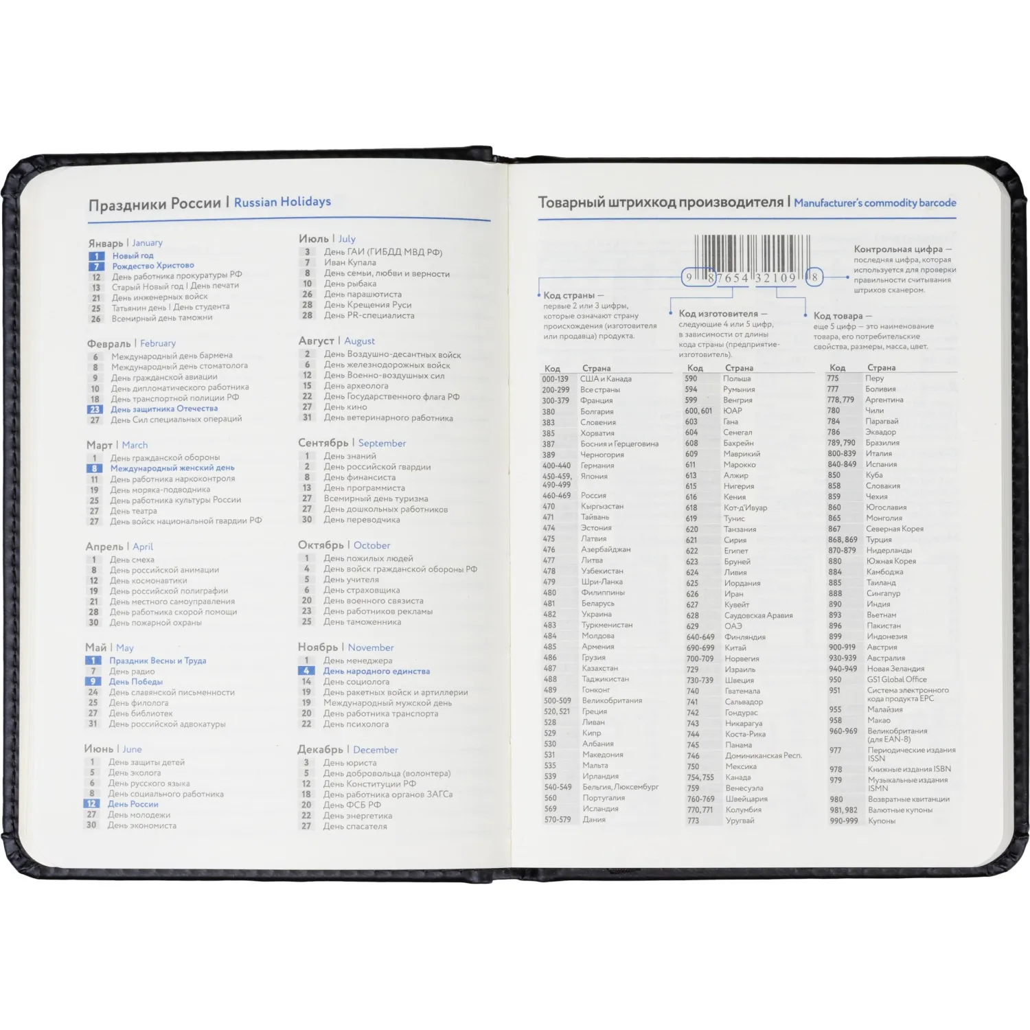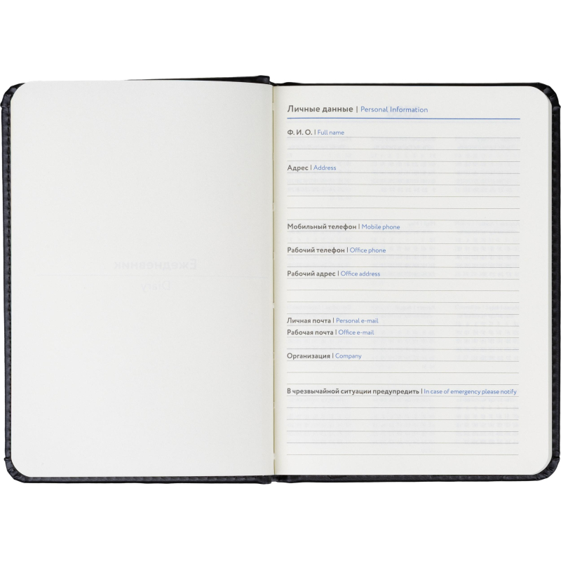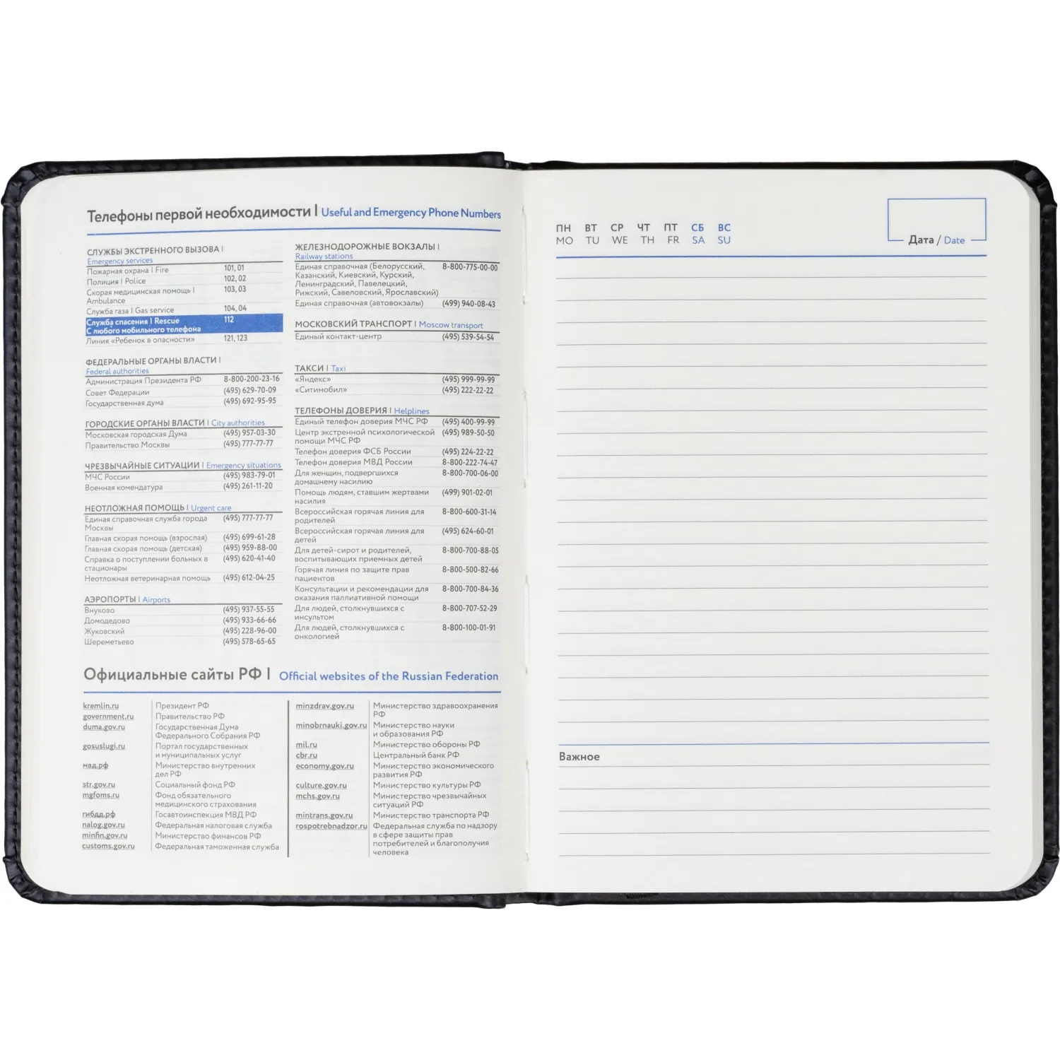 Обложка изготовлена из чёрной искусственной кожи с тиснением и прострочкой по периметру. Твёрдый переплёт на сшивке обеспечивает долговечность, а скруглённые углы и вырубка блока делают ежедневник удобным в использовании. Встроенное ляссе позволяет быстро находить нужную страницу. Внутри расположен календарь на два года. Изделие подходит для персонализации.