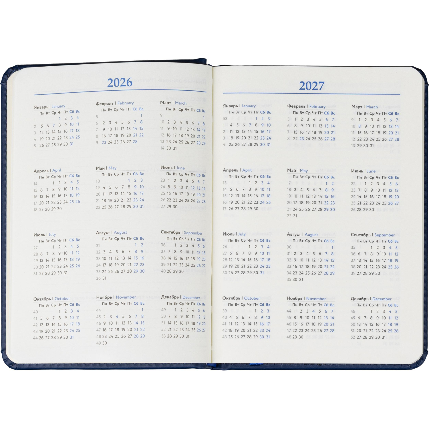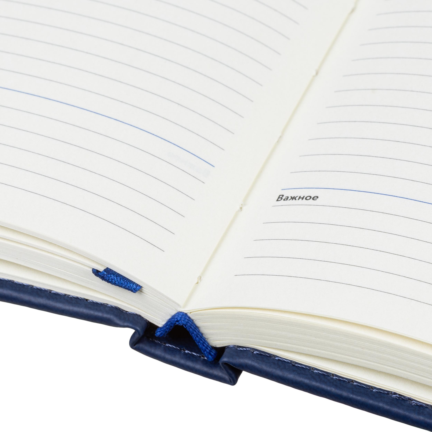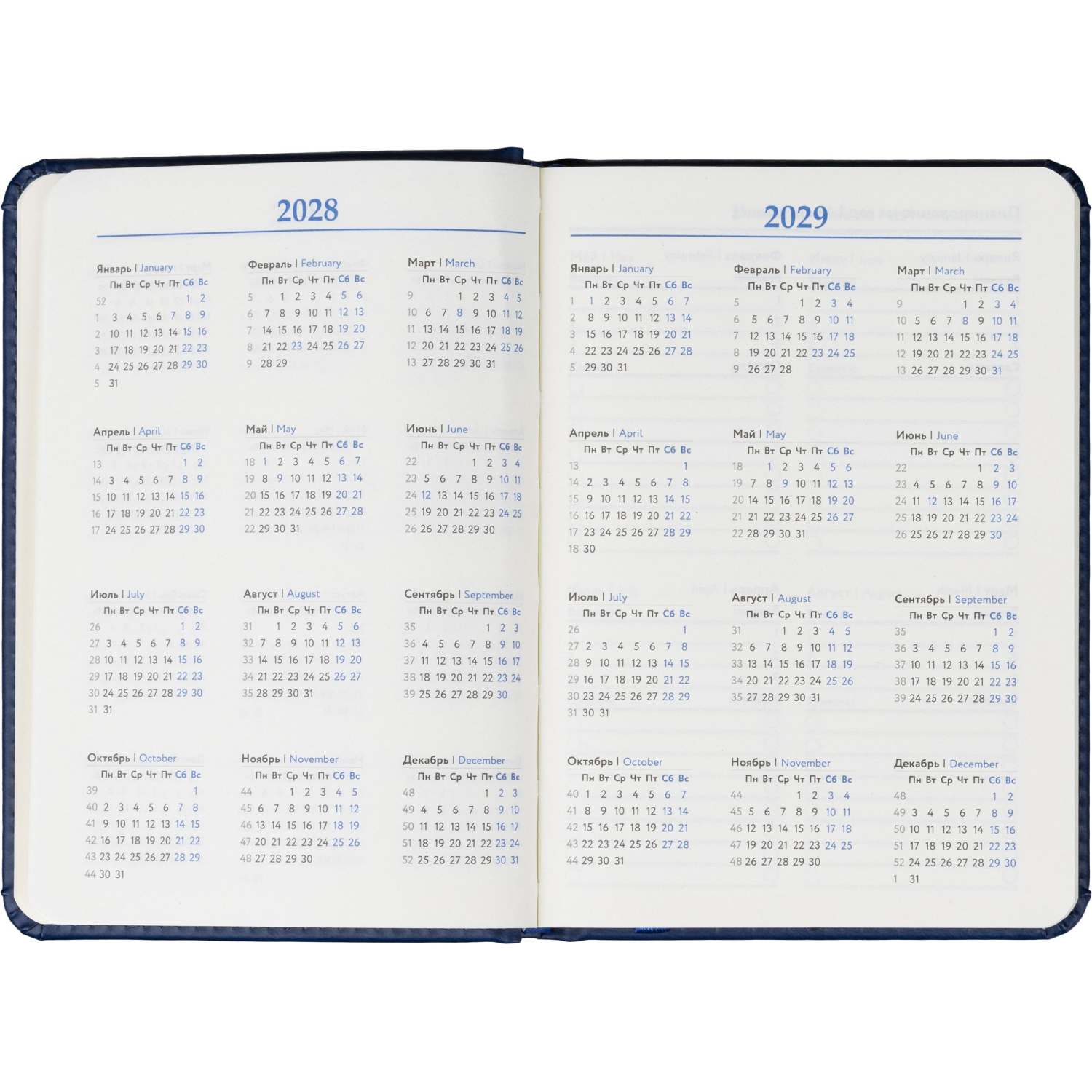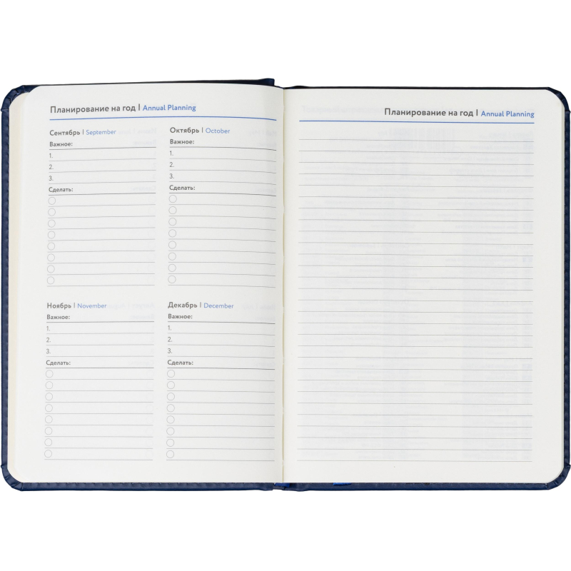 Обложка выполнена из искусственной кожи синего цвета, украшена тиснением и прошита по периметру, благодаря чему изделие выглядит аккуратно и выдержанно. Скруглённые углы листов и вырубка блока повышают комфорт при использовании. Ежедневник дополнен ляссе и календарём на два года. Крепление блока — сшивка, обеспечивающая надёжность при частом открывании.