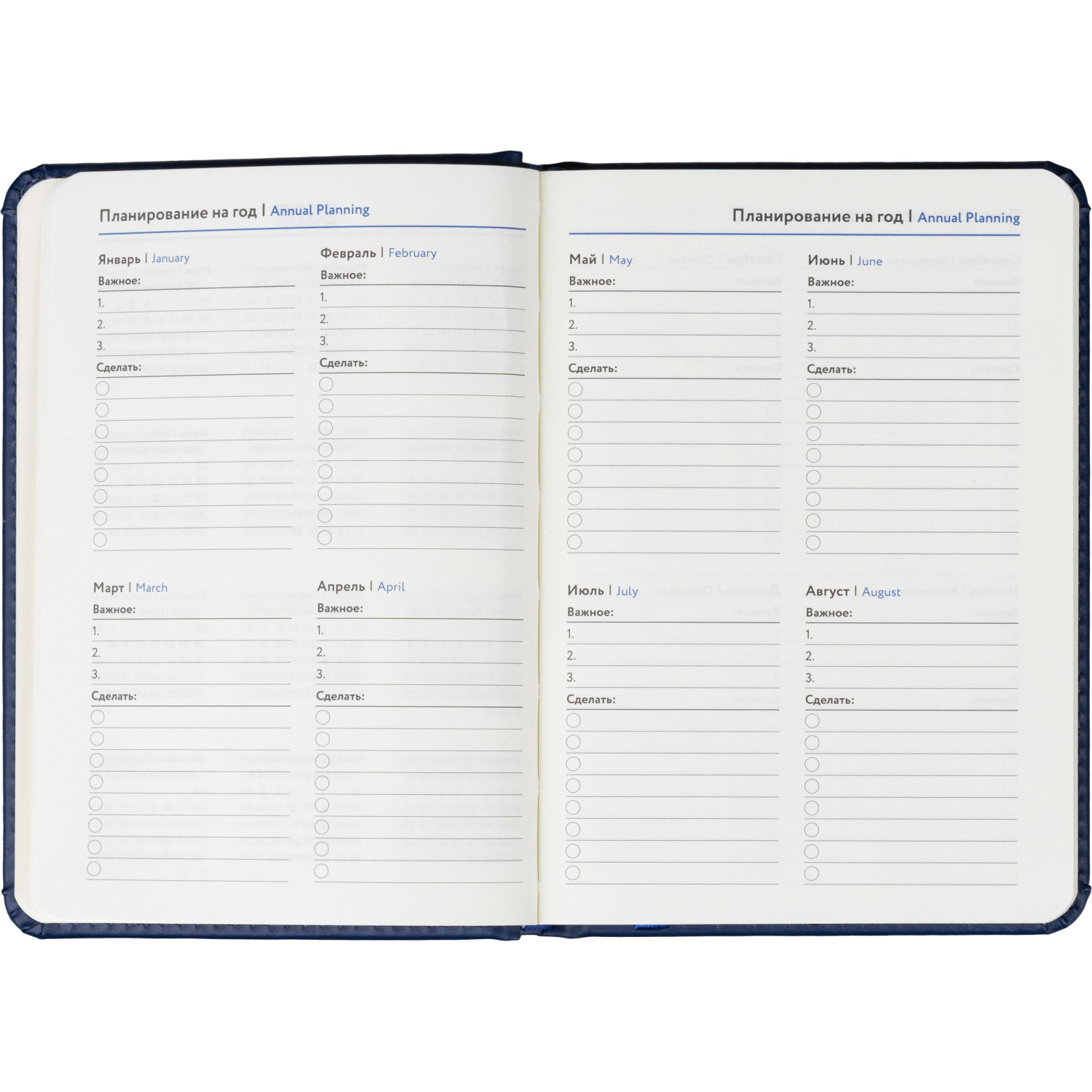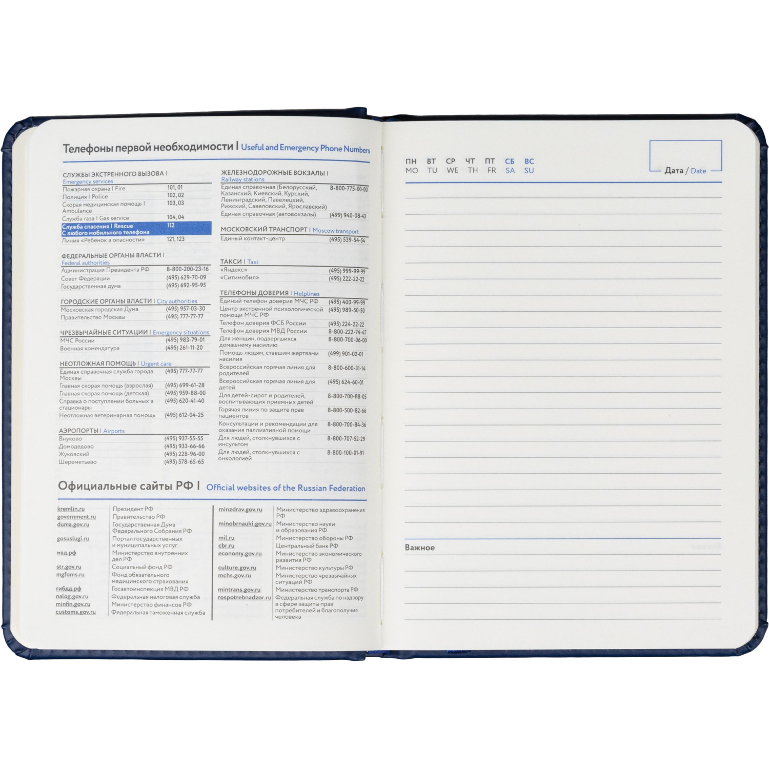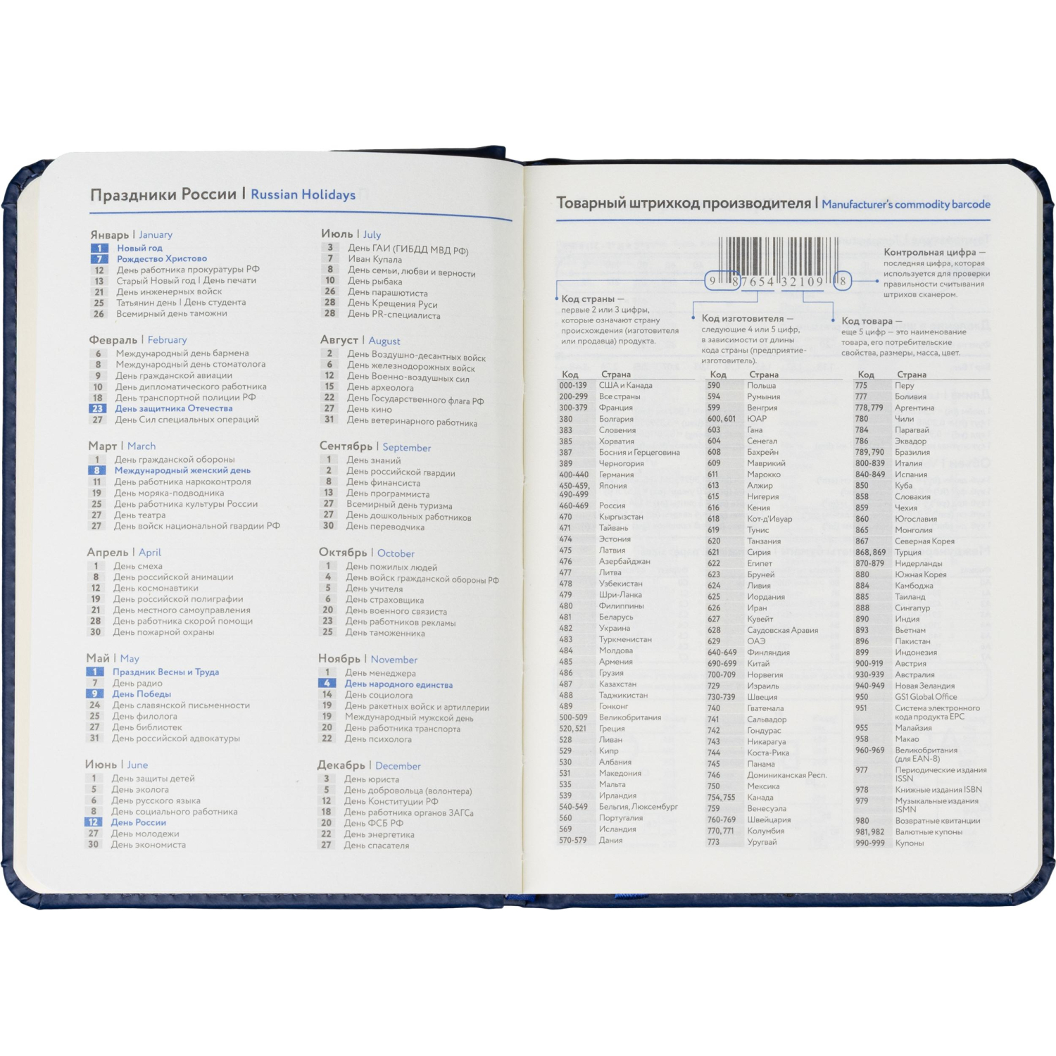 Обложка выполнена из искусственной кожи синего цвета, украшена тиснением и прошита по периметру, благодаря чему изделие выглядит аккуратно и выдержанно. Скруглённые углы листов и вырубка блока повышают комфорт при использовании. Ежедневник дополнен ляссе и календарём на два года. Крепление блока — сшивка, обеспечивающая надёжность при частом открывании.