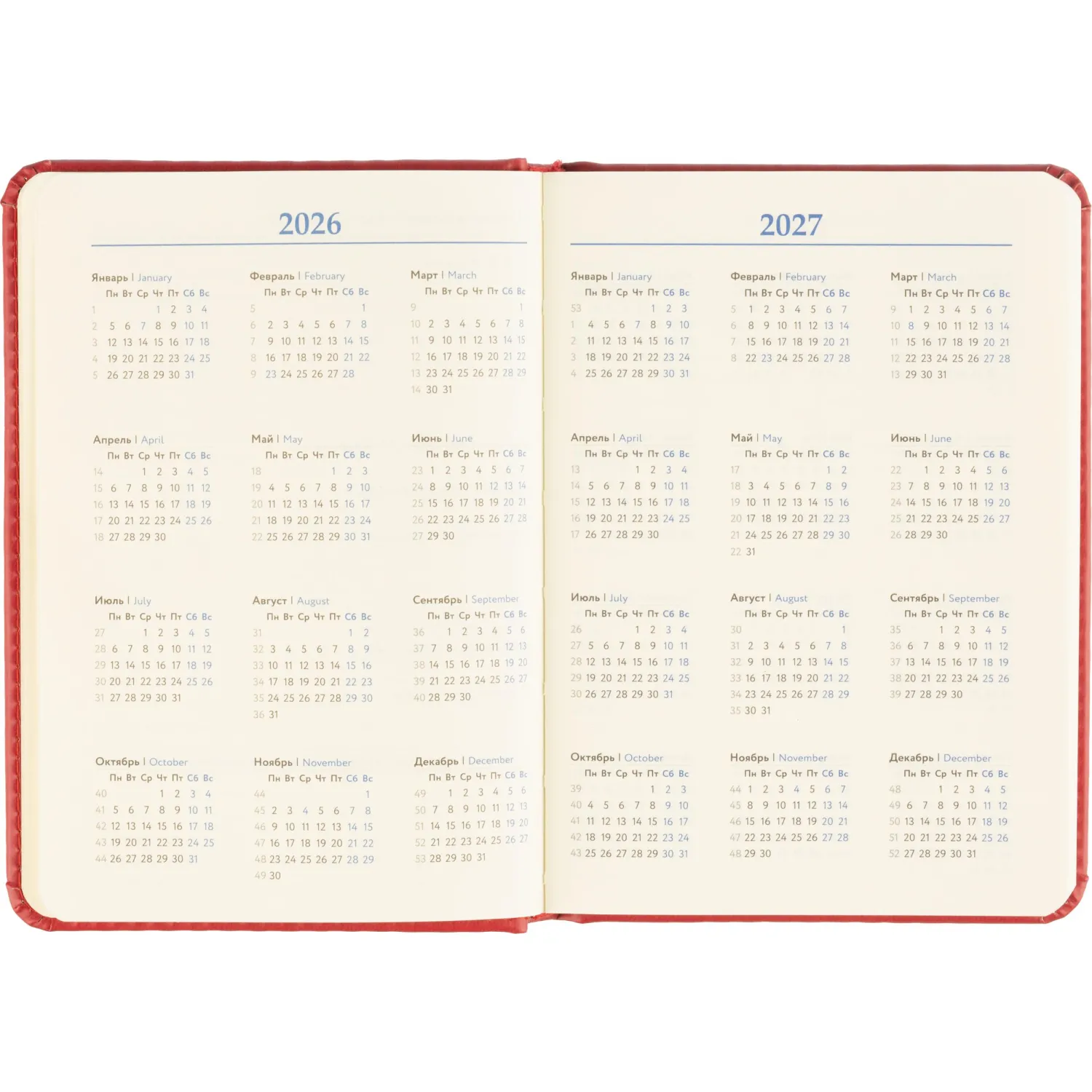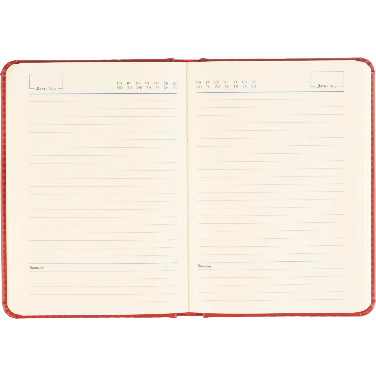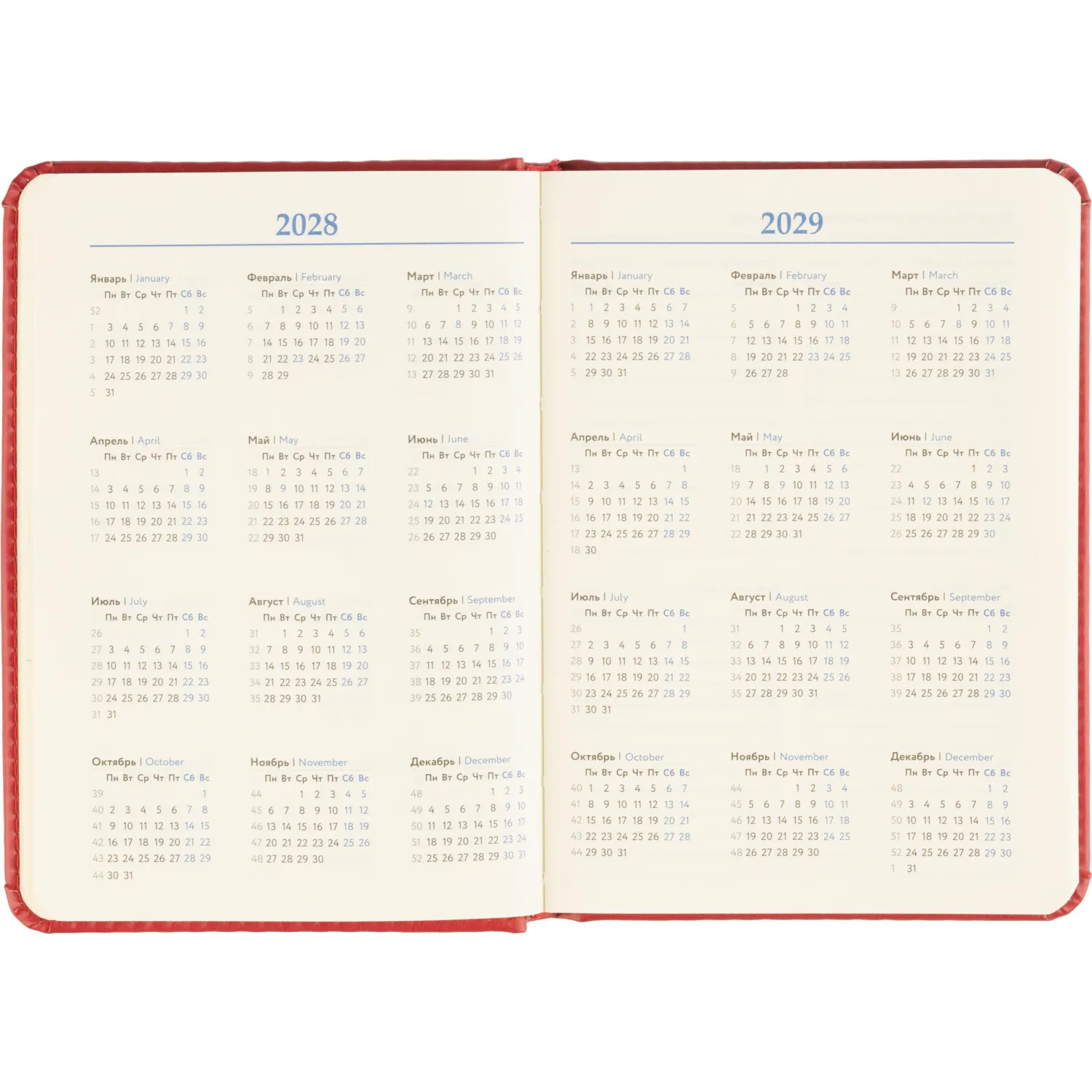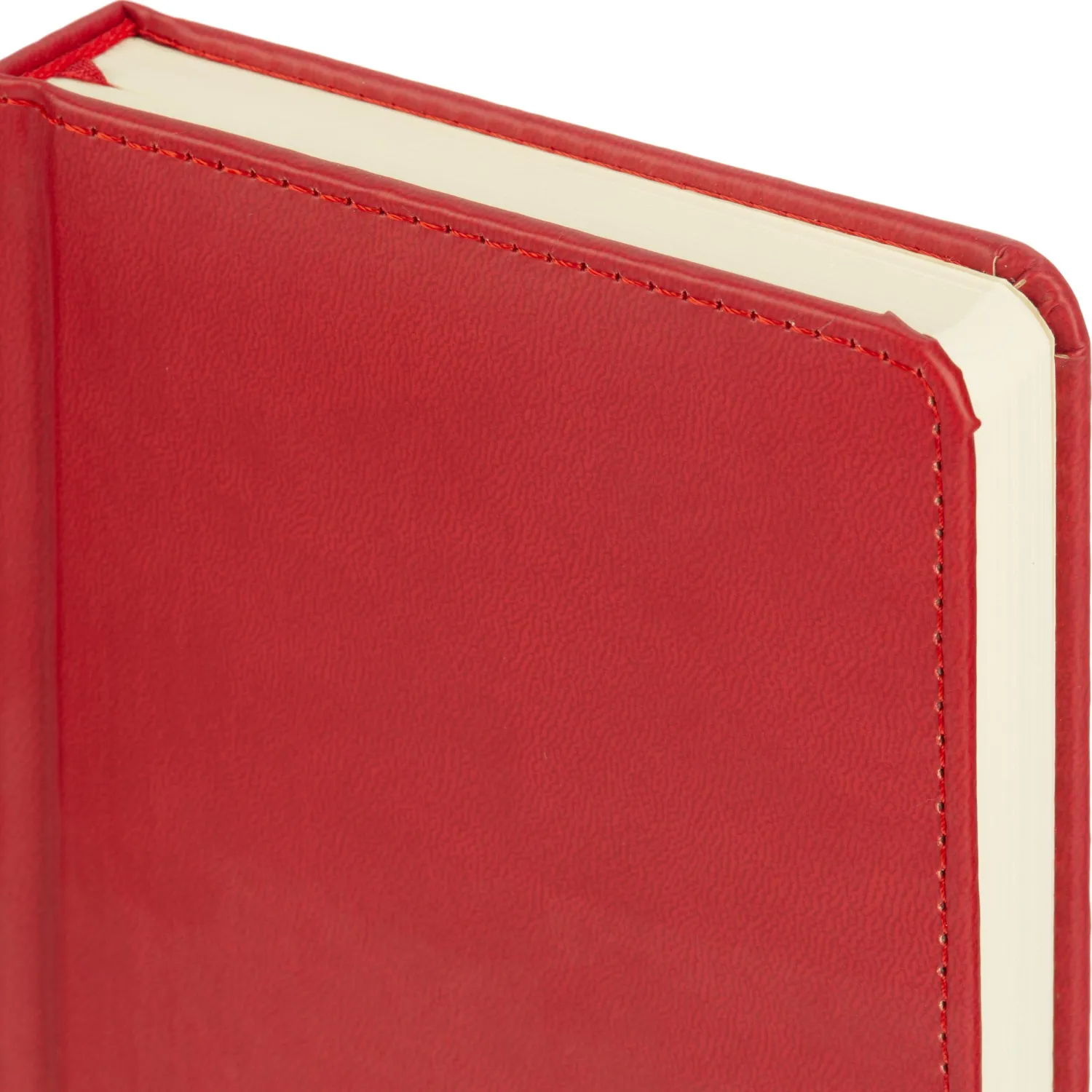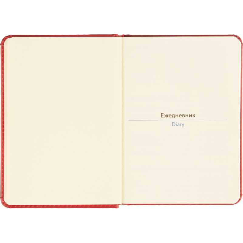 Обложка выполнена из красной искусственной кожи с тиснением и прострочкой по периметру. Твёрдая конструкция и сшивной переплёт обеспечивают надёжность и долговечность. Скруглённые углы листов и вырубка блока делают использование комфортным. Ежедневник оснащён ляссе и содержит календарь на два года. Подходит под персонализацию.