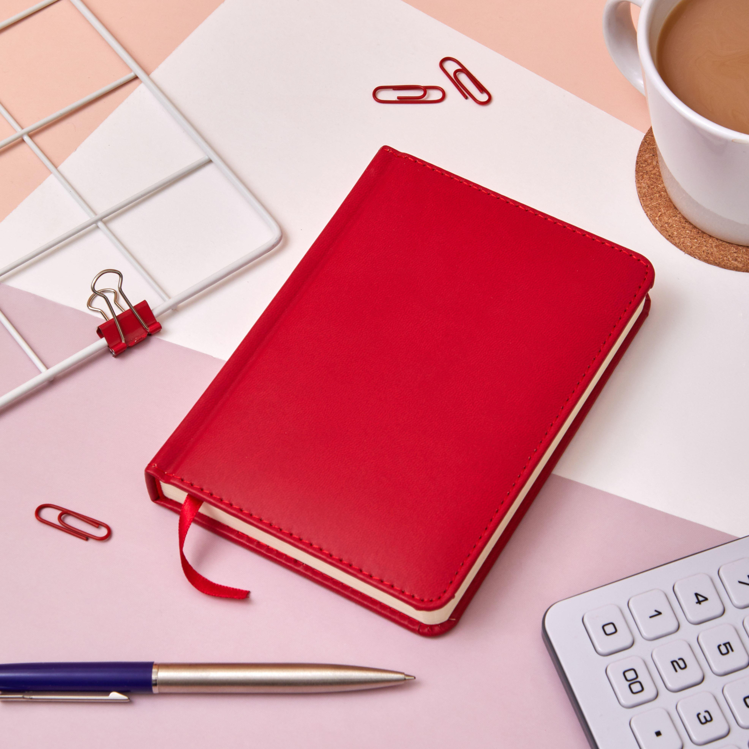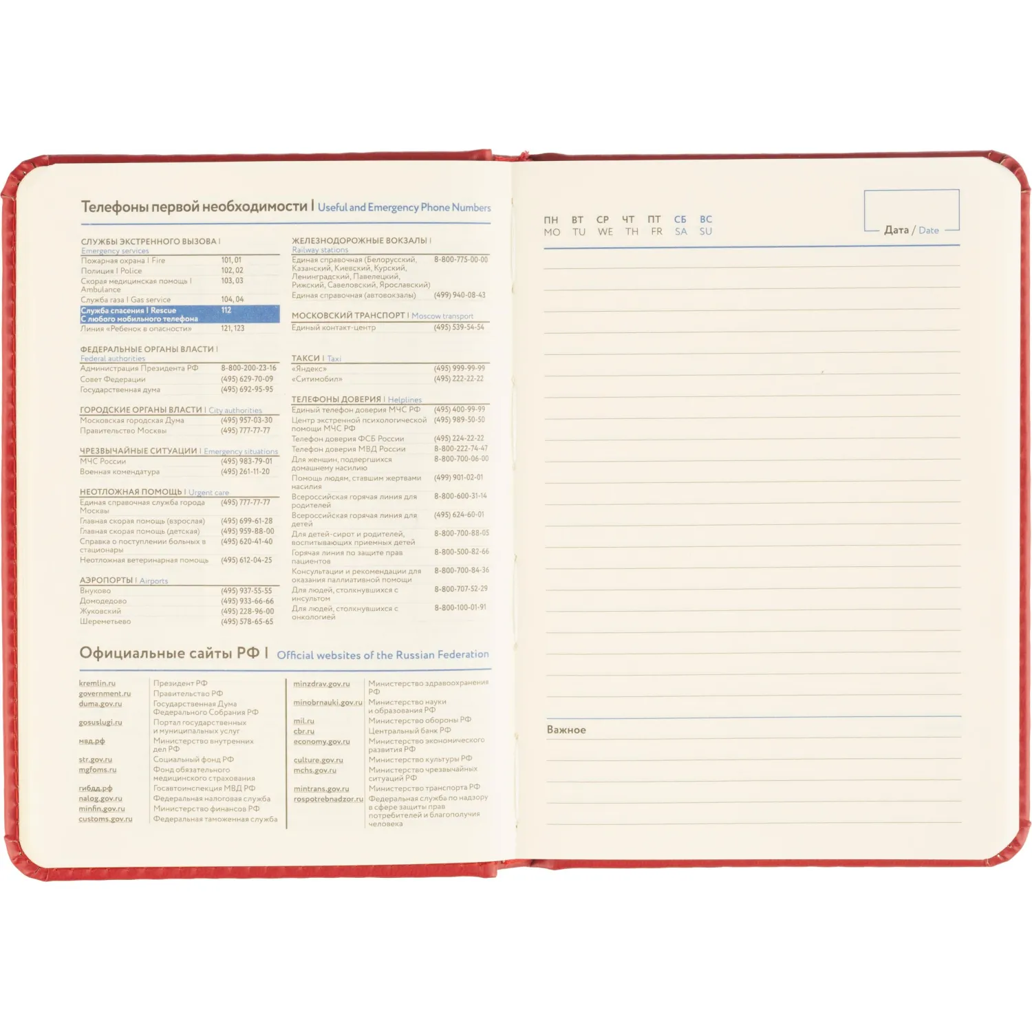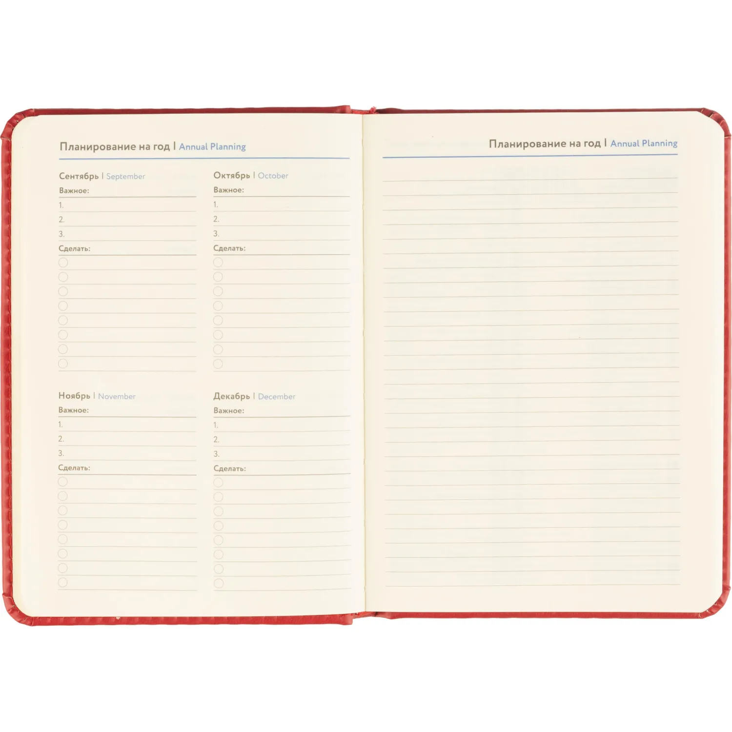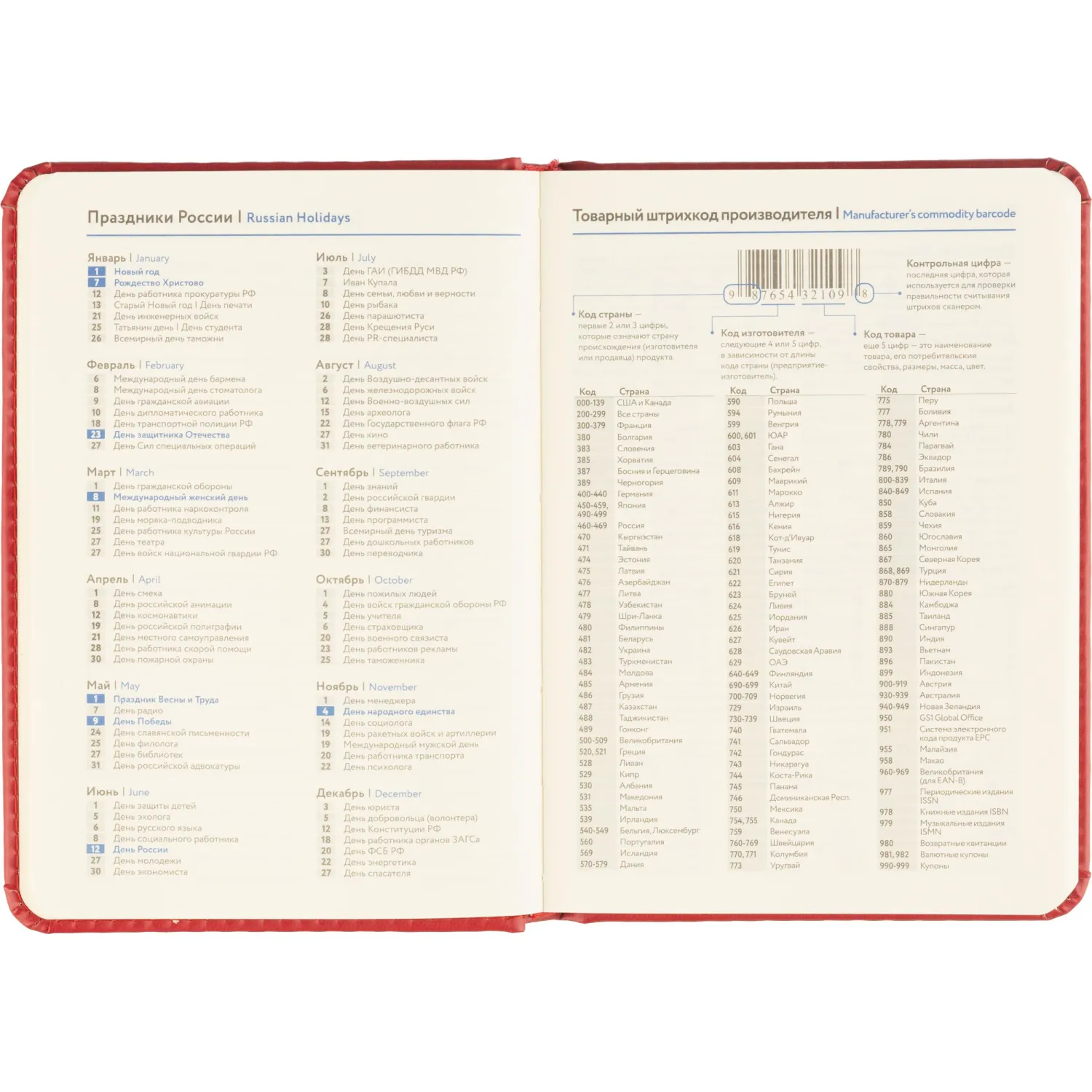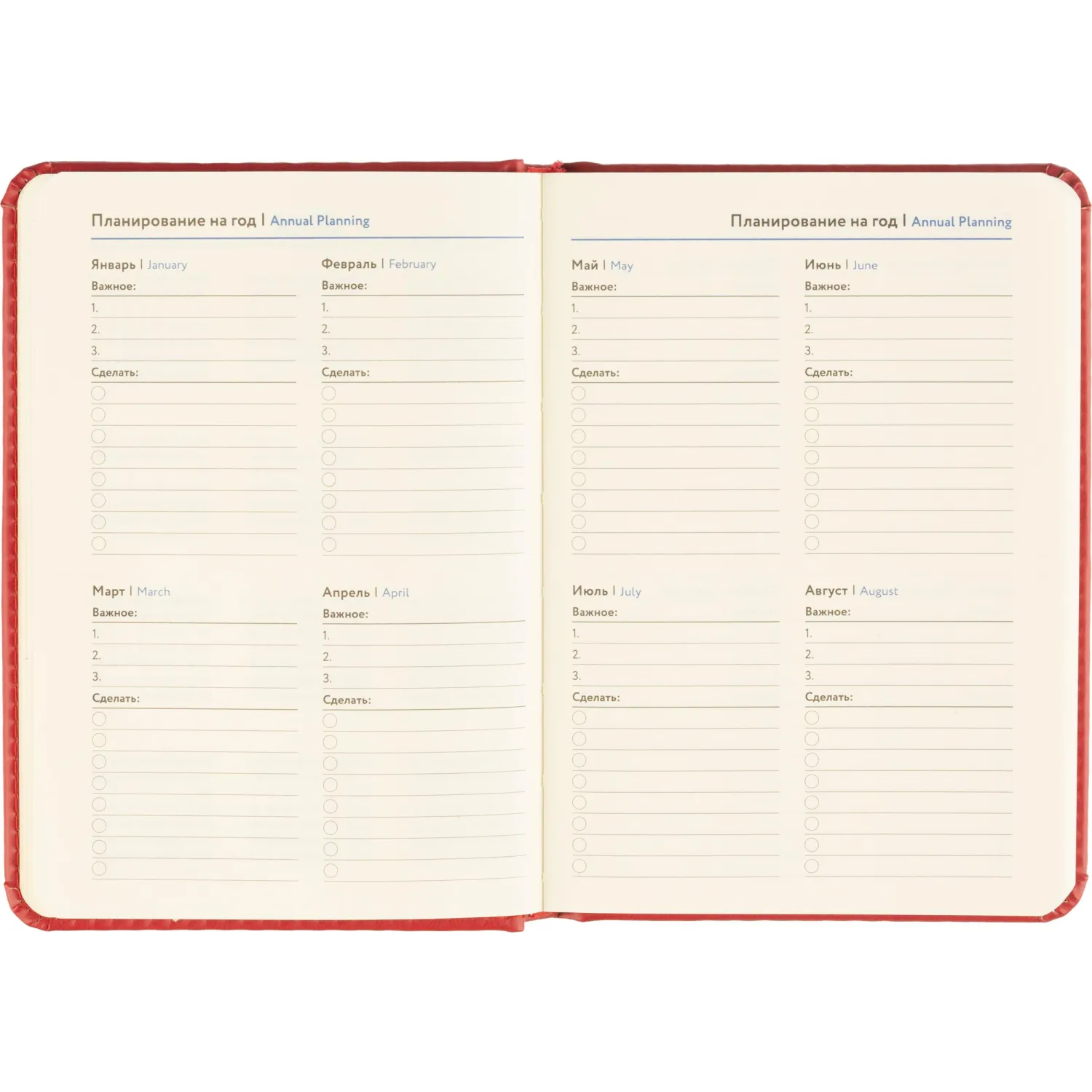 Обложка выполнена из красной искусственной кожи с тиснением и прострочкой по периметру. Твёрдая конструкция и сшивной переплёт обеспечивают надёжность и долговечность. Скруглённые углы листов и вырубка блока делают использование комфортным. Ежедневник оснащён ляссе и содержит календарь на два года. Подходит под персонализацию.