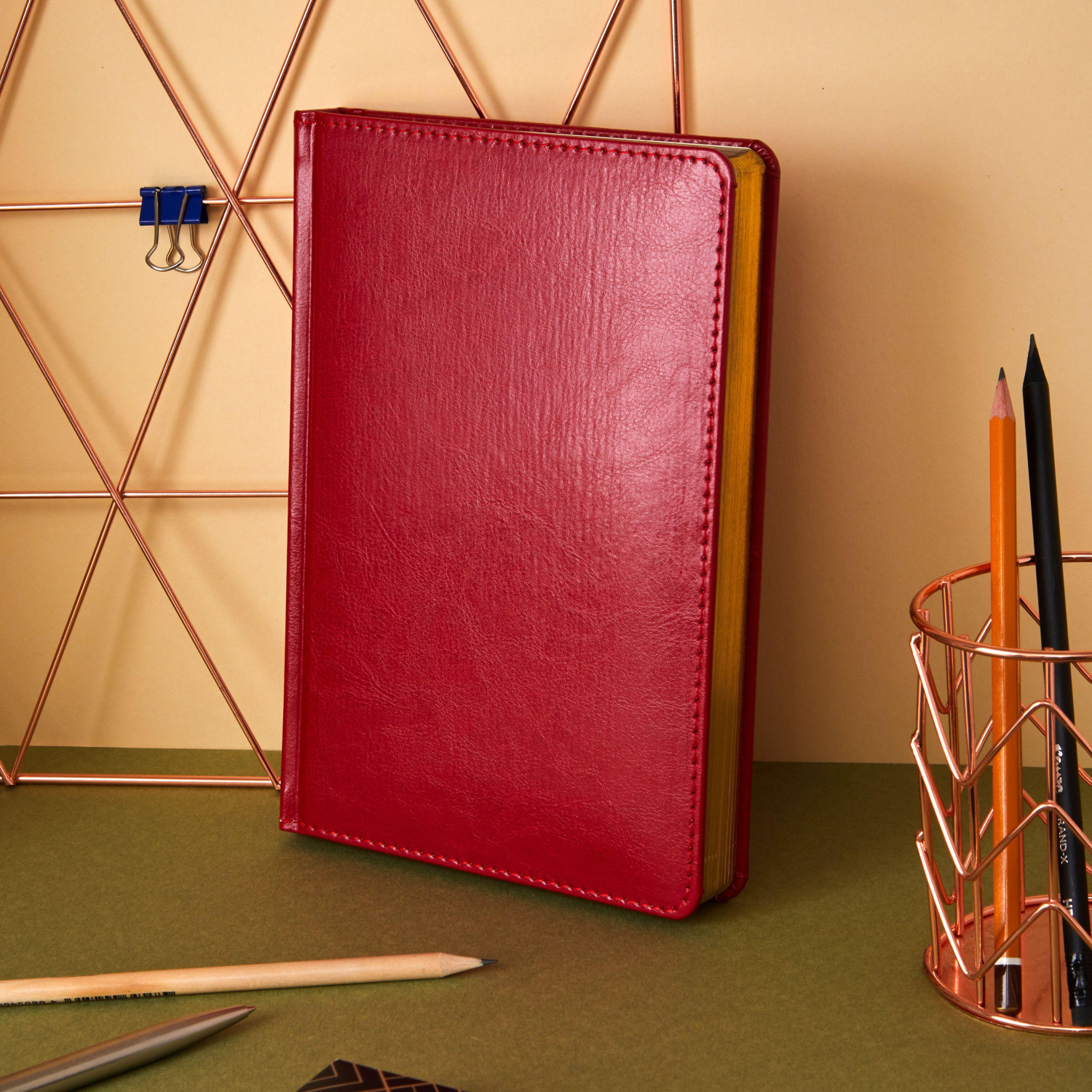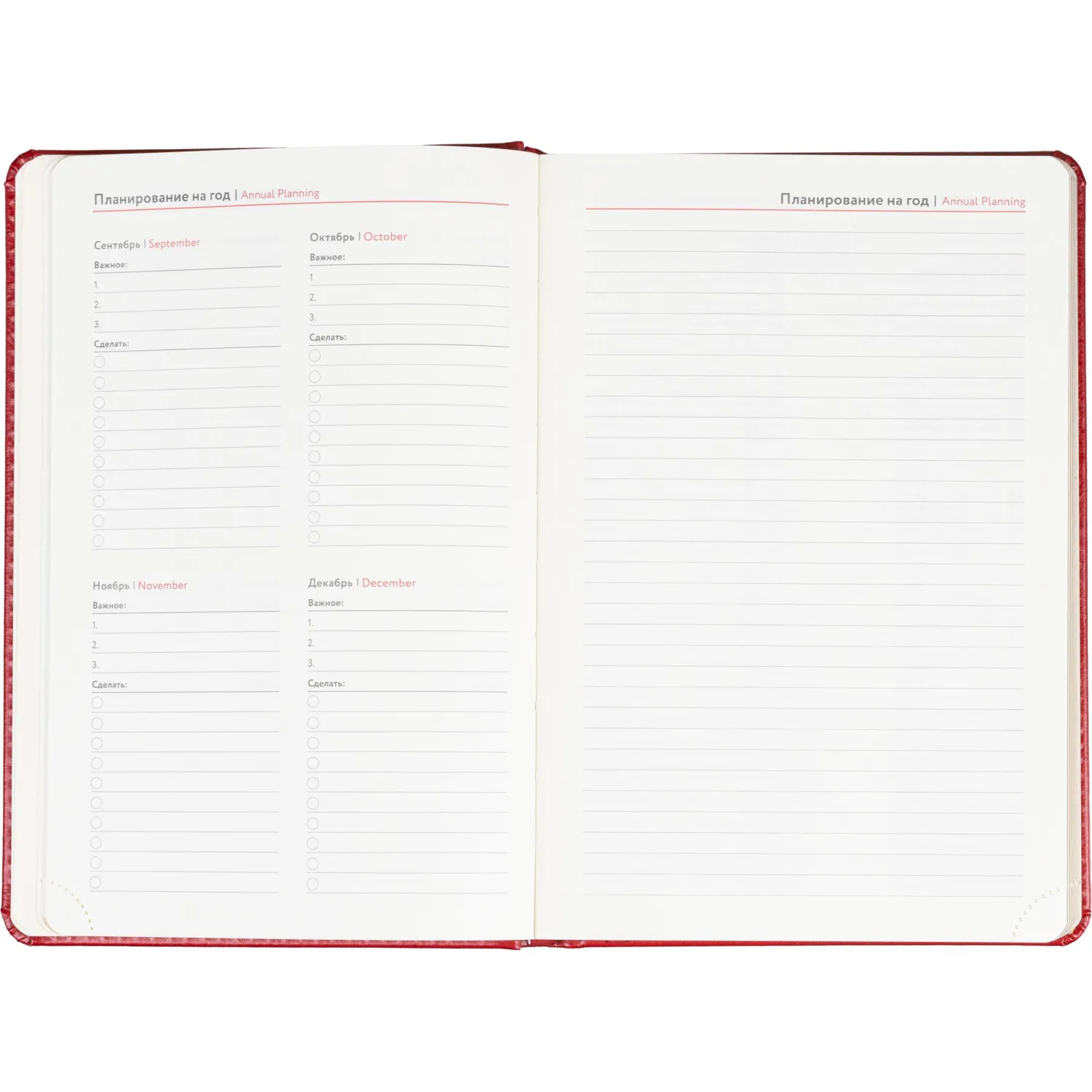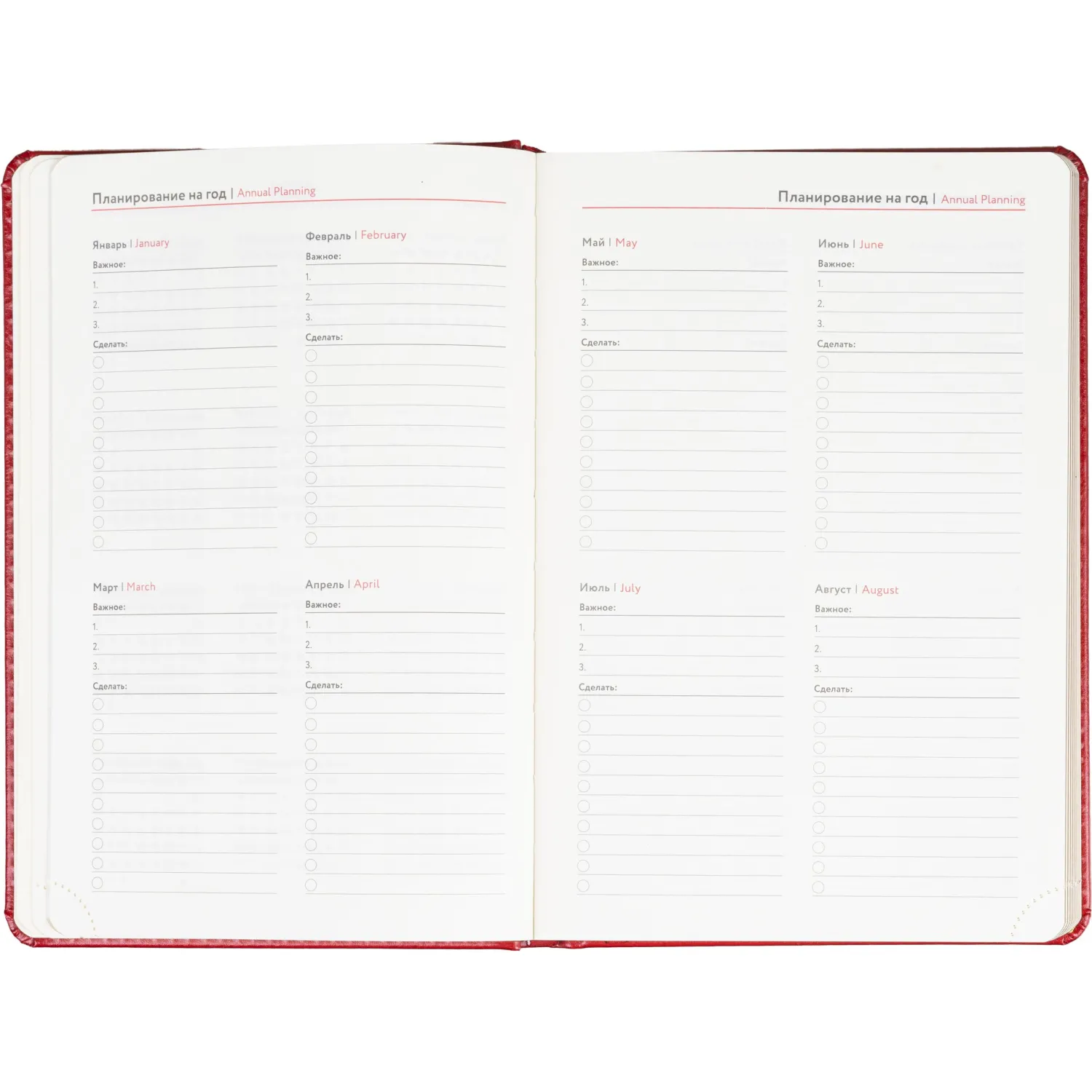 Ежедневник формата A5 подходит для записи планов, задач и заметок без ограничения по датам. Обложка выполнена из искусственной кожи бордового цвета с тиснением и оформлена в однотонном стиле. Твёрдый переплёт сохраняет форму изделия, а сшивка внутреннего блока обеспечивает надёжность при повседневном использовании.