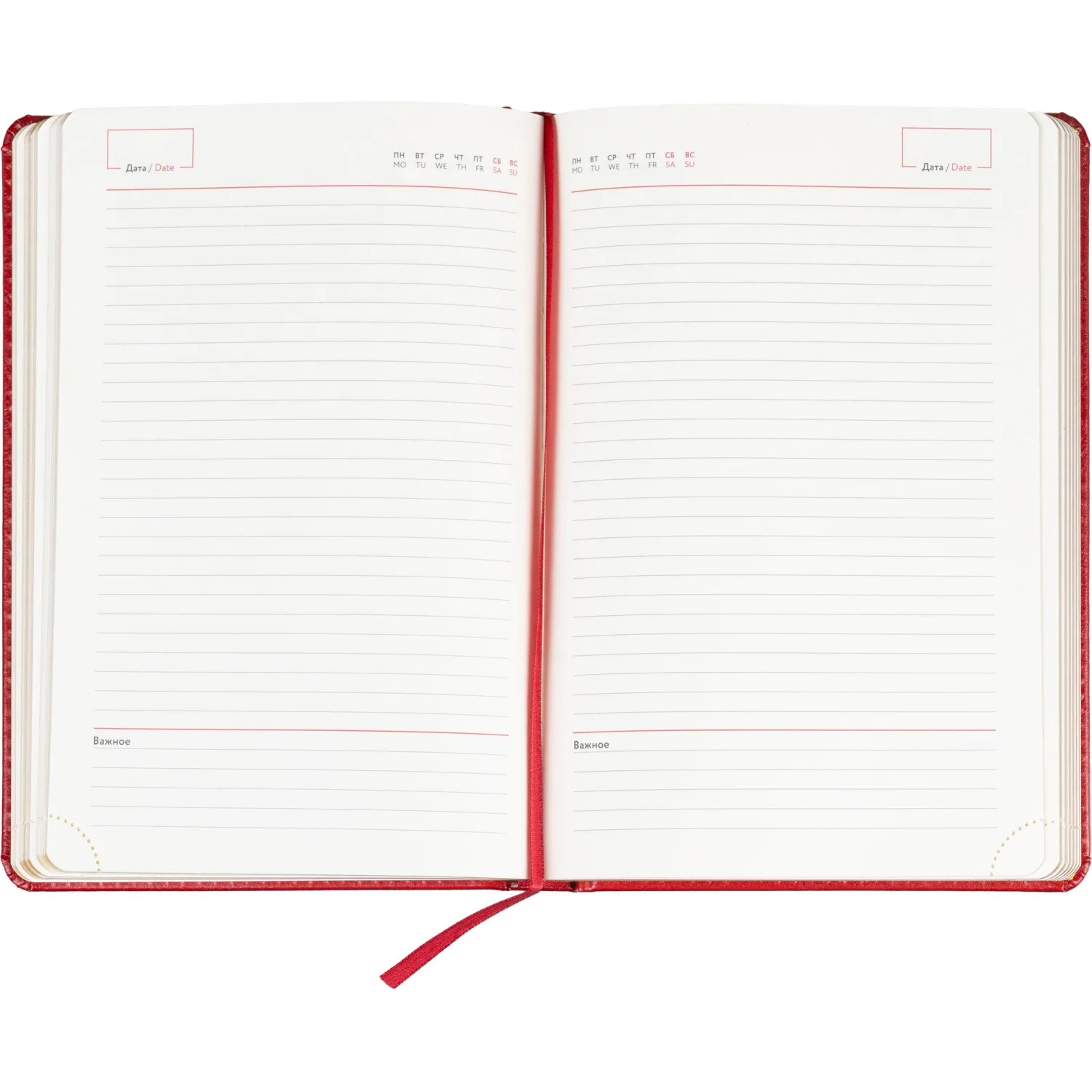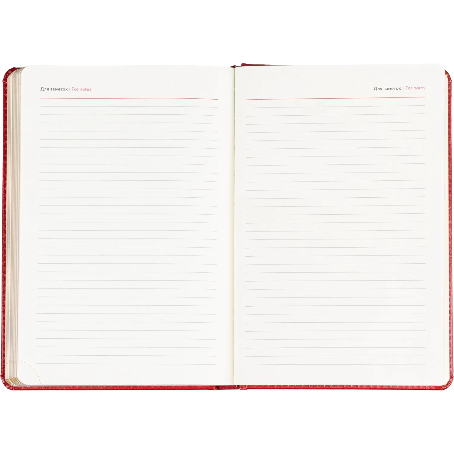 Внутренний блок включает 160 листов тонированной офсетной бумаги плотностью 80 г/кв.м. Страницы оформлены в линейку и напечатаны в две краски. Вырубка блока и перфорация уголков упрощают навигацию, а скруглённые углы повышают комфорт при перелистывании. Золотистый обрез подчёркивает презентабельный внешний вид изделия.