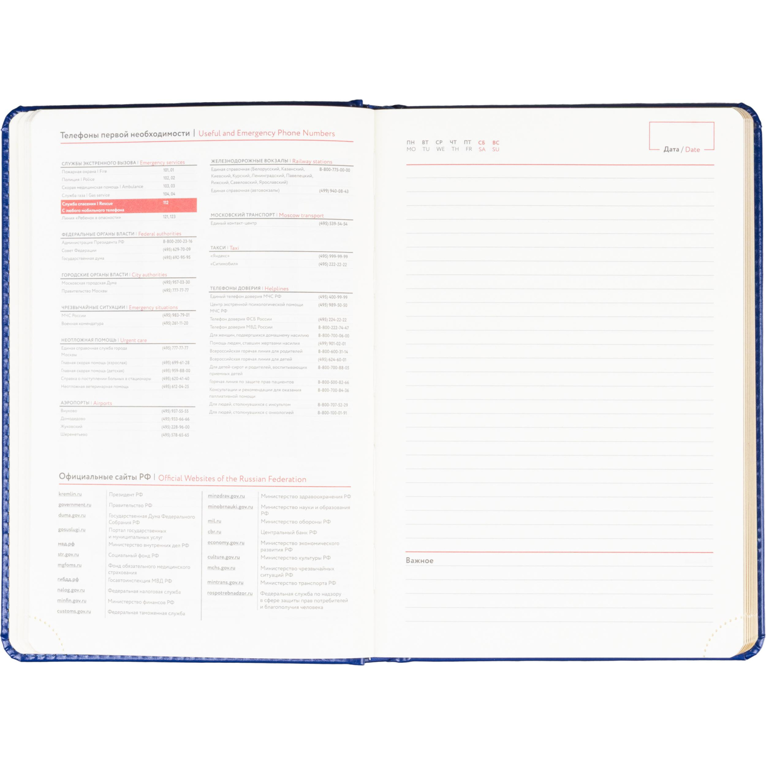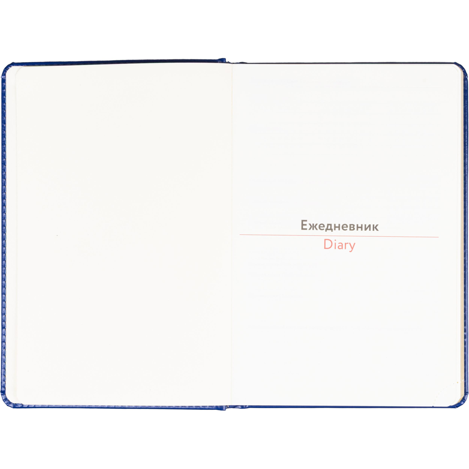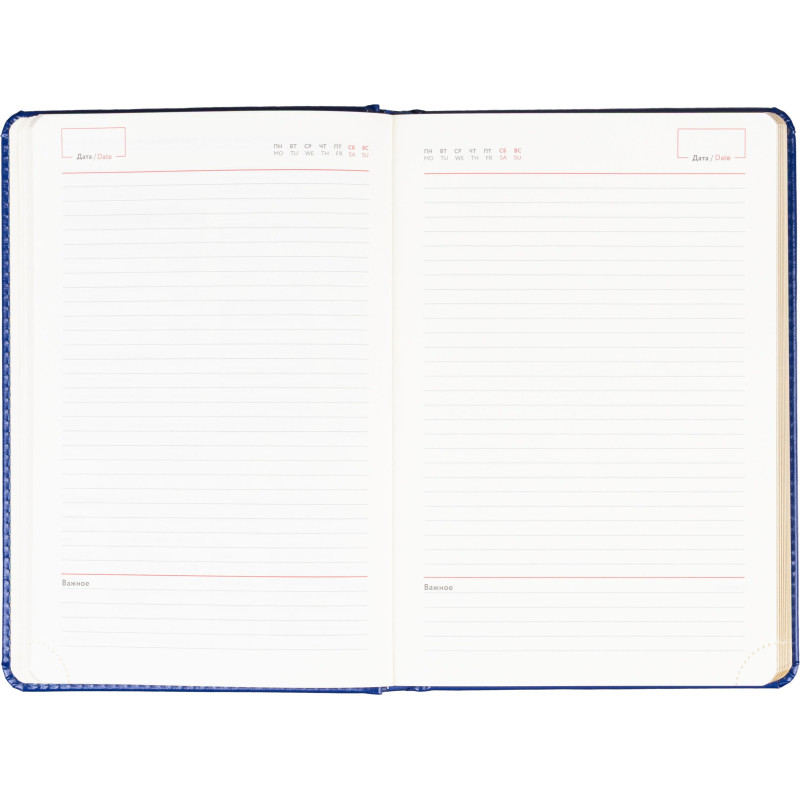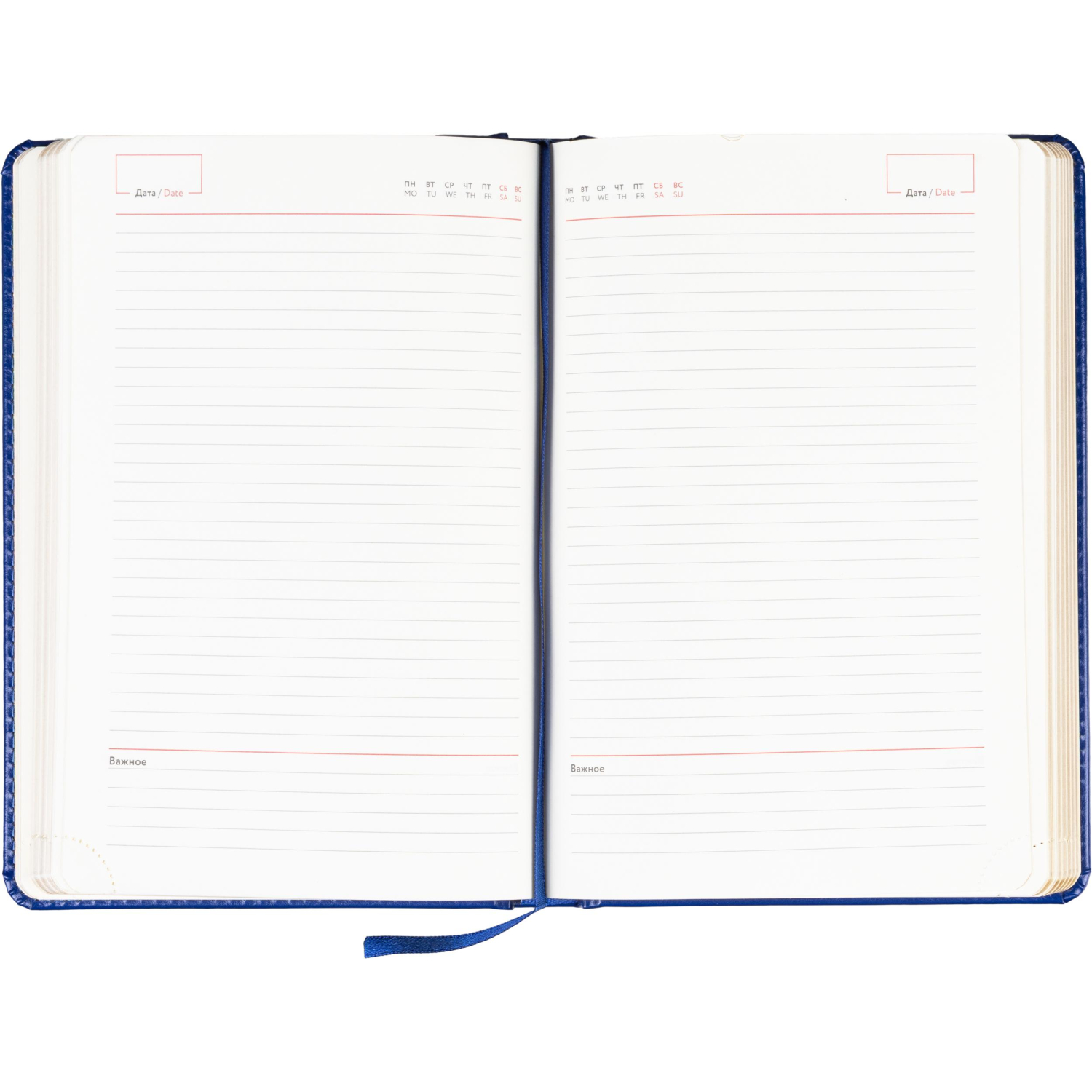 Ежедневник формата A5 предназначен для планирования и записей без указания дат. Обложка выполнена из искусственной кожи голубого цвета с тиснением и оформлена в однотонном стиле. Твёрдый переплёт обеспечивает устойчивость формы, а сшивка блока гарантирует долговечность при регулярном использовании.