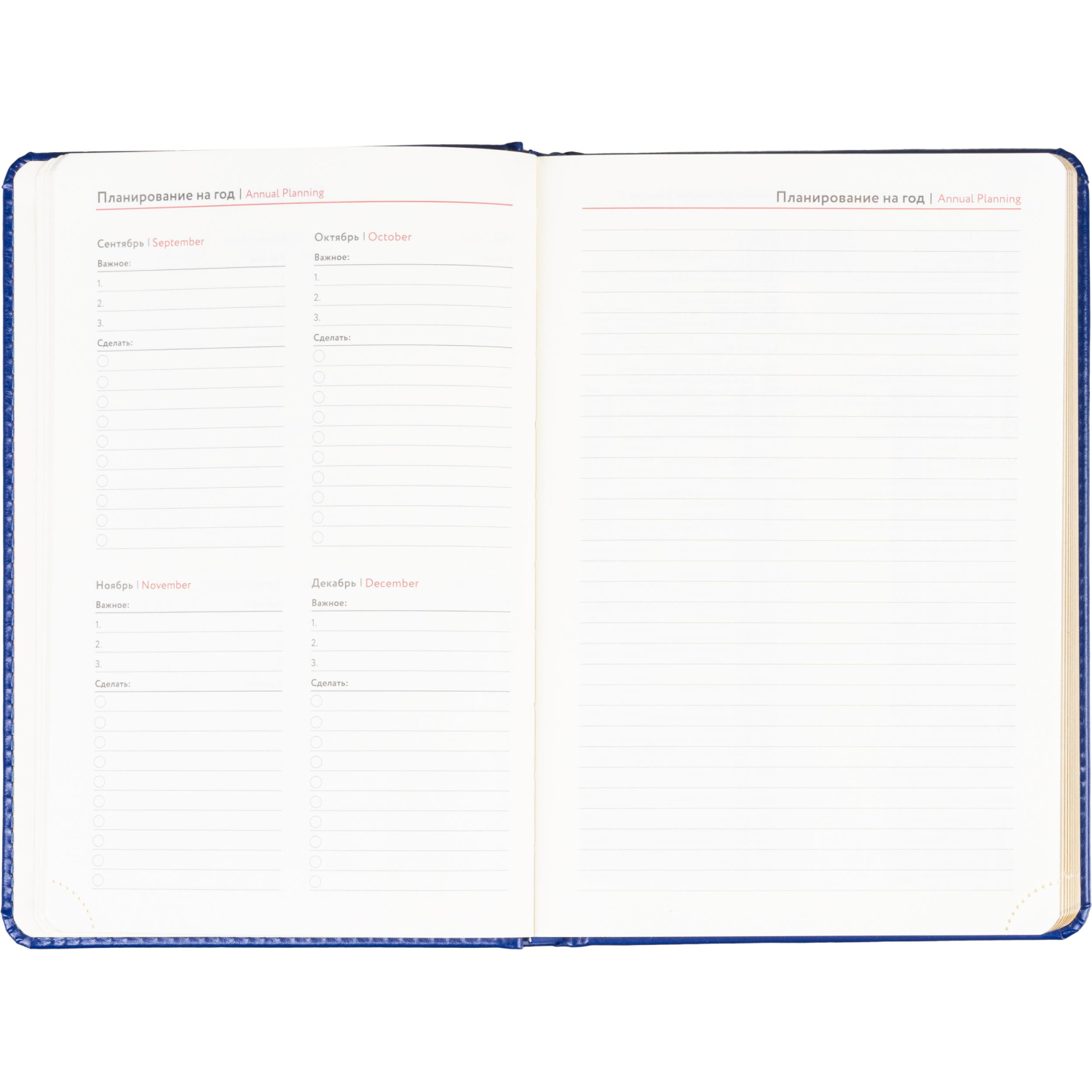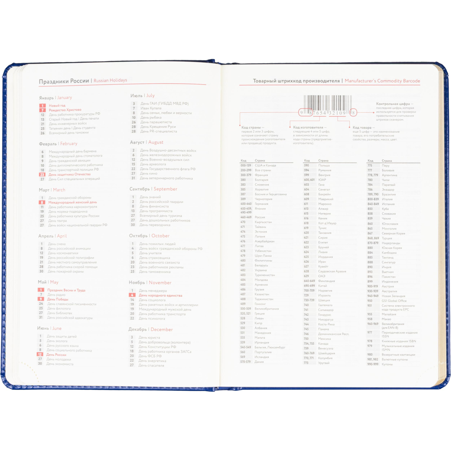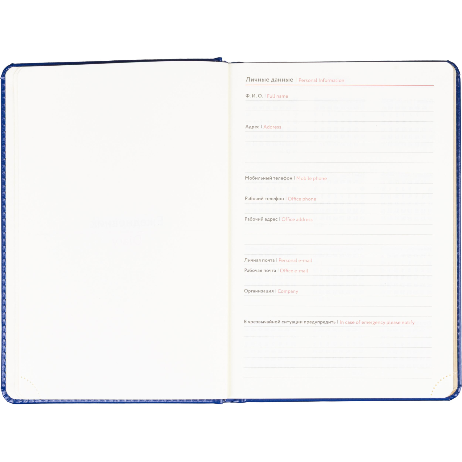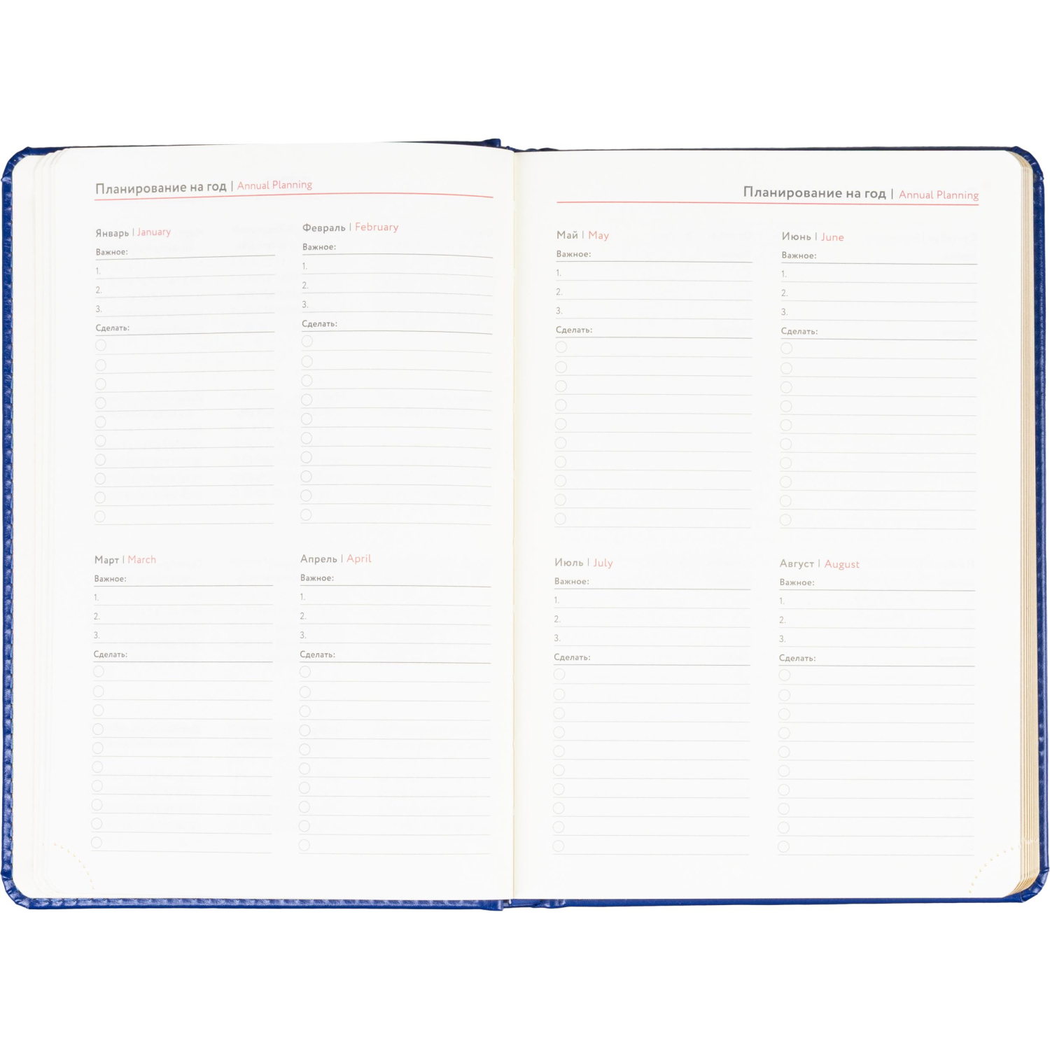 Ежедневник формата A5 предназначен для планирования и записей без указания дат. Обложка выполнена из искусственной кожи голубого цвета с тиснением и оформлена в однотонном стиле. Твёрдый переплёт обеспечивает устойчивость формы, а сшивка блока гарантирует долговечность при регулярном использовании.