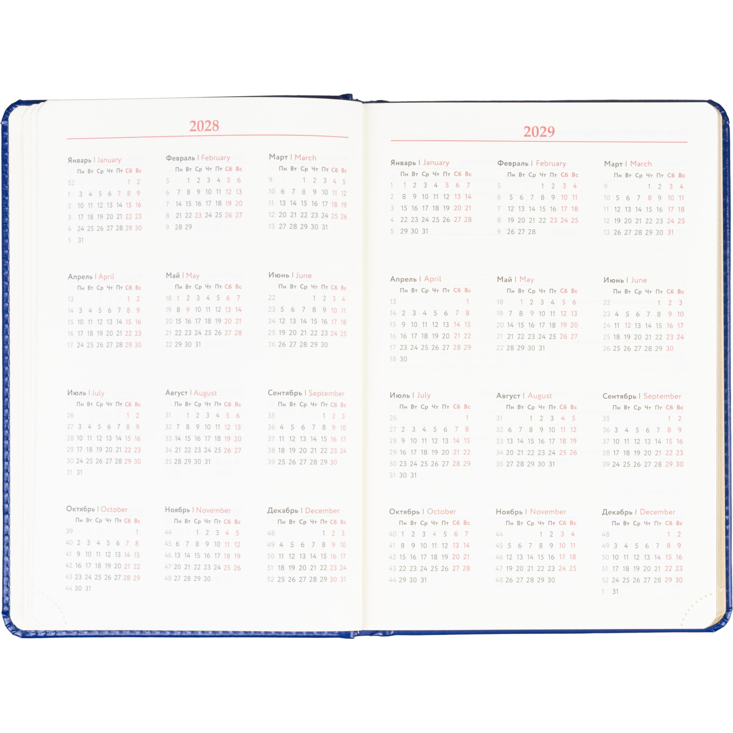 Размер изделия — 14.5×21.5 см. Внутри размещён календарь на два года. Ежедневник подходит под персонализацию.