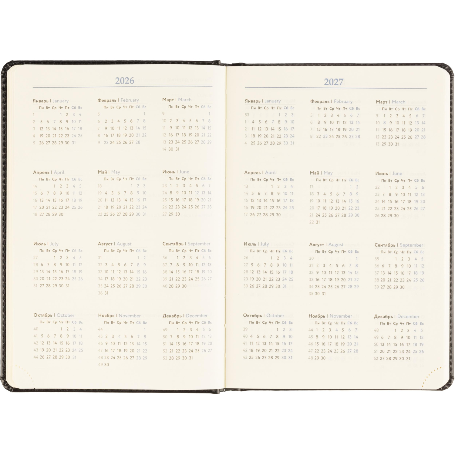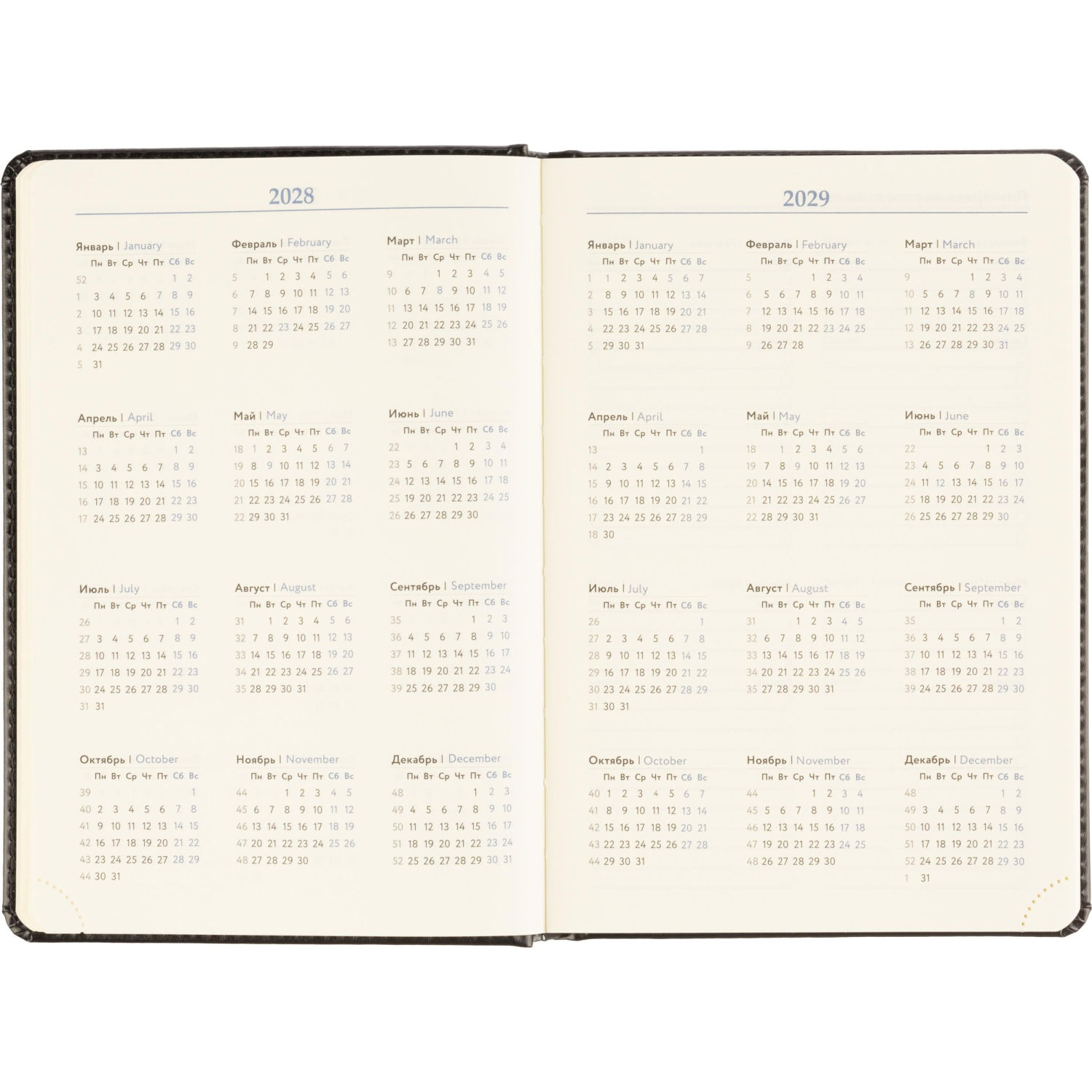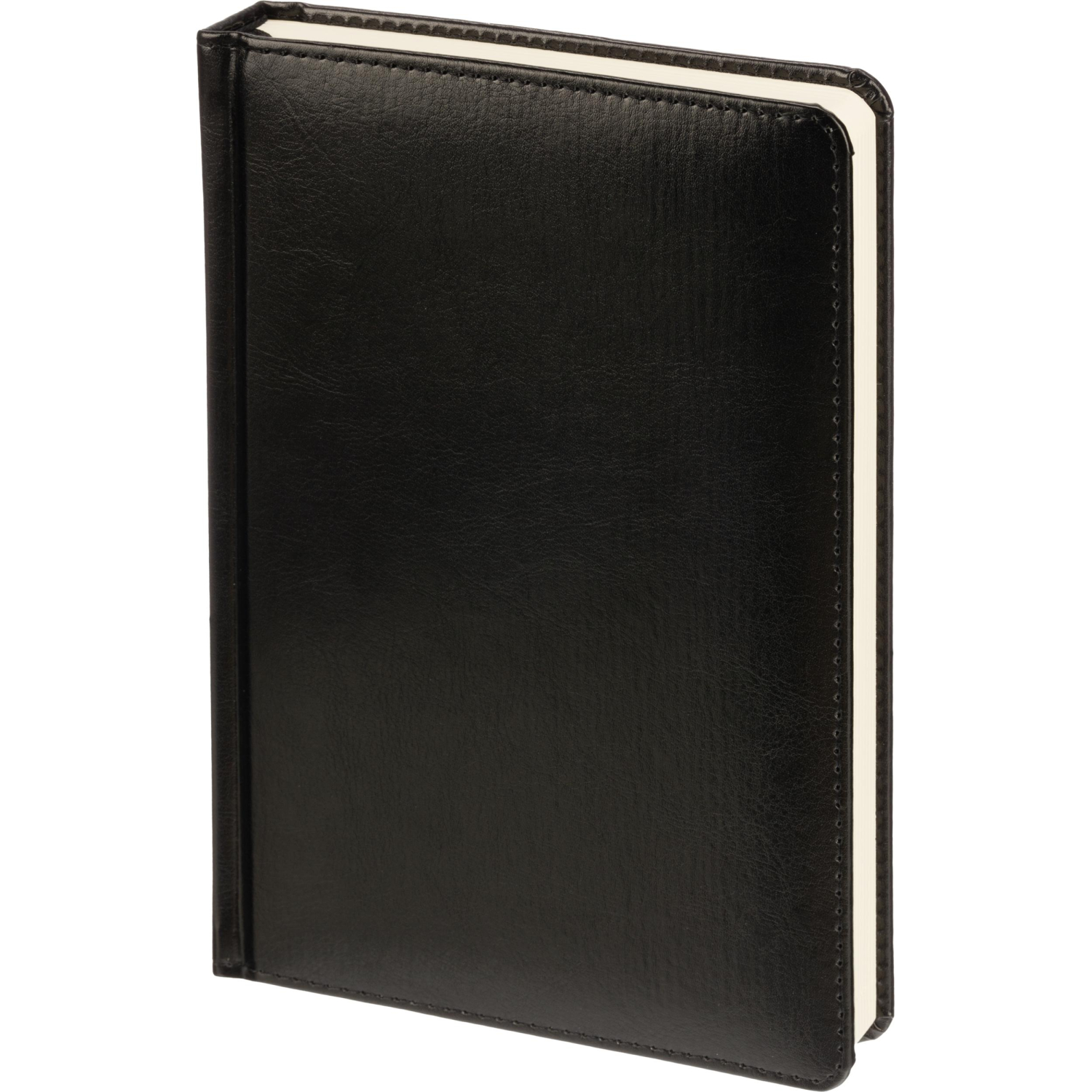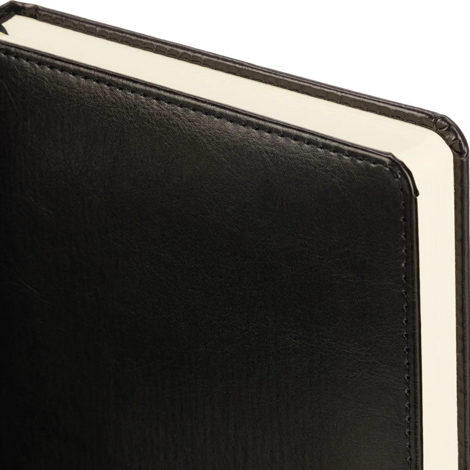 Обложка выполнена из искусственной кожи чёрного цвета с тиснением и аккуратной прострочкой по периметру. Твёрдый переплёт на сшивке гарантирует прочность. Скруглённые углы листов, вырубка и перфорация уголков делают использование комфортным. Ежедневник оснащён ляссе и дополнен календарём на два года. Предусмотрена возможность персонализации.