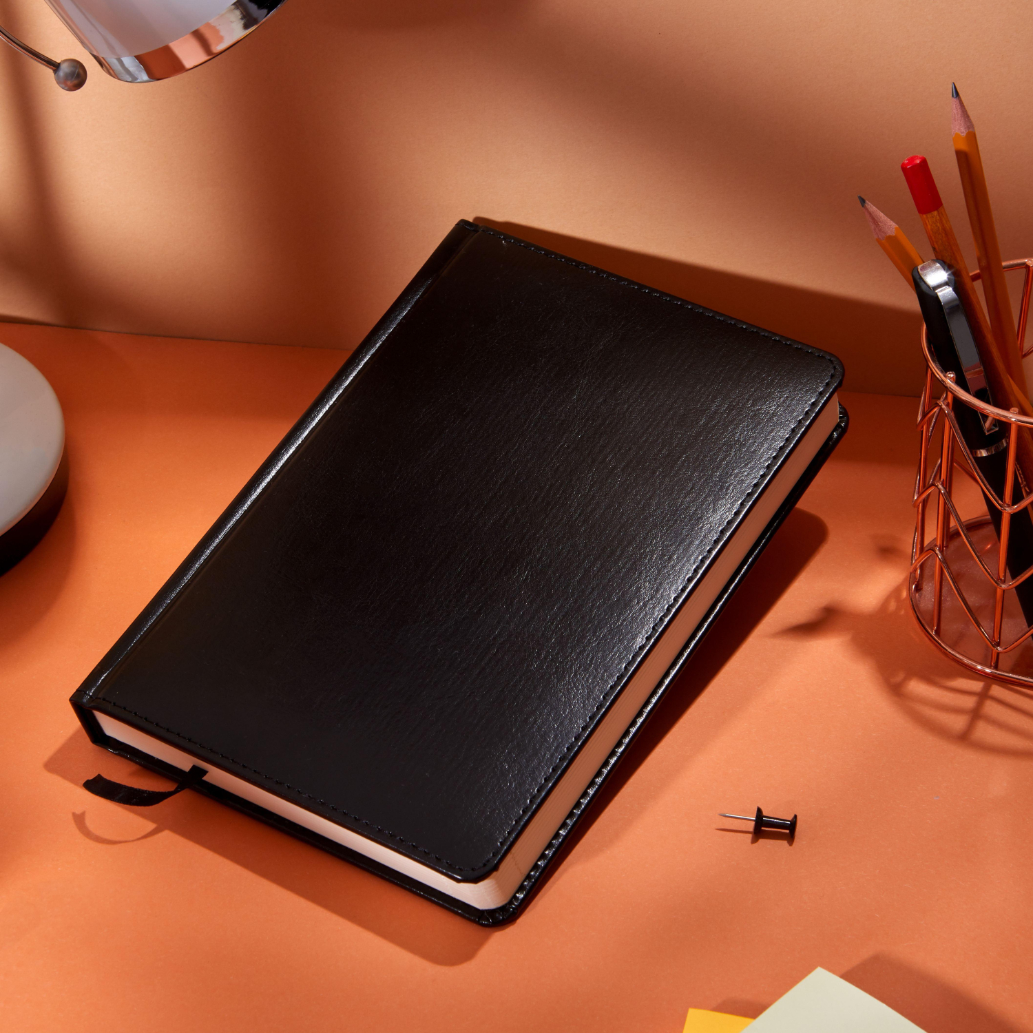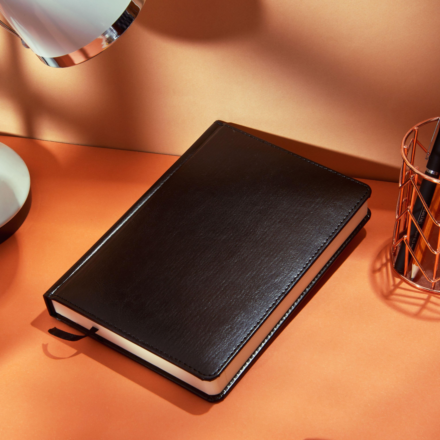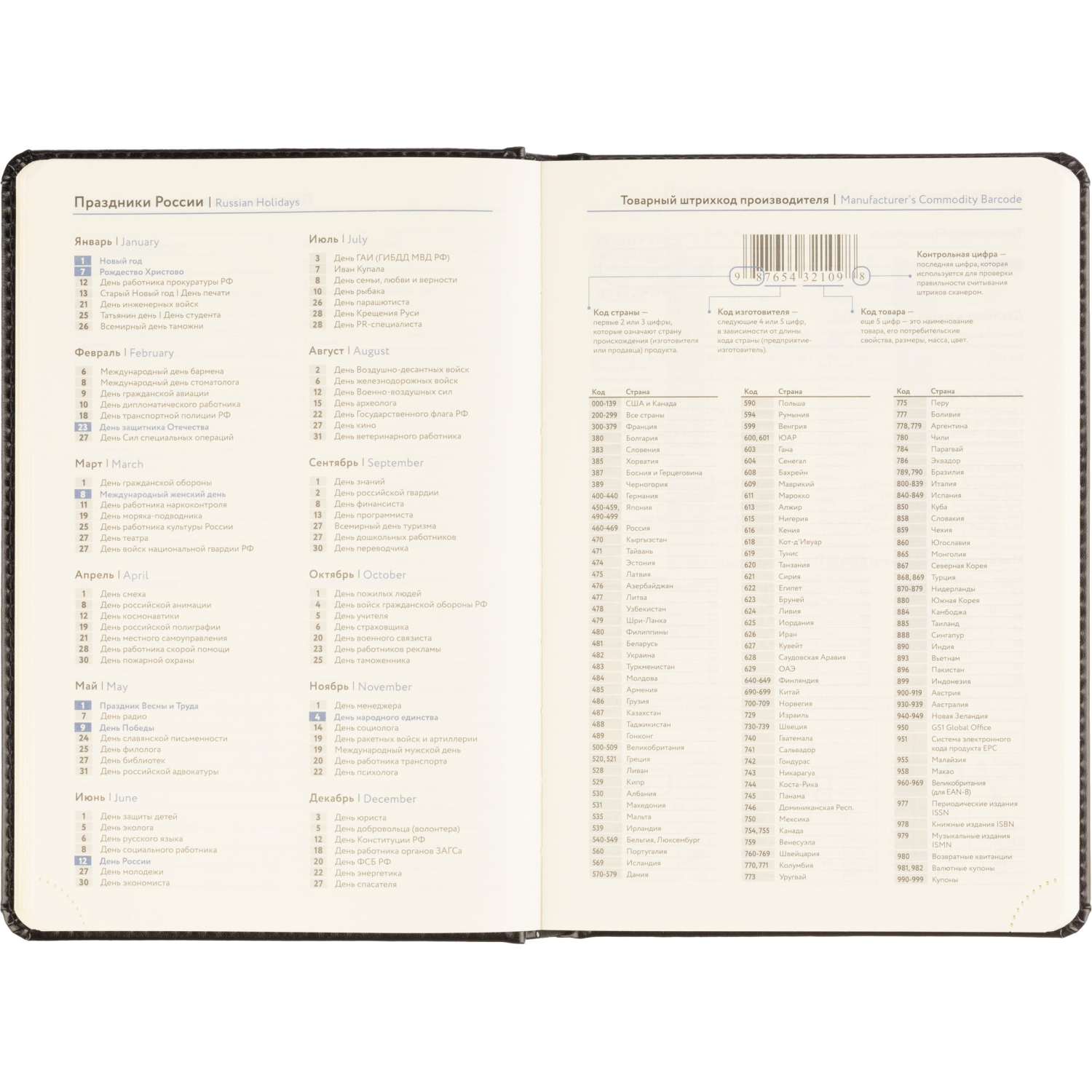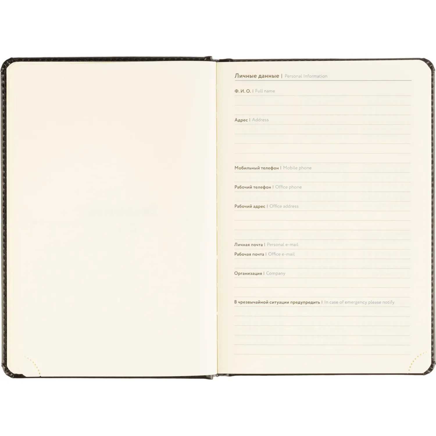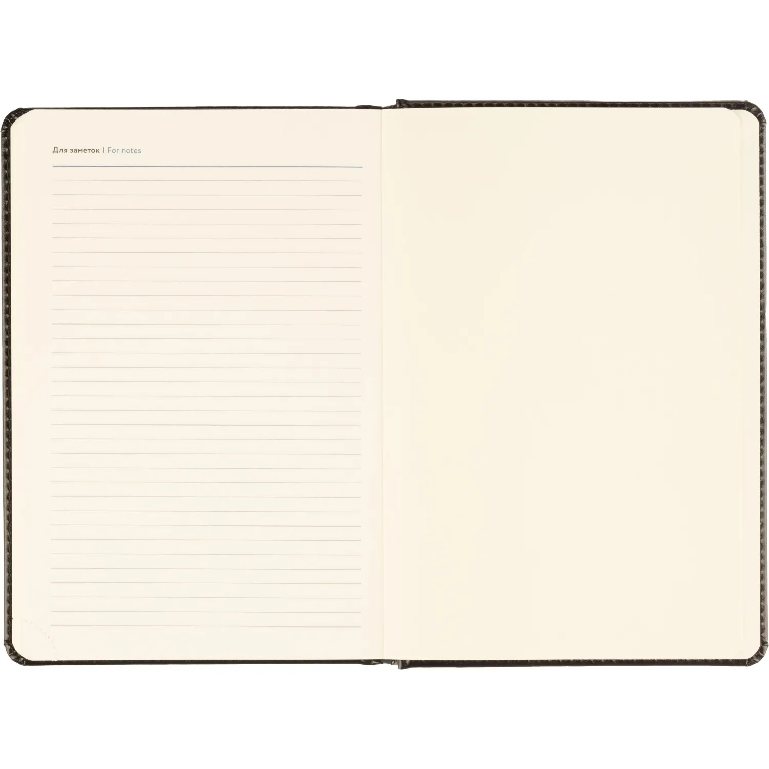 Обложка выполнена из искусственной кожи чёрного цвета с тиснением и аккуратной прострочкой по периметру. Твёрдый переплёт на сшивке гарантирует прочность. Скруглённые углы листов, вырубка и перфорация уголков делают использование комфортным. Ежедневник оснащён ляссе и дополнен календарём на два года. Предусмотрена возможность персонализации.