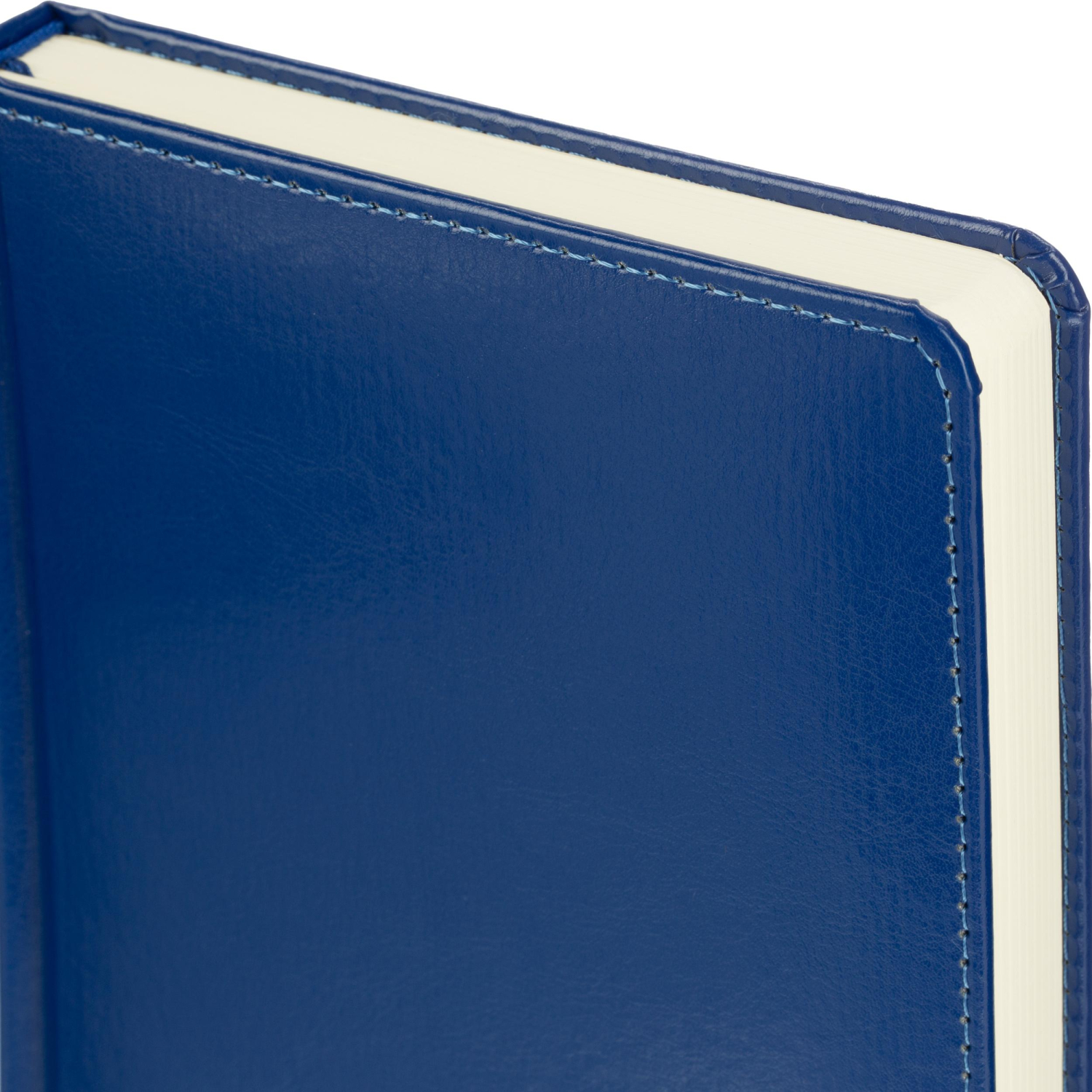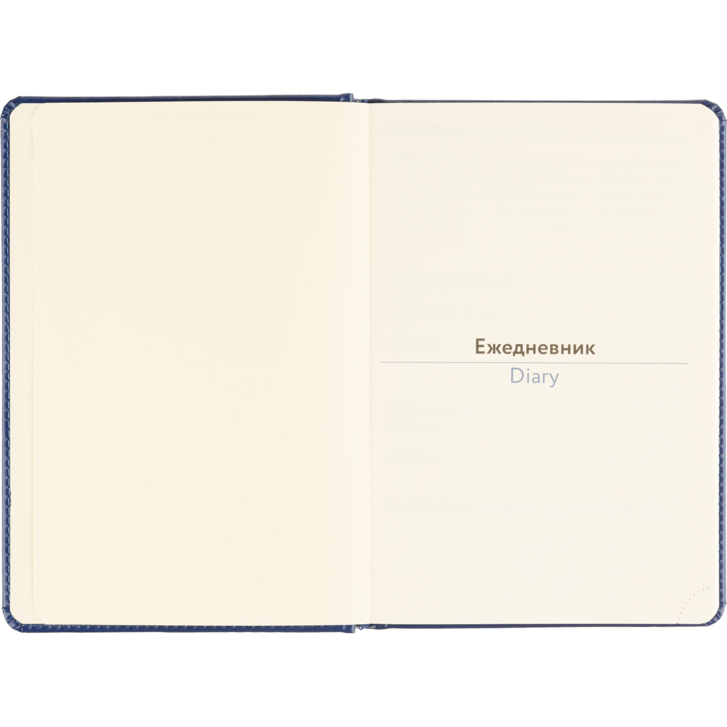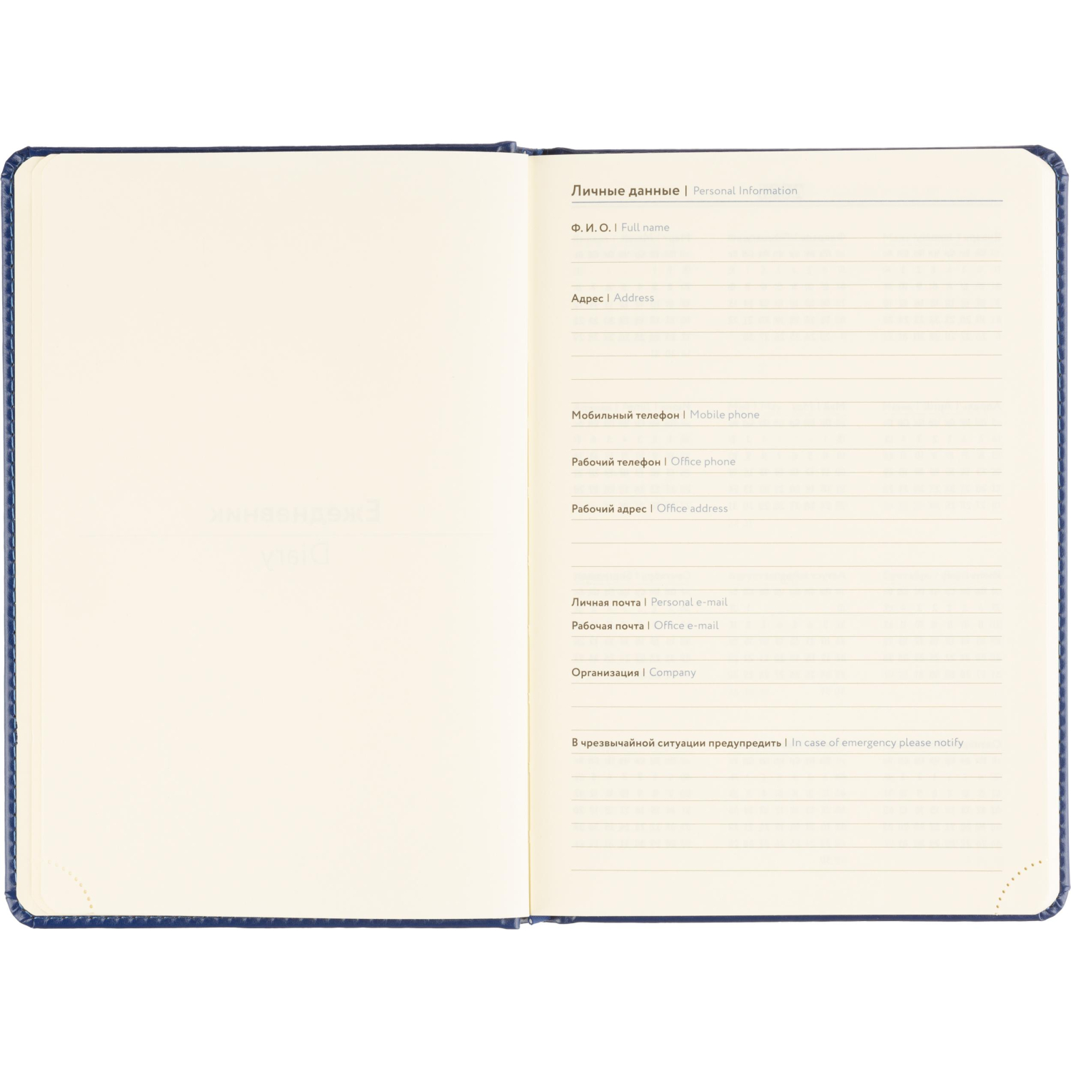 Твёрдая обложка из синей искусственной кожи оформлена тиснением и прострочена по периметру. Переплёт выполнен на сшивке, что гарантирует прочность при длительном использовании. Скруглённые углы листов, вырубка блока и наличие перфорации уголков делают использование особенно комфортным. Ежедневник оснащён ляссе и включает календарь на два года. Изделие может быть персонализировано под заказ.