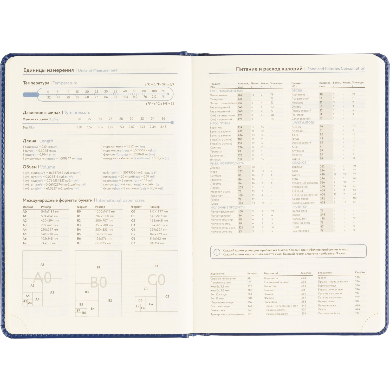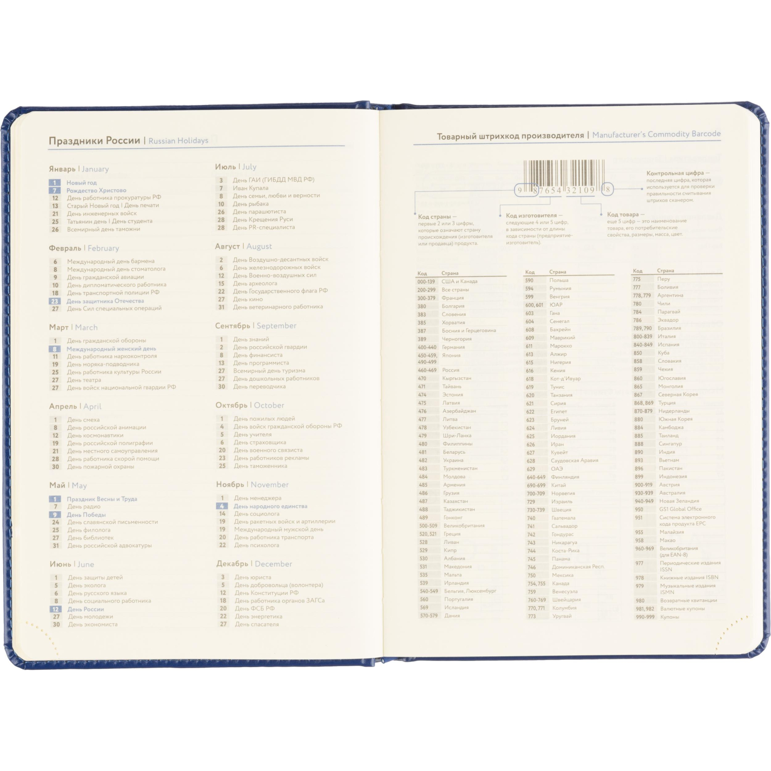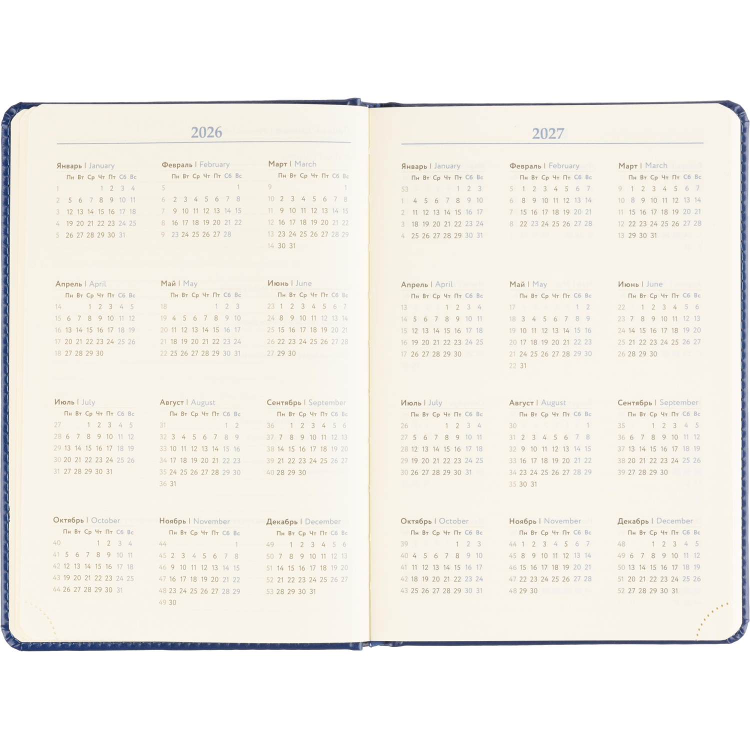 Твёрдая обложка из синей искусственной кожи оформлена тиснением и прострочена по периметру. Переплёт выполнен на сшивке, что гарантирует прочность при длительном использовании. Скруглённые углы листов, вырубка блока и наличие перфорации уголков делают использование особенно комфортным. Ежедневник оснащён ляссе и включает календарь на два года. Изделие может быть персонализировано под заказ.