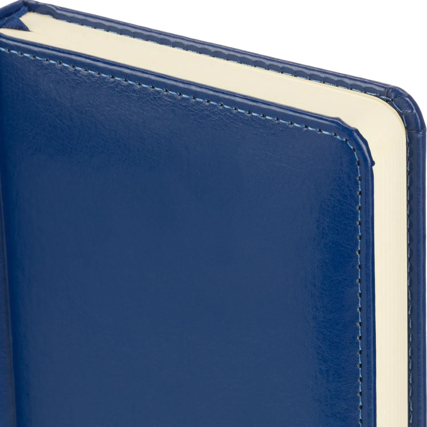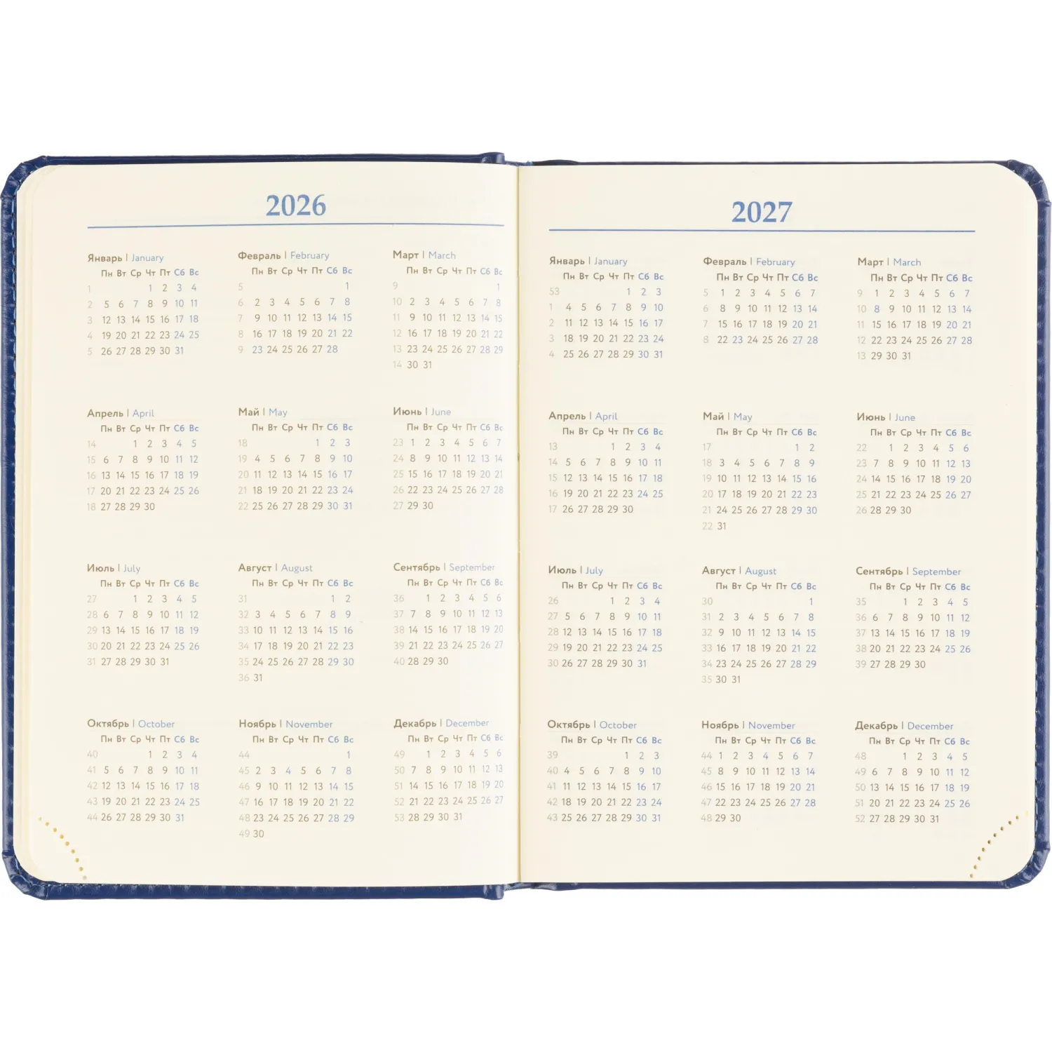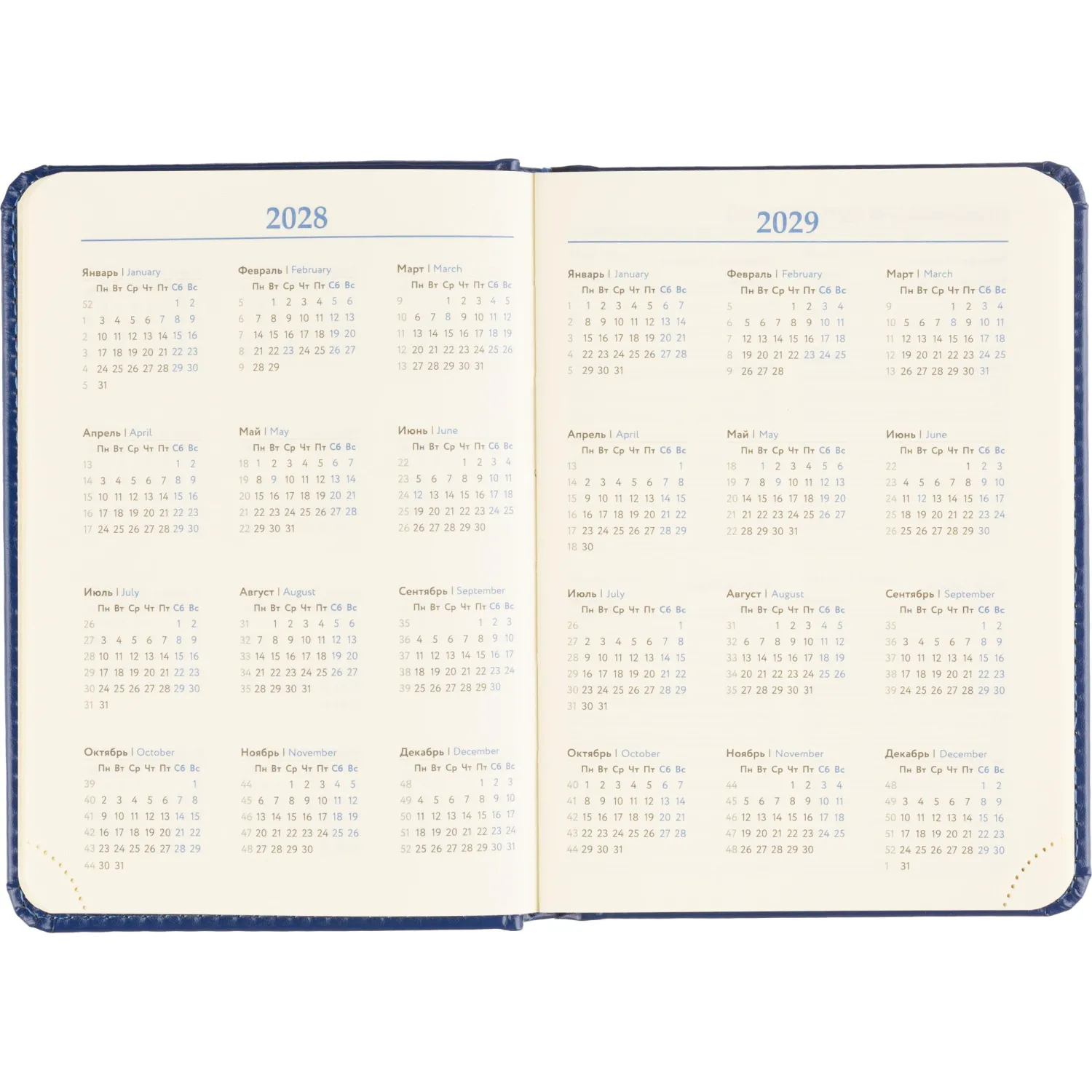 Обложка из синей искусственной кожи украшена тиснением и прострочена по периметру. Твёрдая конструкция и сшивной переплёт обеспечивают долговечность, а скруглённые углы, вырубка и перфорация уголков повышают комфорт использования. Ежедневник дополнен ляссе и календарём на два года. Предусмотрена возможность персонализации.