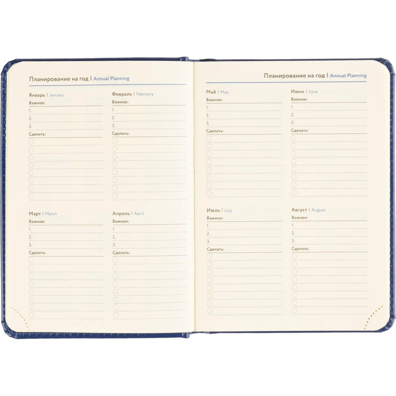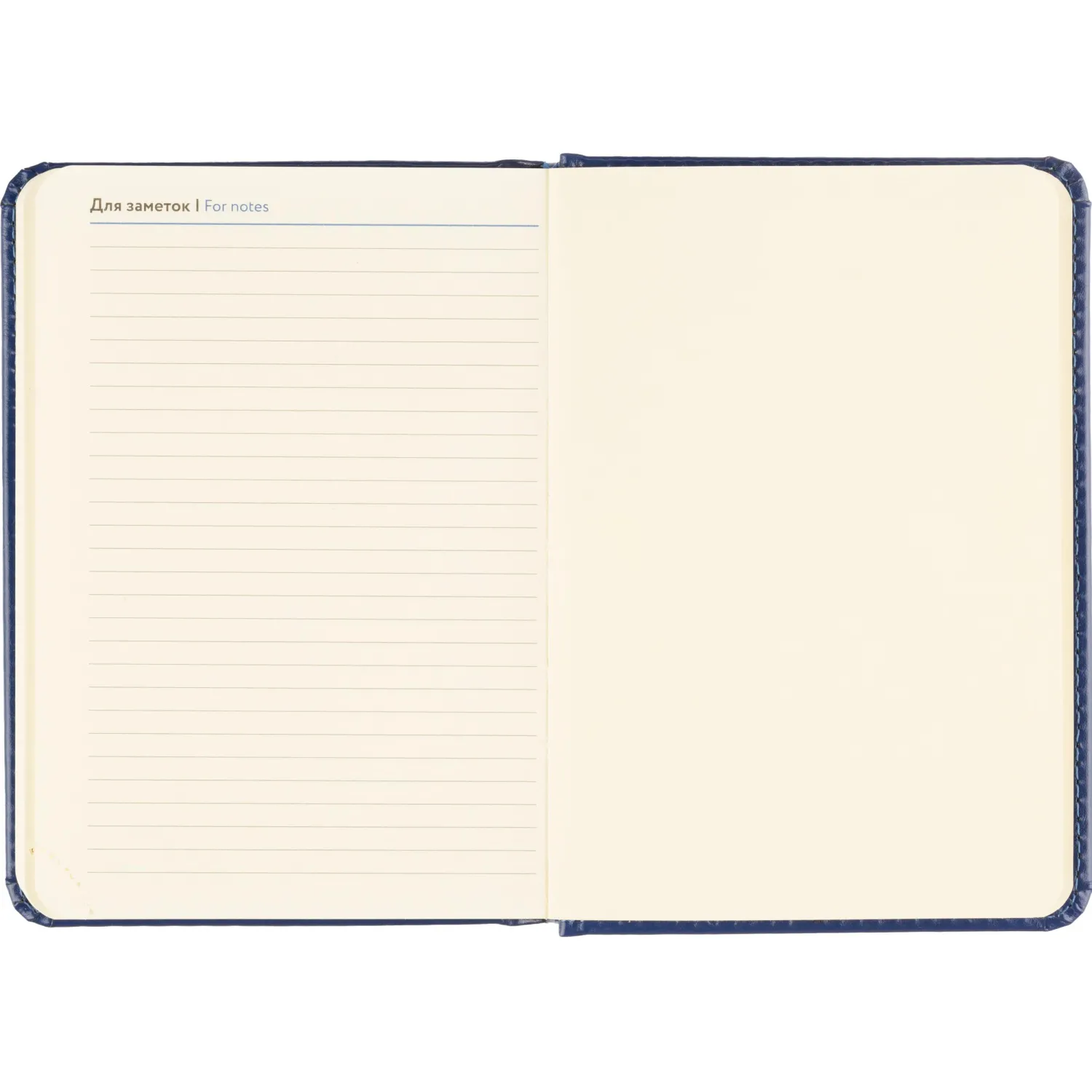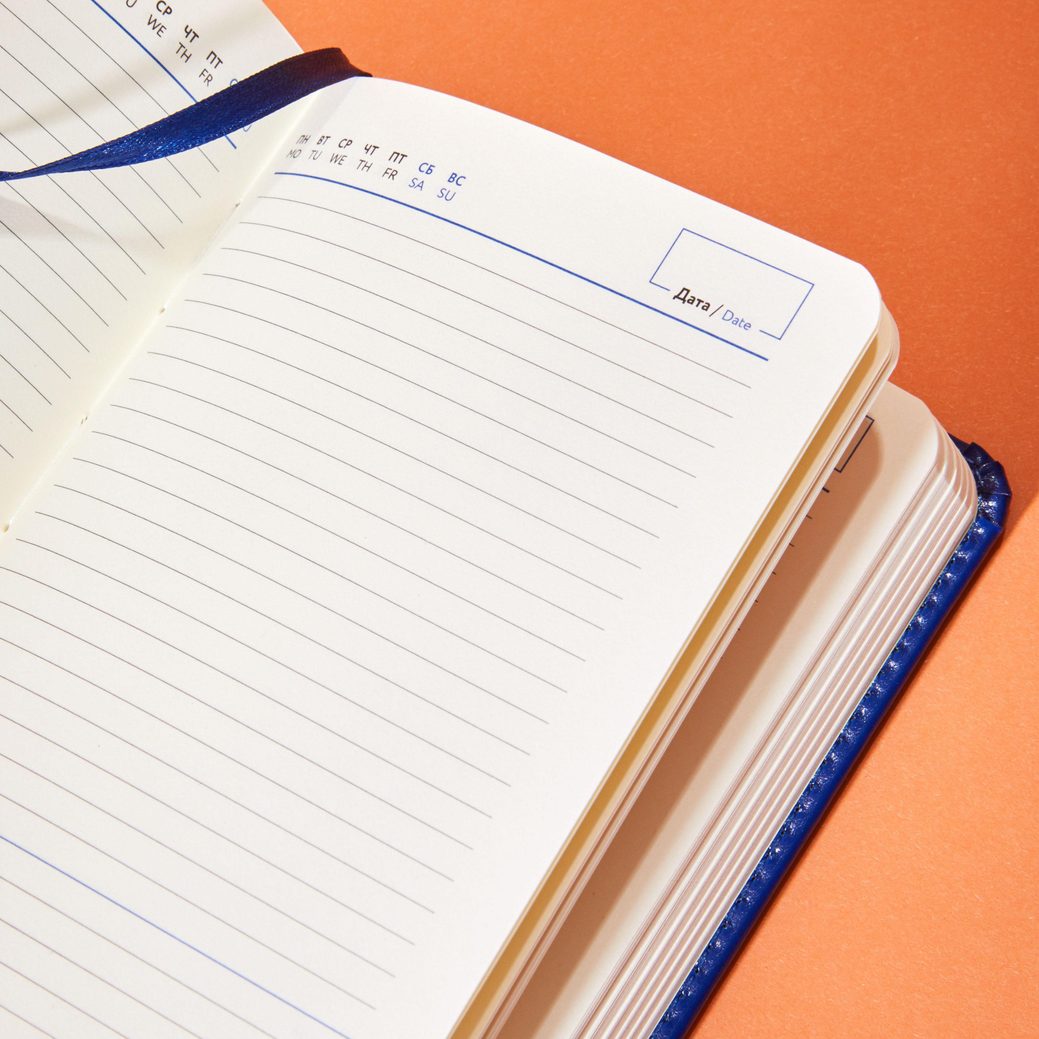 Ежедневник карманного формата А6 подойдёт для оперативных записей и планирования в дороге. Внутренний блок включает 160 листов тонированной офсетной бумаги плотностью 80 г/кв.м с линовкой в линейку. Печать выполнена в две краски, что делает страницы более удобными для восприятия.