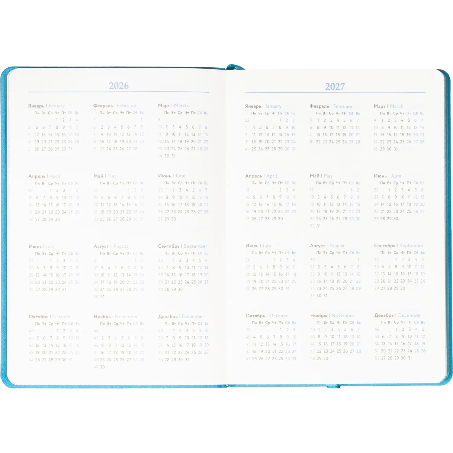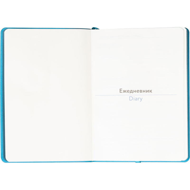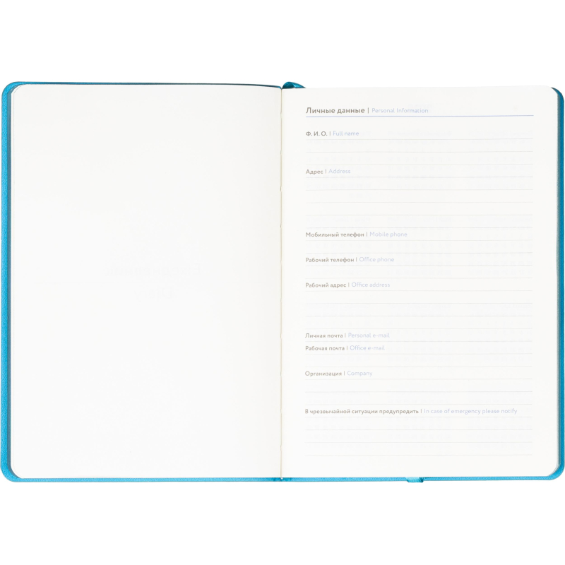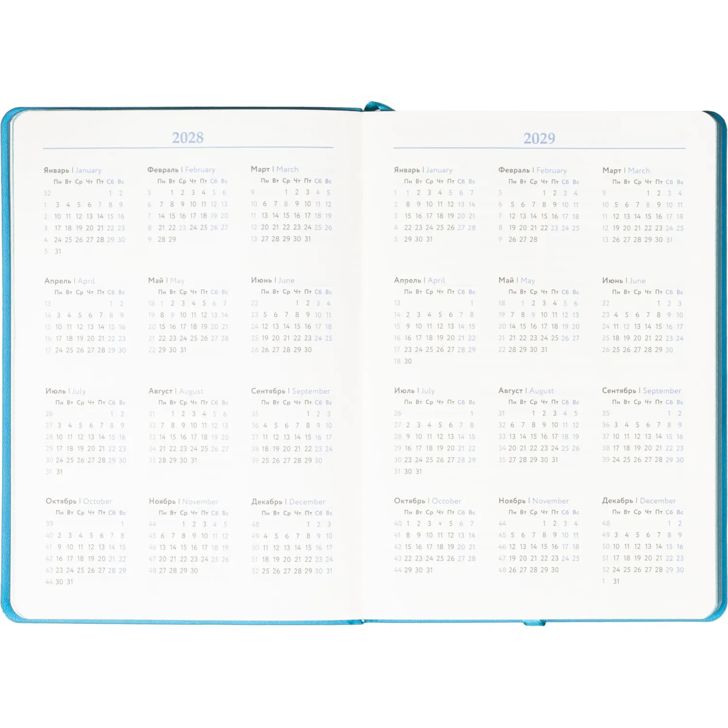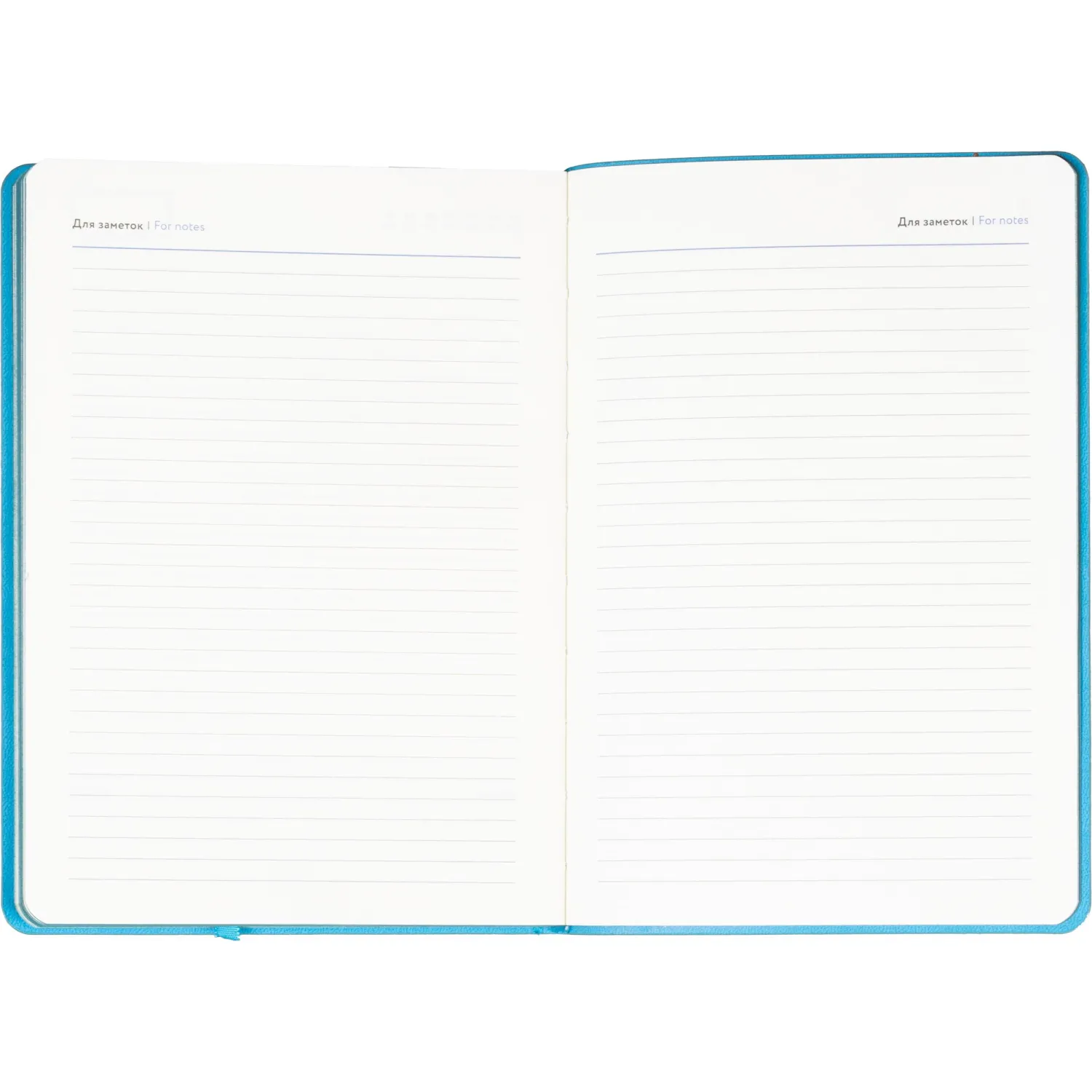 Ежедневник формата A5 предназначен для записи заметок, планов и идей без указания дат. Обложка выполнена из искусственной кожи бирюзового цвета с тиснением и оформлена в однотонном стиле. Мягкий переплёт обеспечивает лёгкость и гибкость изделия, а сшивка блока делает его прочным при повседневном использовании.