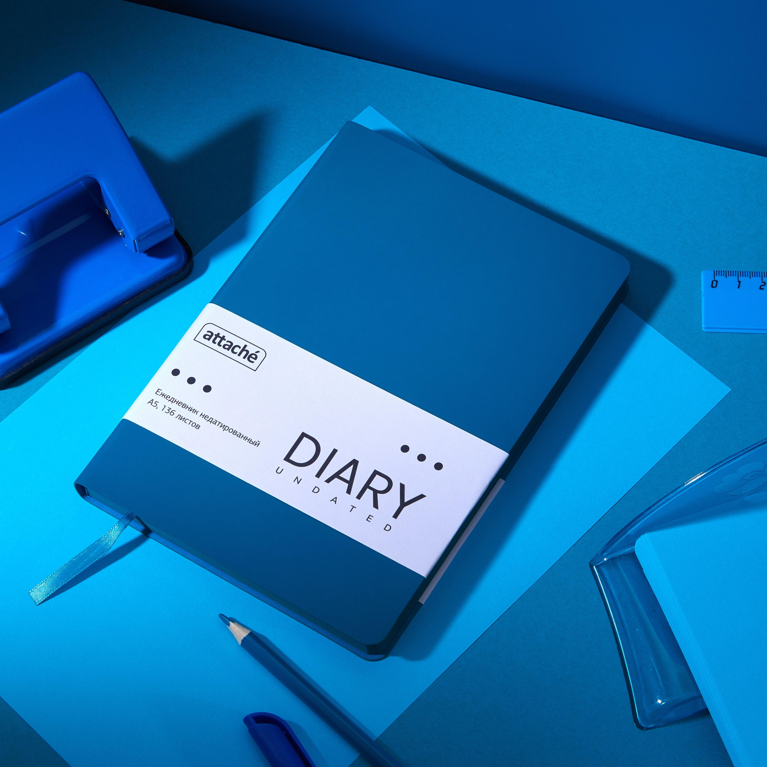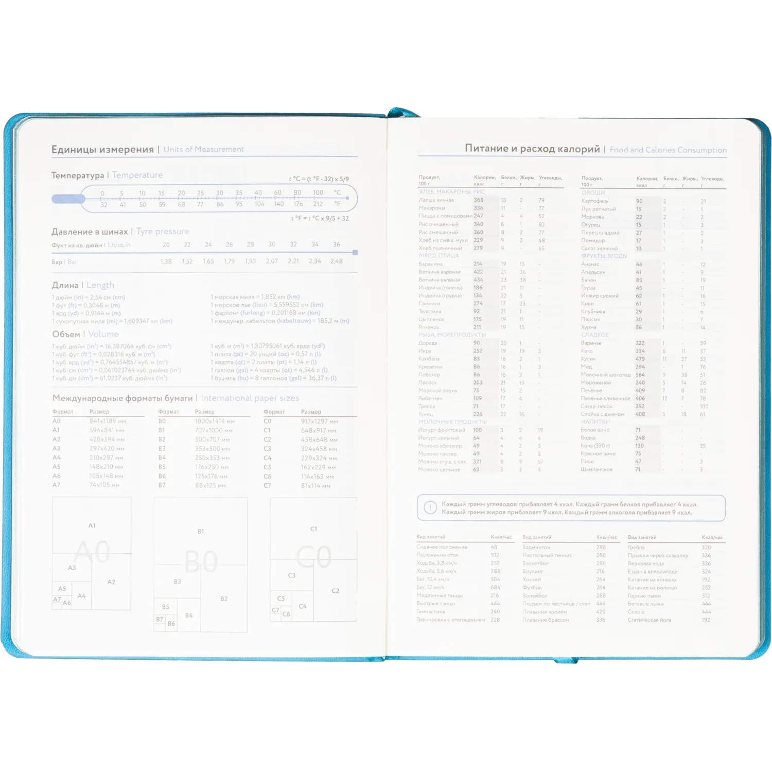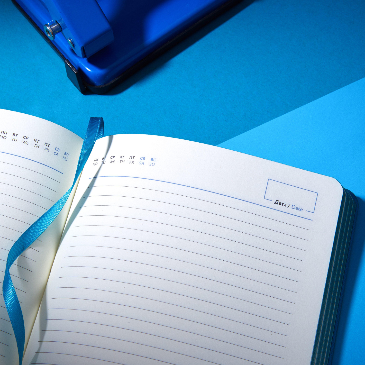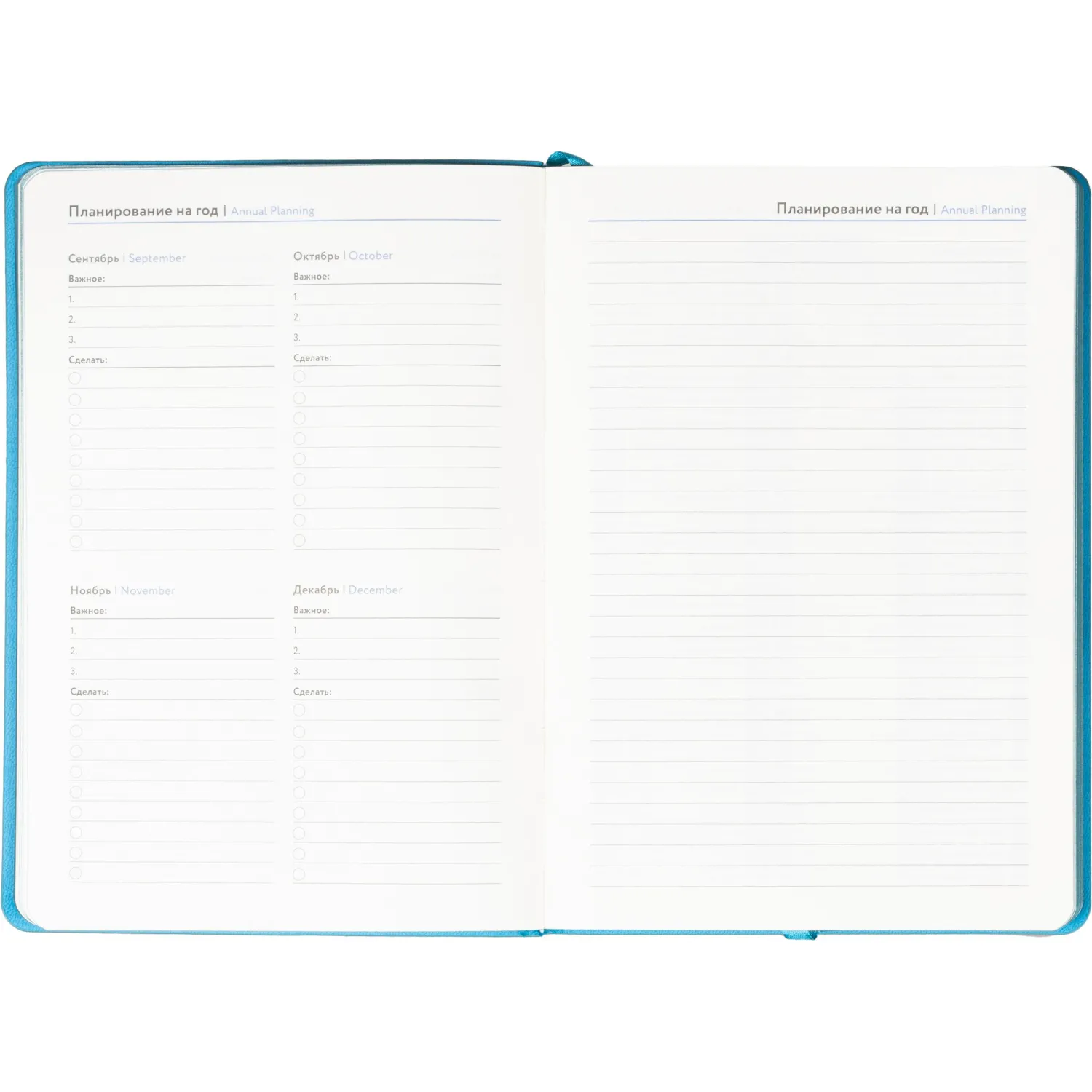 Ежедневник формата A5 предназначен для записи заметок, планов и идей без указания дат. Обложка выполнена из искусственной кожи бирюзового цвета с тиснением и оформлена в однотонном стиле. Мягкий переплёт обеспечивает лёгкость и гибкость изделия, а сшивка блока делает его прочным при повседневном использовании.
