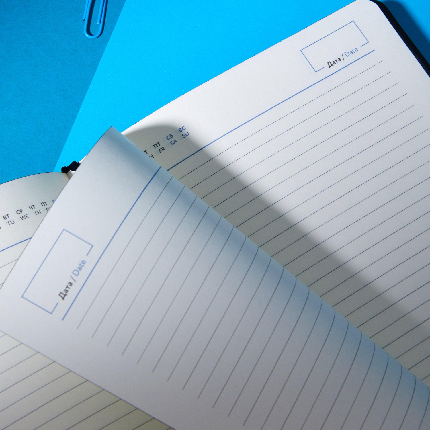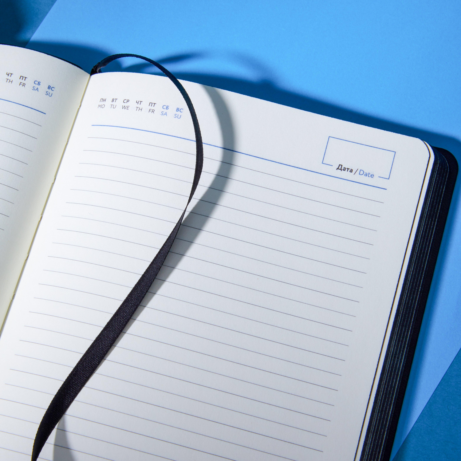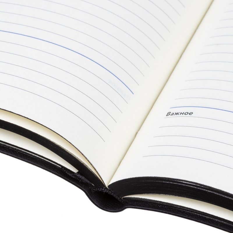 Внутренний блок содержит 136 листов тонированной офсетной бумаги плотностью 80 г/кв.м. Страницы напечатаны в две краски и размечены в линейку. Скруглённые углы листов делают перелистывание более комфортным. Чёрный обрез подчёркивает строгий и аккуратный внешний вид изделия.