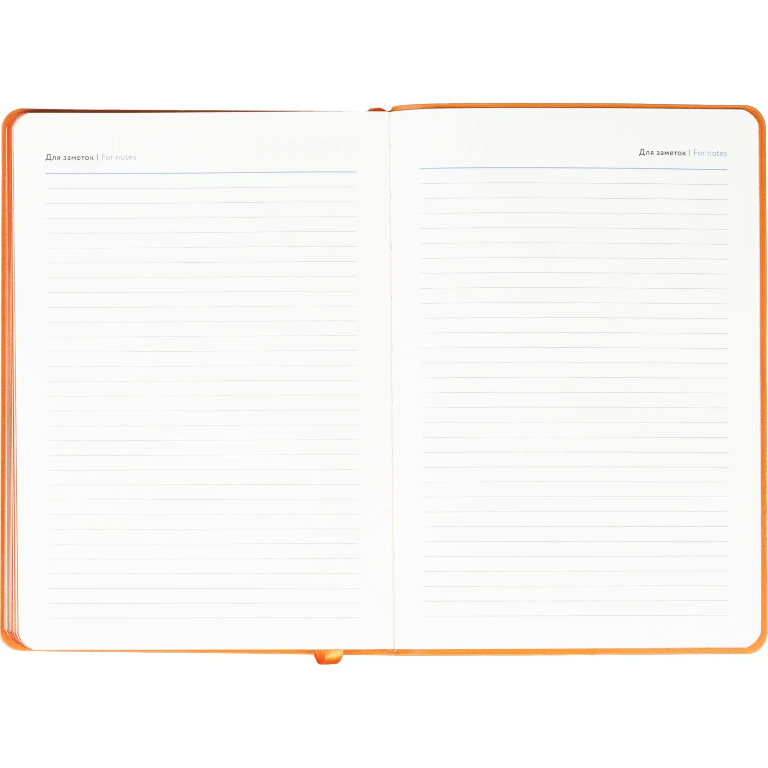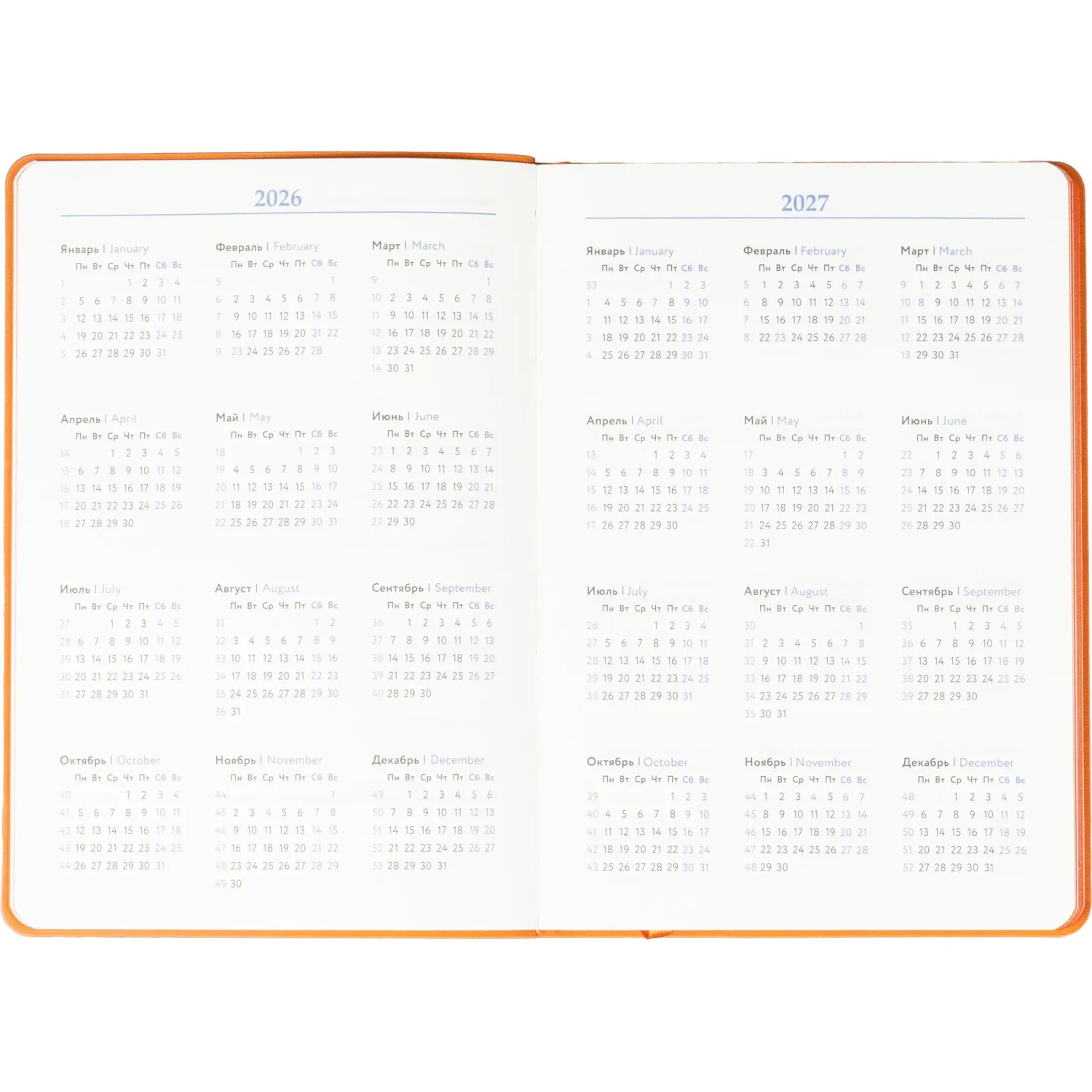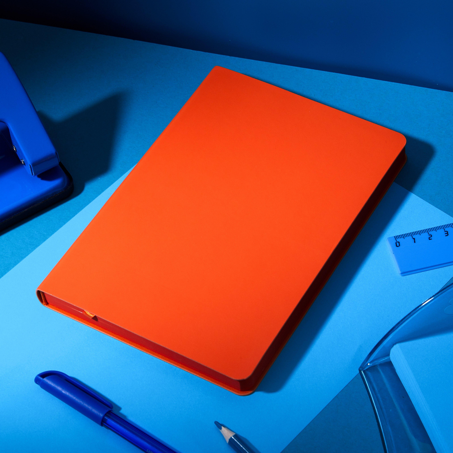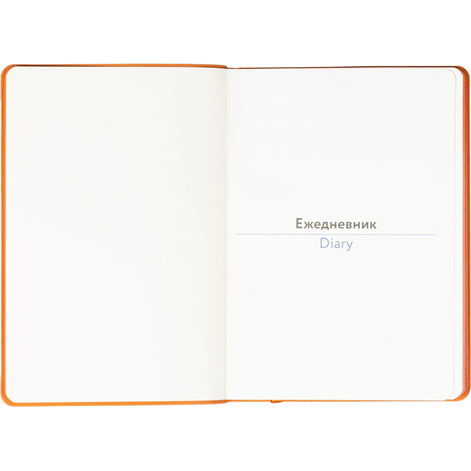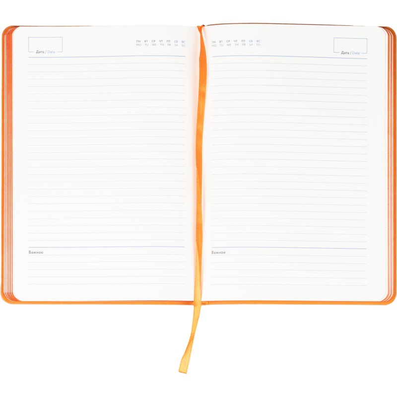 Ежедневник формата A5 предназначен для универсального использования без привязки к датам. Обложка выполнена из искусственной кожи оранжевого цвета с тиснением и оформлена в однотонном стиле. Мягкий переплёт делает изделие лёгким и гибким, удобным для повседневного ношения. Крепление выполнено сшивкой, что обеспечивает прочность блока.