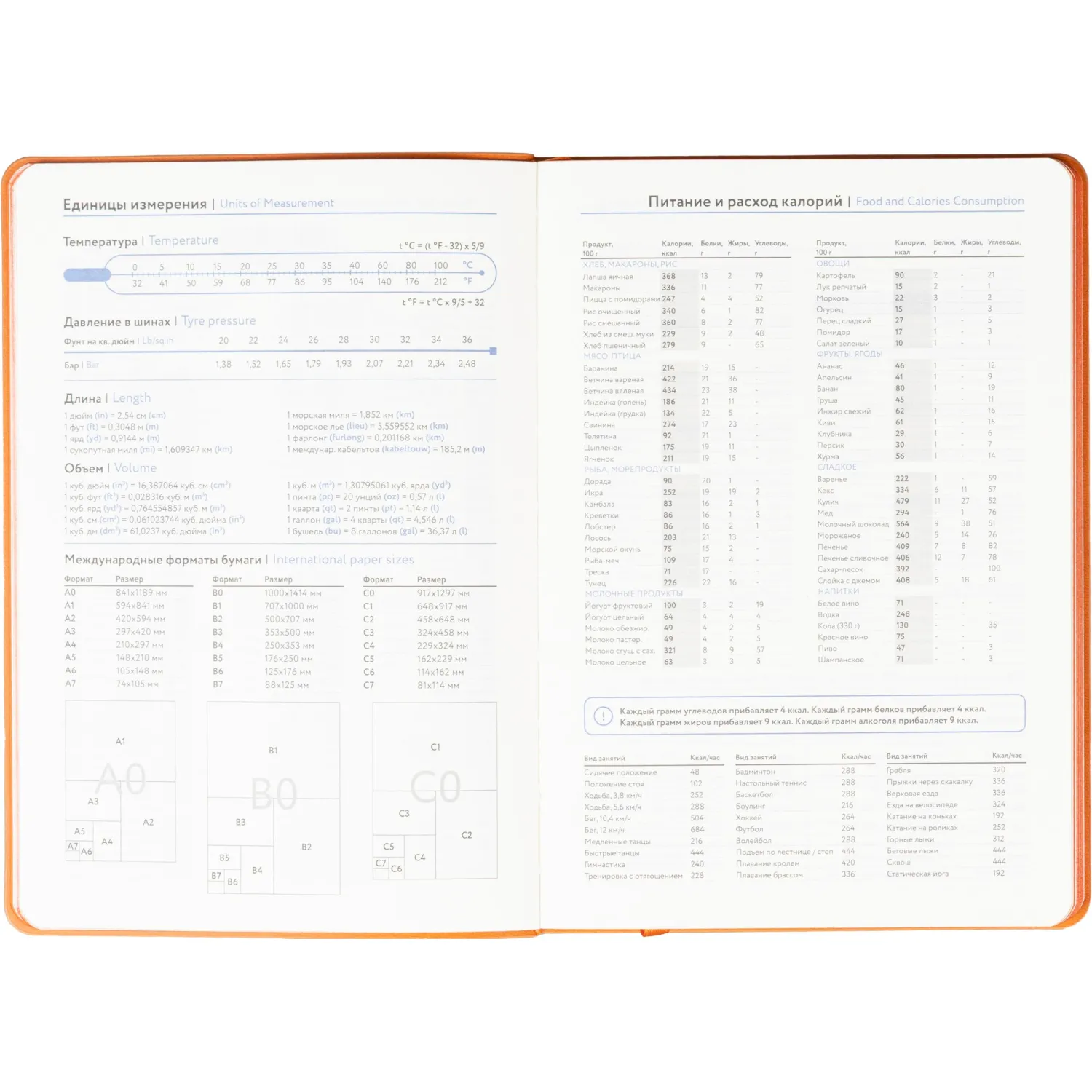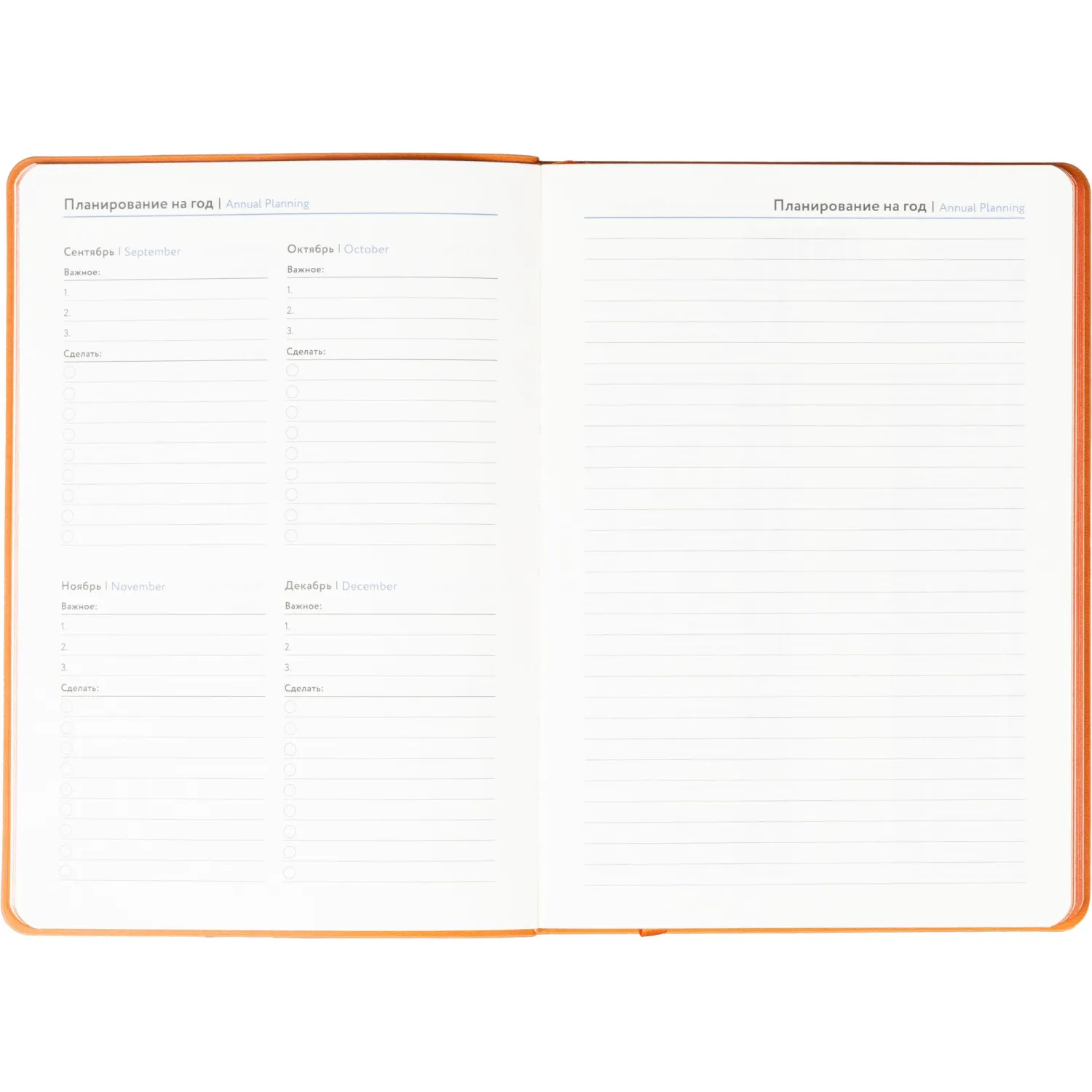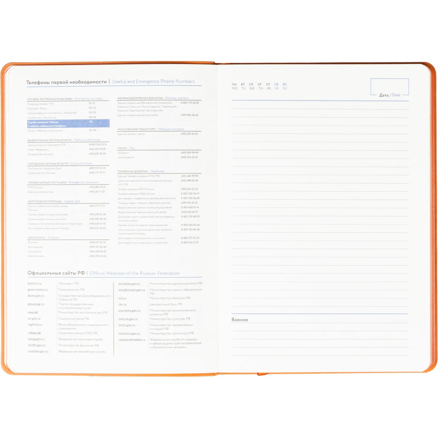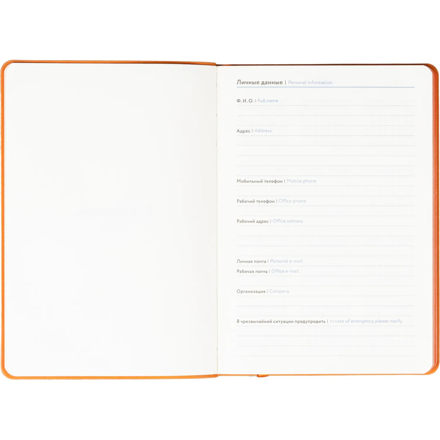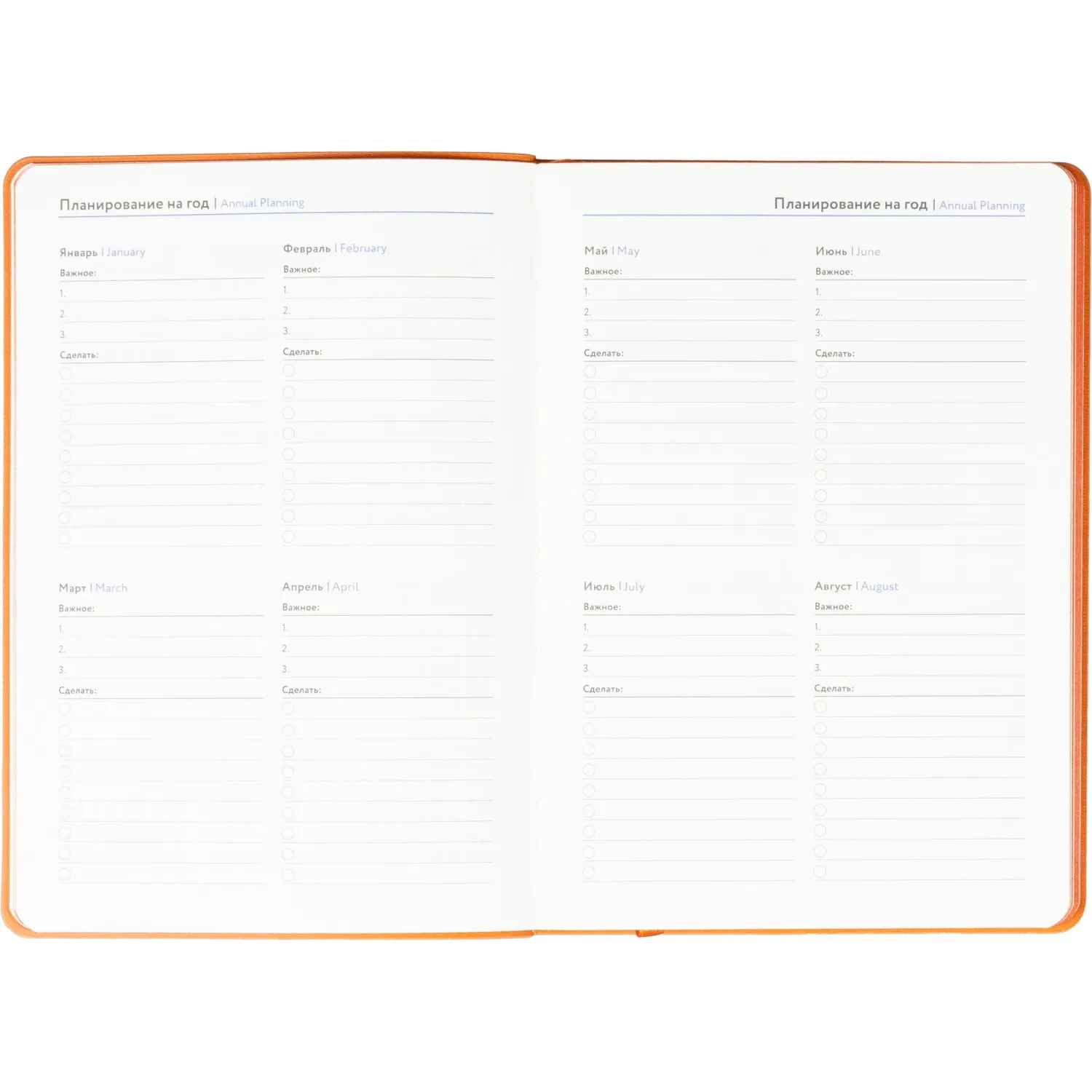 Ежедневник формата A5 предназначен для универсального использования без привязки к датам. Обложка выполнена из искусственной кожи оранжевого цвета с тиснением и оформлена в однотонном стиле. Мягкий переплёт делает изделие лёгким и гибким, удобным для повседневного ношения. Крепление выполнено сшивкой, что обеспечивает прочность блока.