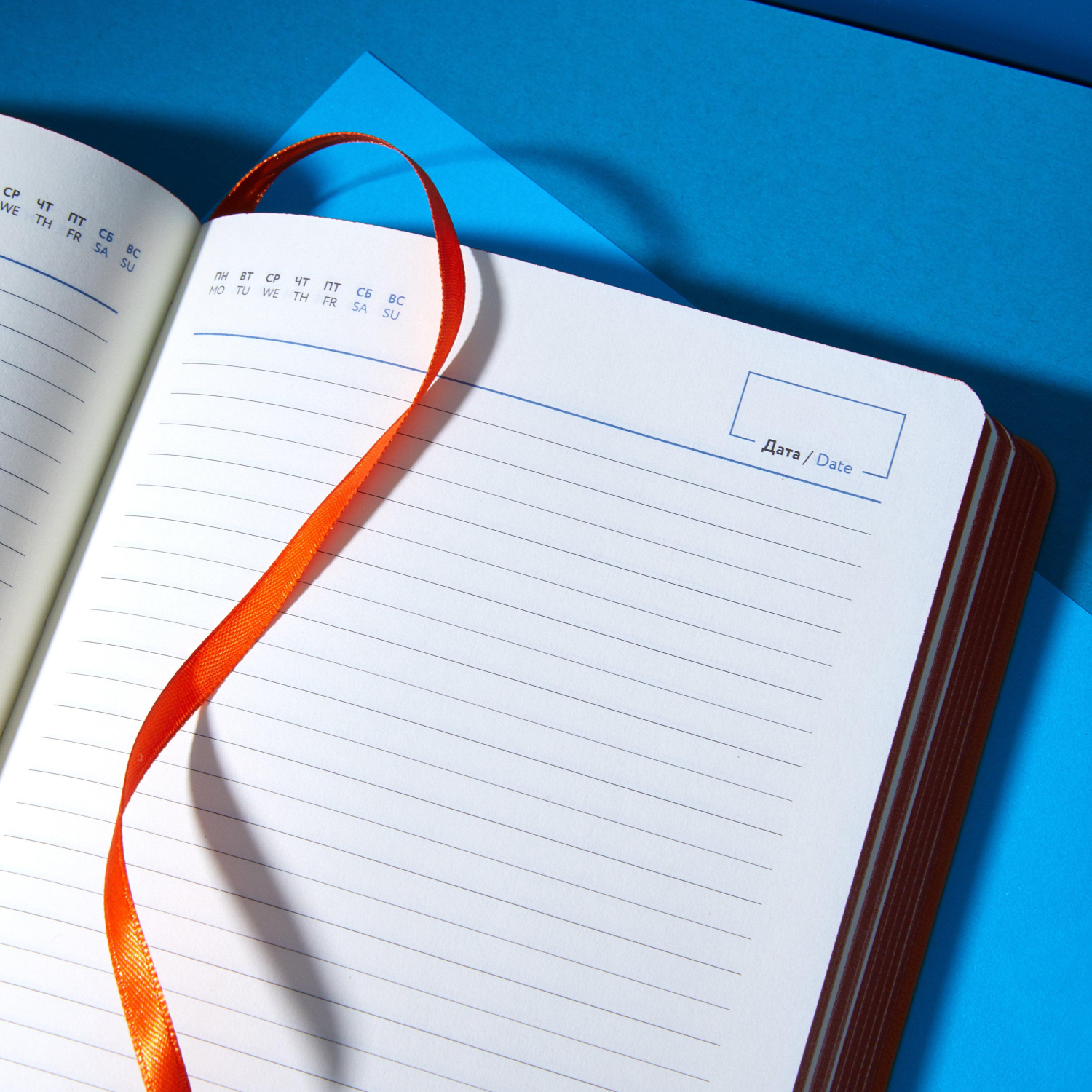 Внутренний блок содержит 136 листов тонированной офсетной бумаги плотностью 80 г/кв.м. Страницы напечатаны в две краски и размечены в линейку. Скруглённые углы листов делают перелистывание более комфортным. Оранжевый обрез придаёт изделию яркий и аккуратный внешний вид.