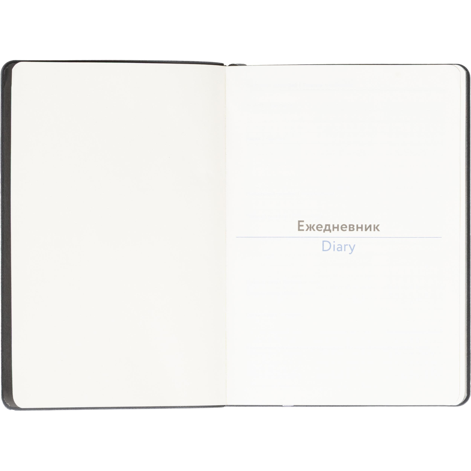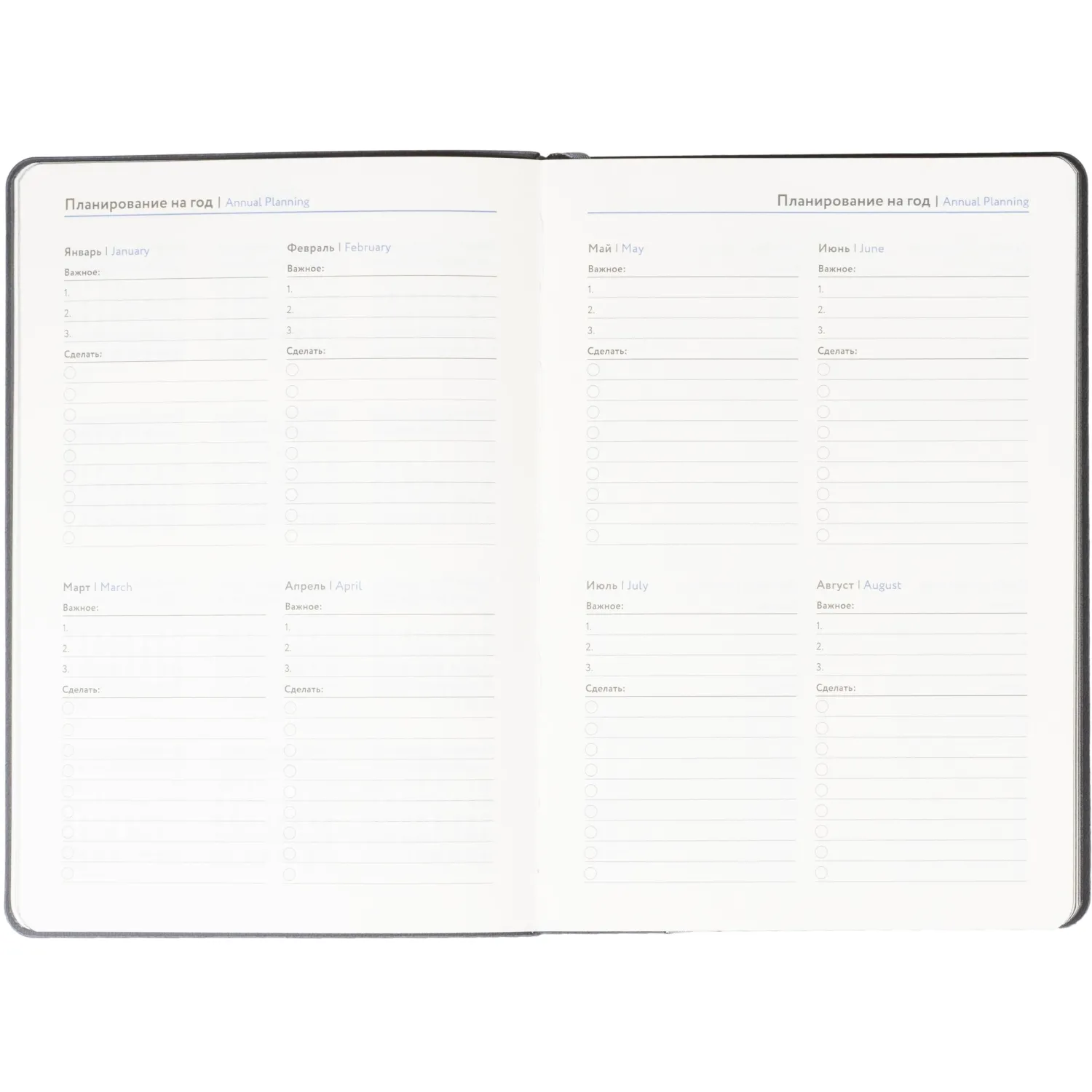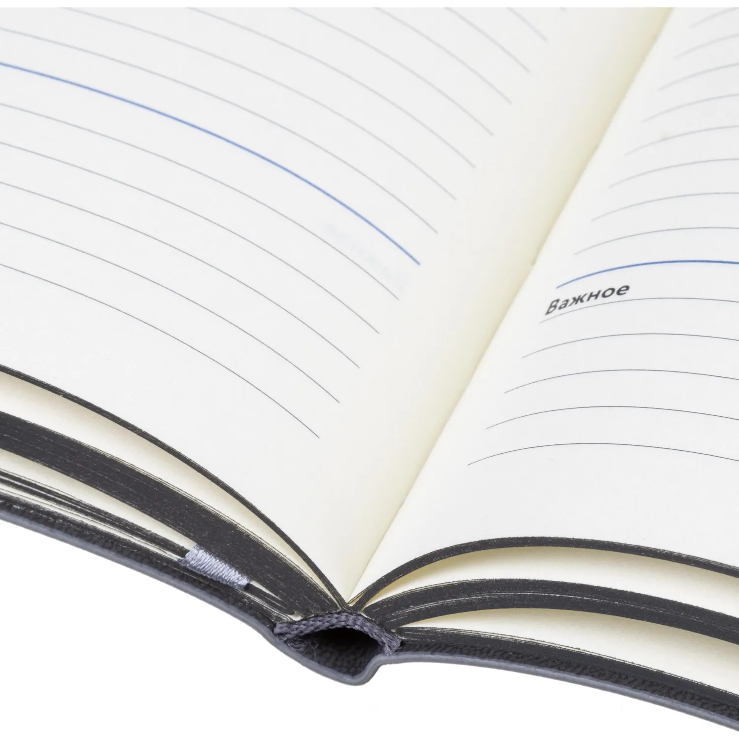 Ежедневник формата A5 подходит для записи планов и заметок без указания дат. Обложка выполнена из искусственной кожи серого цвета с тиснением и оформлена в однотонном стиле. Мягкий переплёт делает изделие лёгким и удобным для ежедневного использования. Крепление блока выполнено сшивкой, что обеспечивает его надёжность.