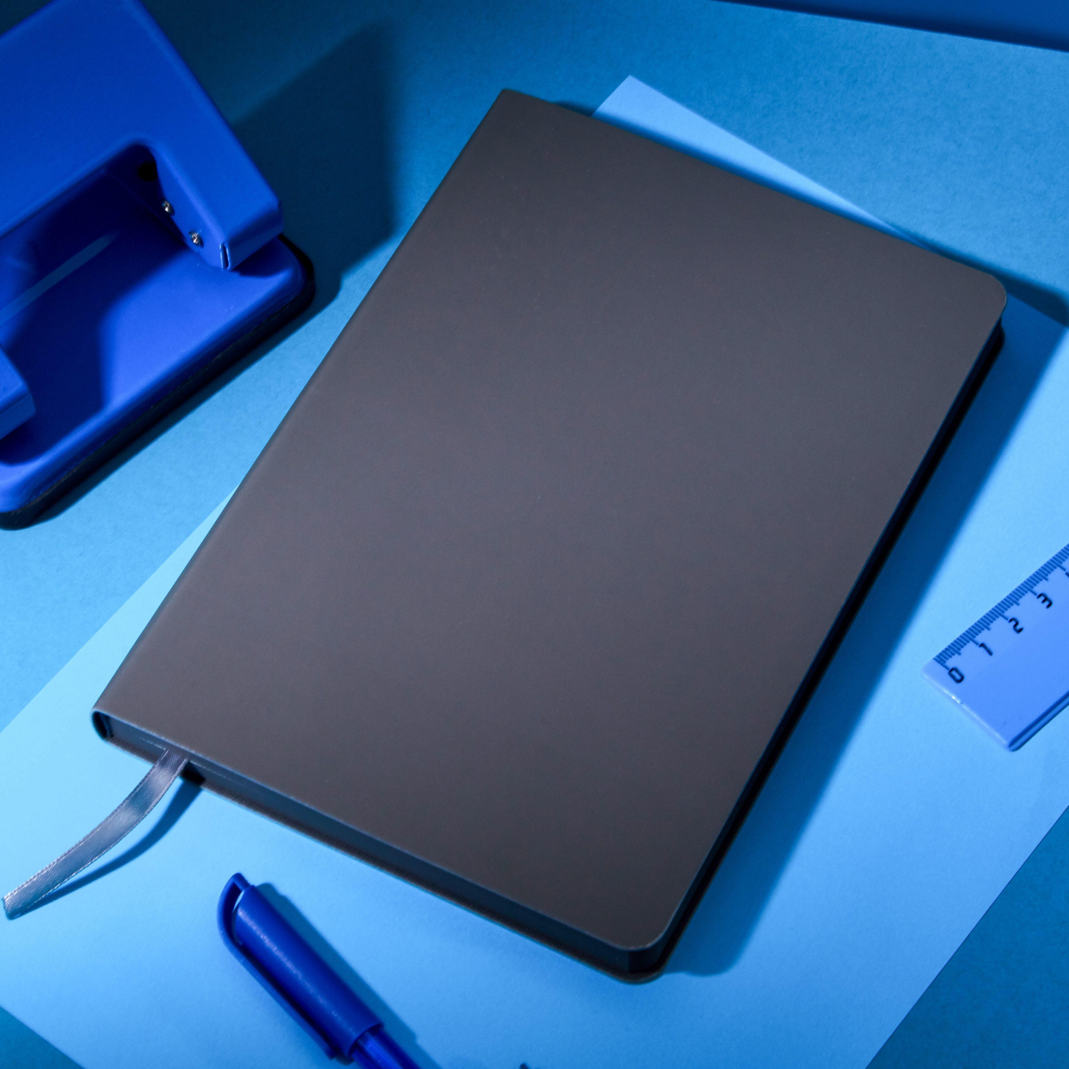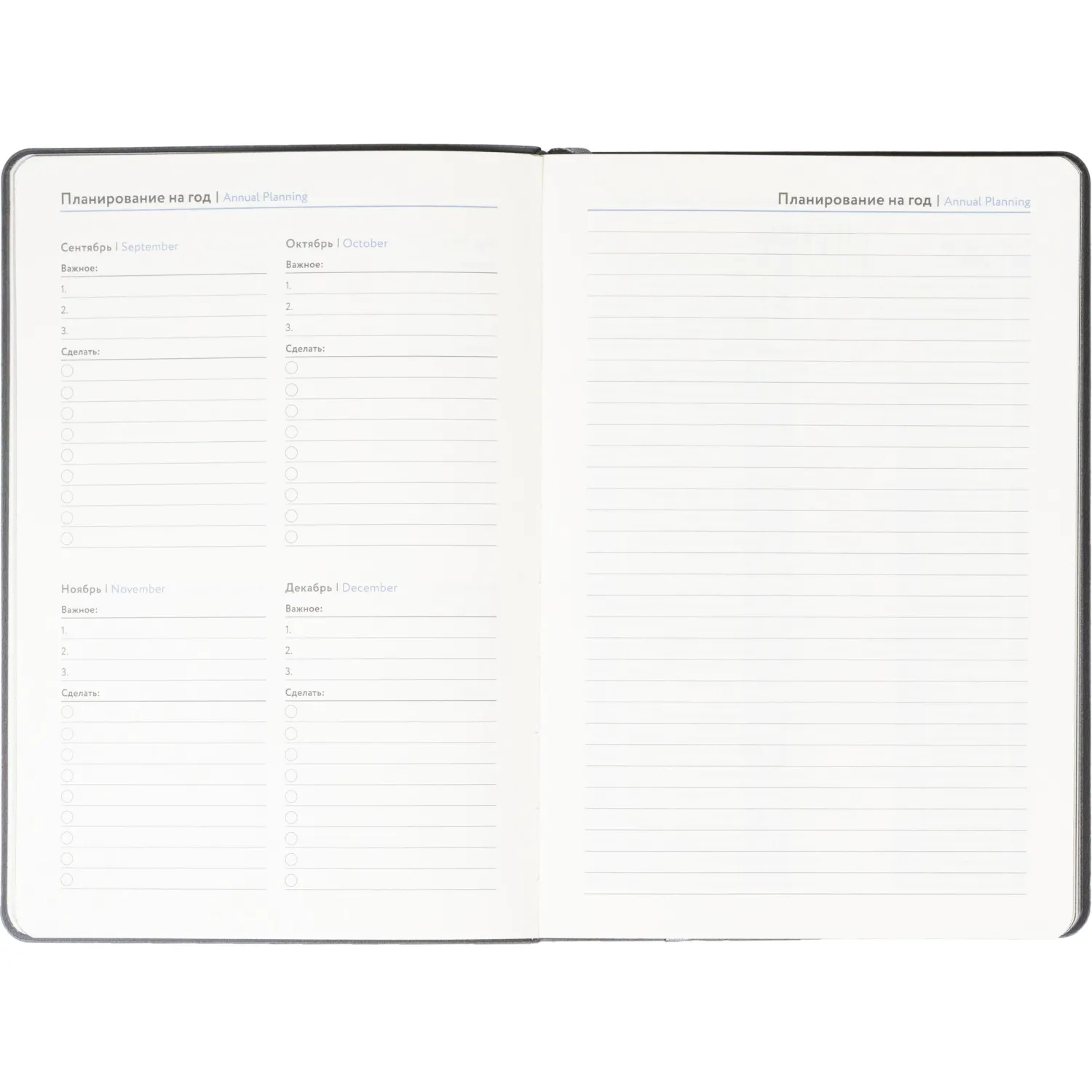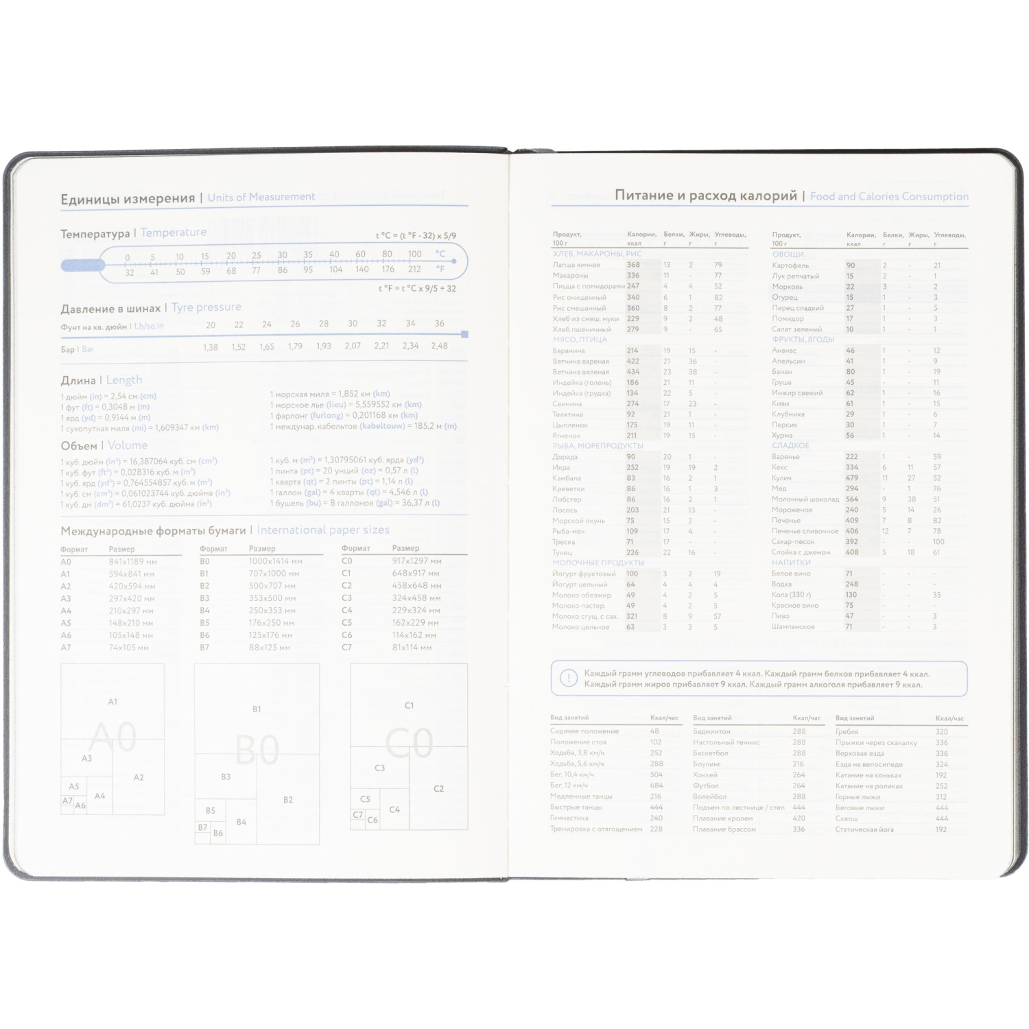 Ежедневник формата A5 подходит для записи планов и заметок без указания дат. Обложка выполнена из искусственной кожи серого цвета с тиснением и оформлена в однотонном стиле. Мягкий переплёт делает изделие лёгким и удобным для ежедневного использования. Крепление блока выполнено сшивкой, что обеспечивает его надёжность.