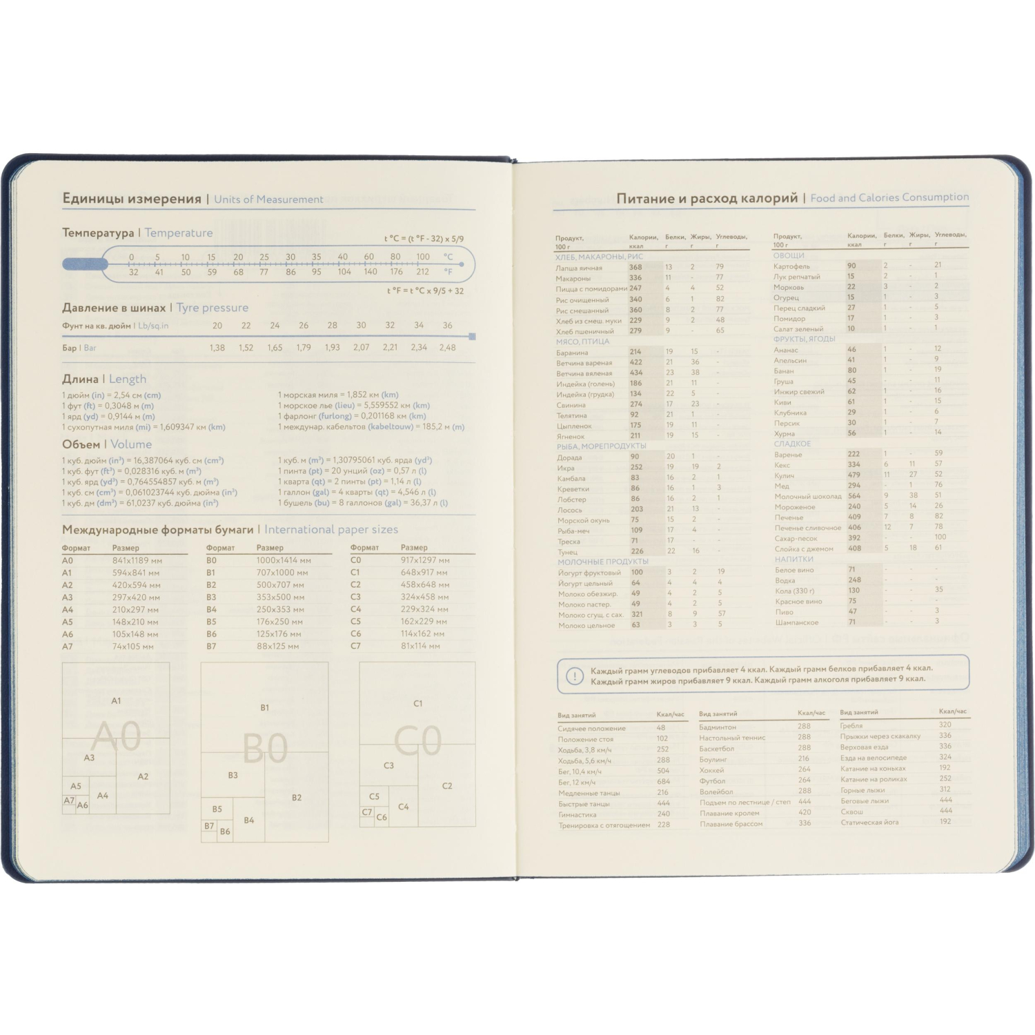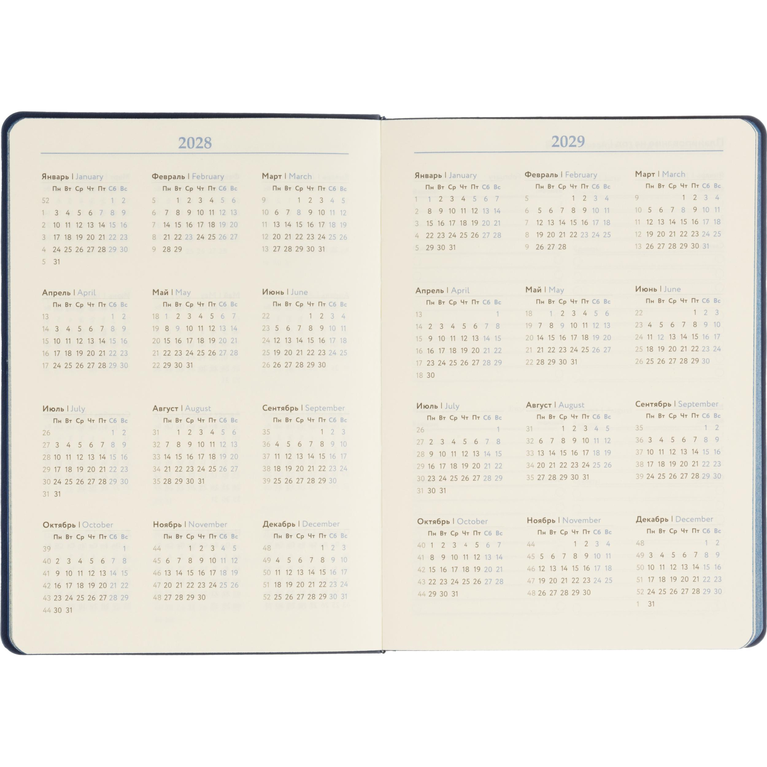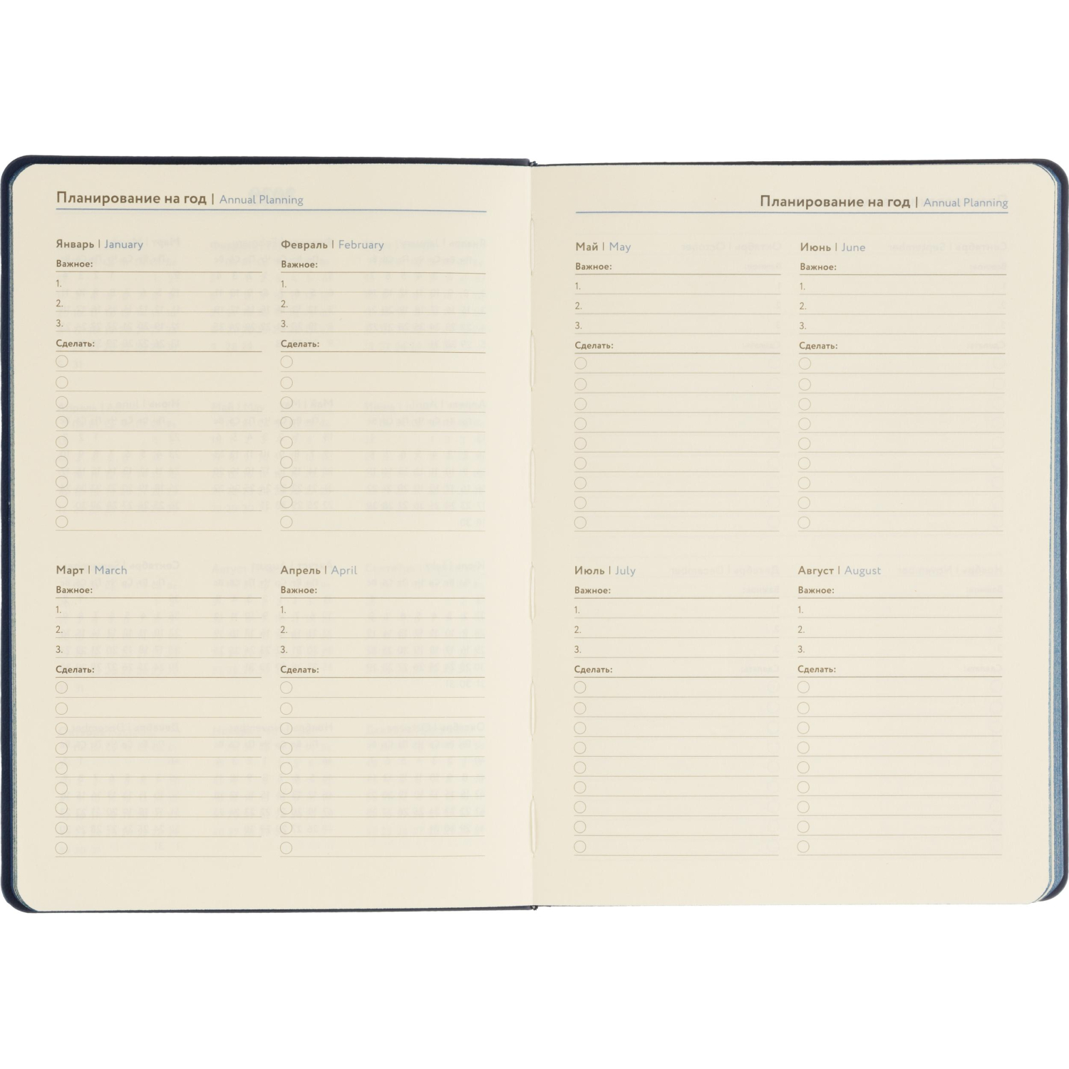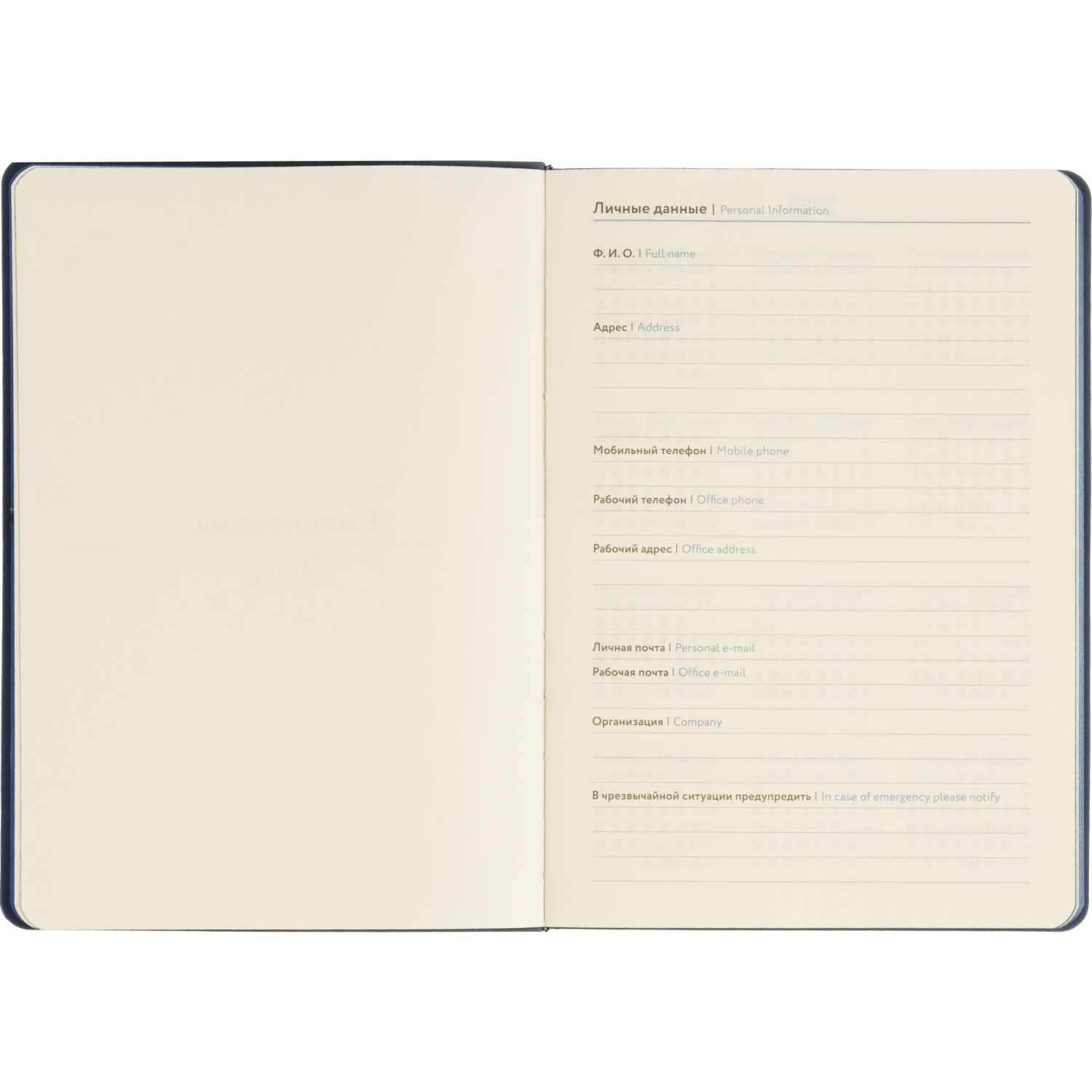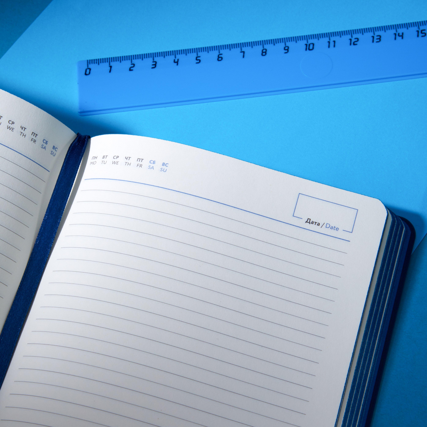 Обложка синего цвета выполнена из искусственной кожи с покрытием Soft Touch, приятным на ощупь. Её мягкая структура делает ежедневник лёгким и гибким. Обрез блока окрашен в синий цвет, гармонирующий с обложкой. Скруглённые углы и вырубка блока повышают комфорт при использовании. Ежедневник дополнен ляссе и календарём на два года. Подходит под персонализацию.