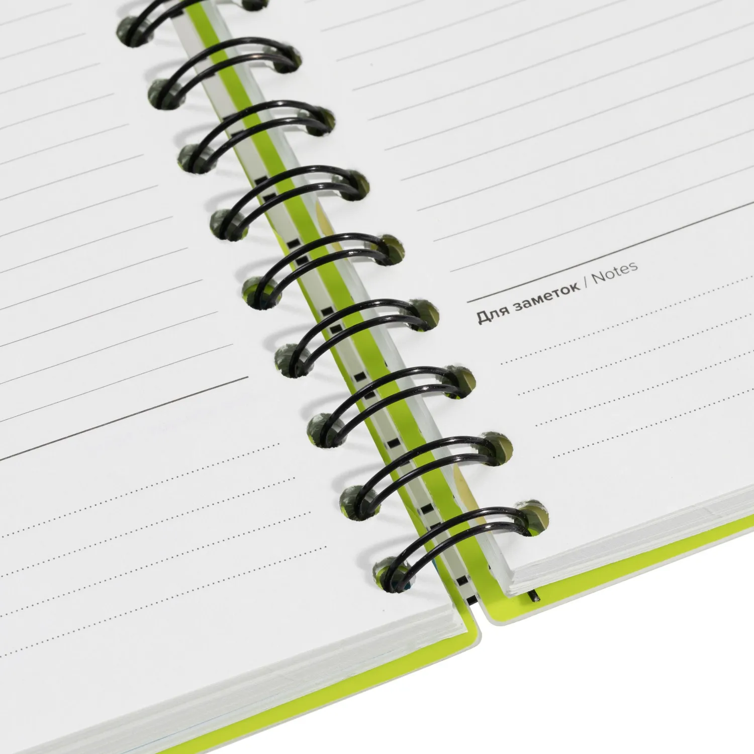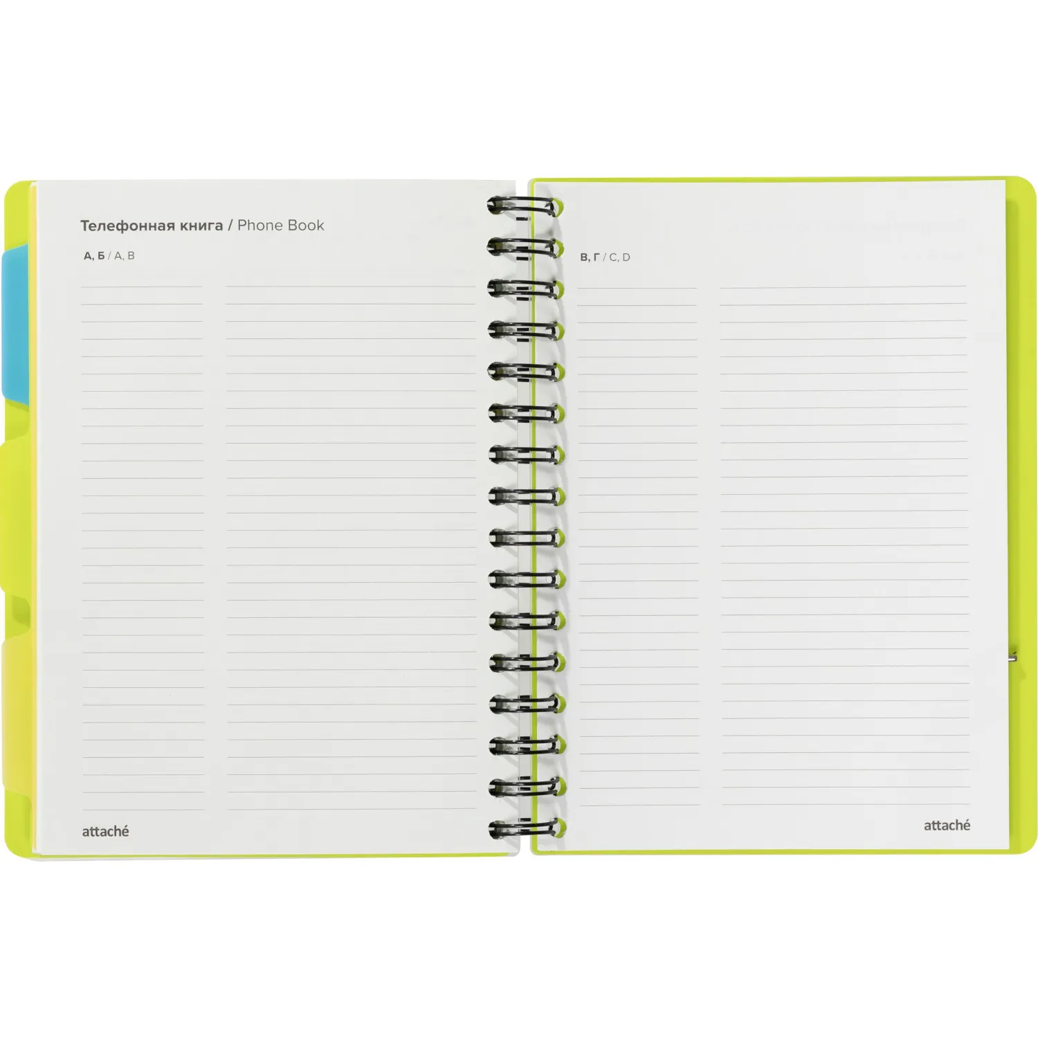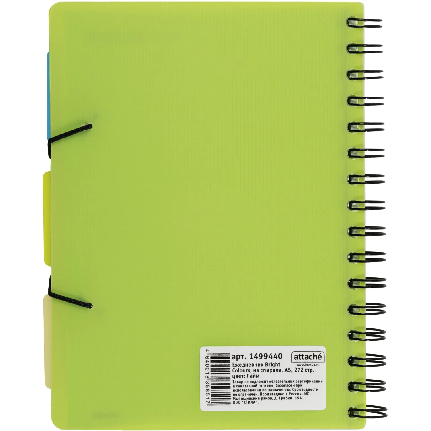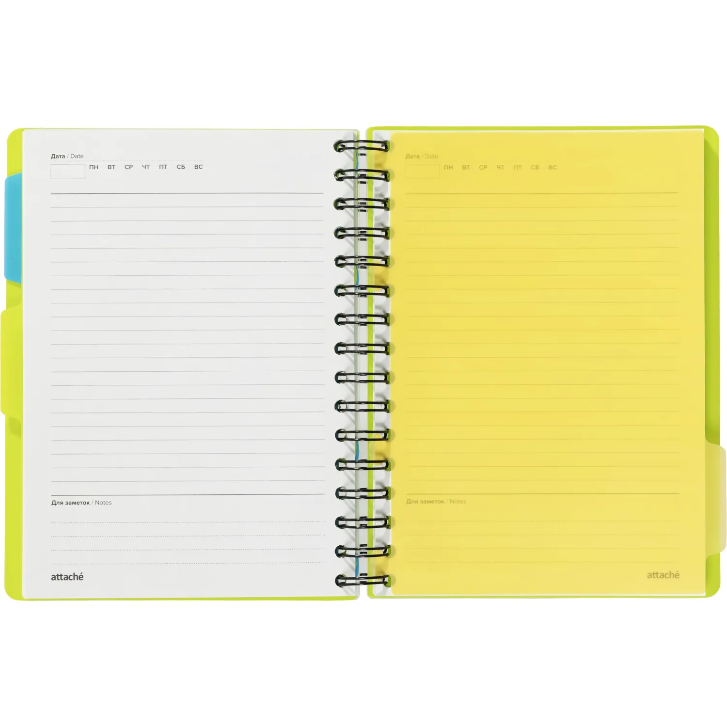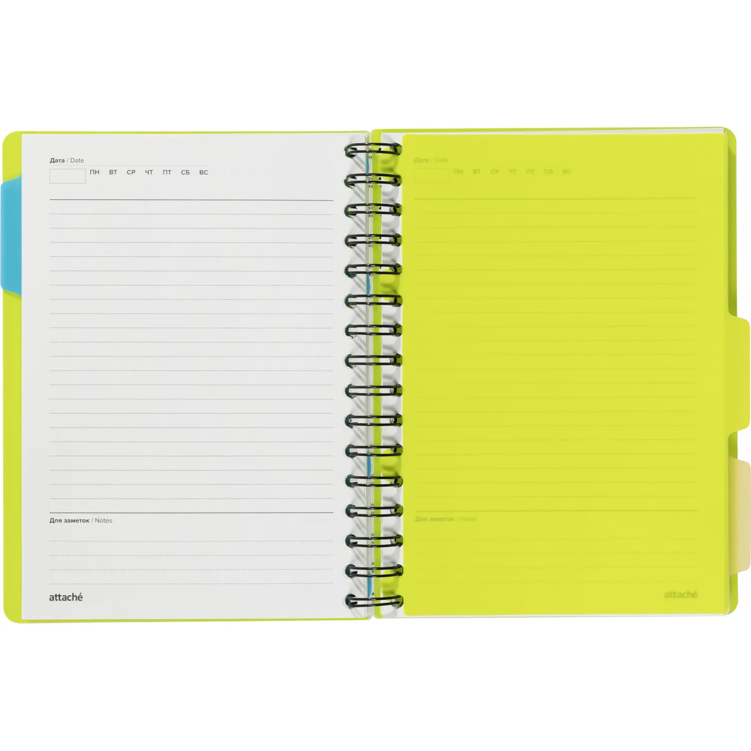 Ежедневник недатированный Attache Bright Colours формата A5 с обложкой из плотного пластика с фактурой «волна» и подложкой из тактильно приятного цветного пластика. Листы выполнены из качественной тонированной офсетной бумаги плотностью 70-90 г/кв.м. Листы крепятся на металлическую спираль увеличенного диаметра, что облегчает перелистывание. Ежедневник закрывается на резинку и содержит три съёмных пластиковых разделителя для удобной организации записей. Дизайн обложки однотонный лаймового цвета. Линовка блока — в линию, печать выполнена в два цвета. Внутри отсутствуют ляссе, карманы и календарь.