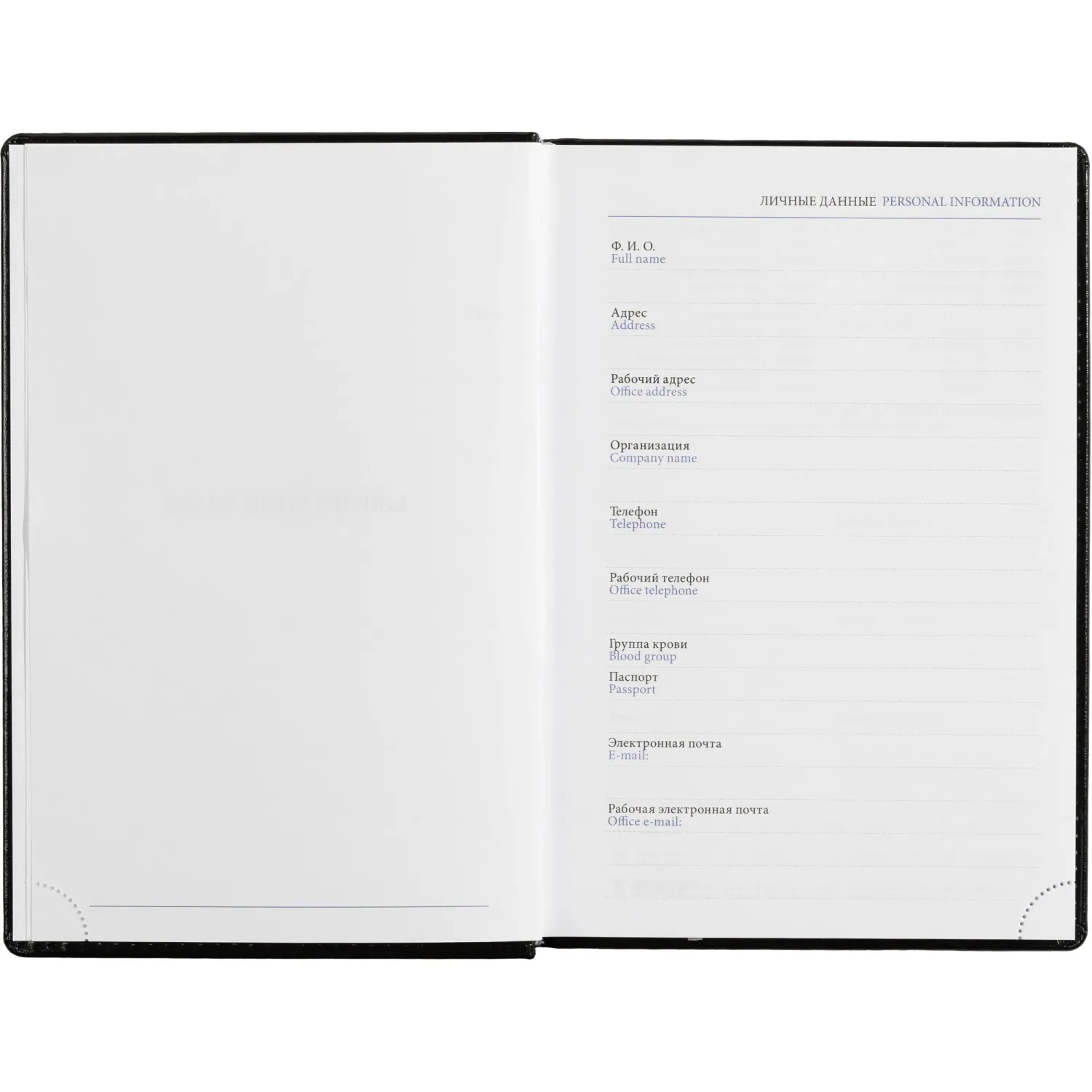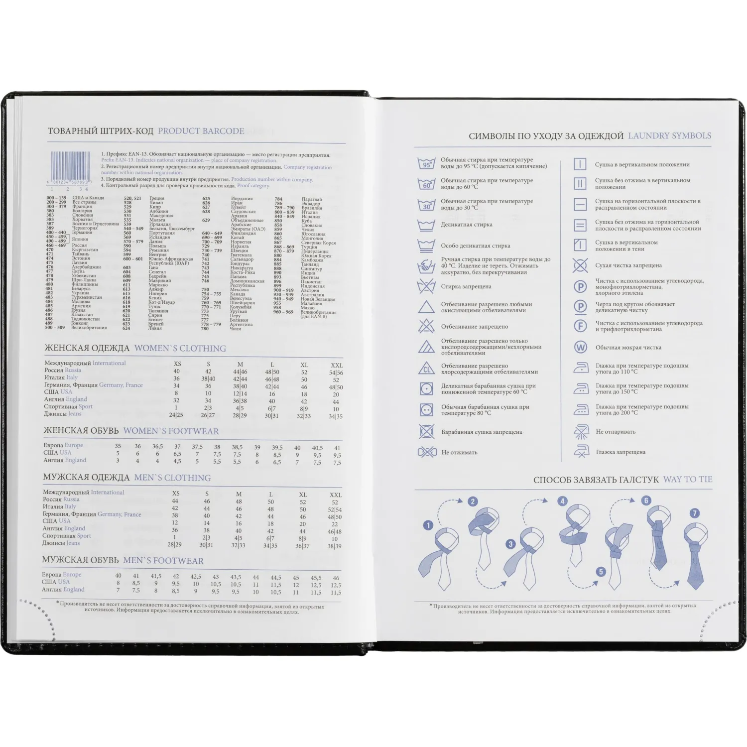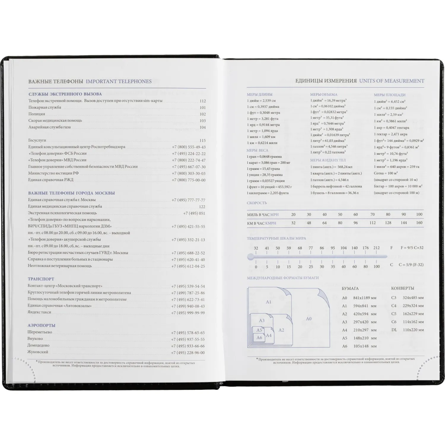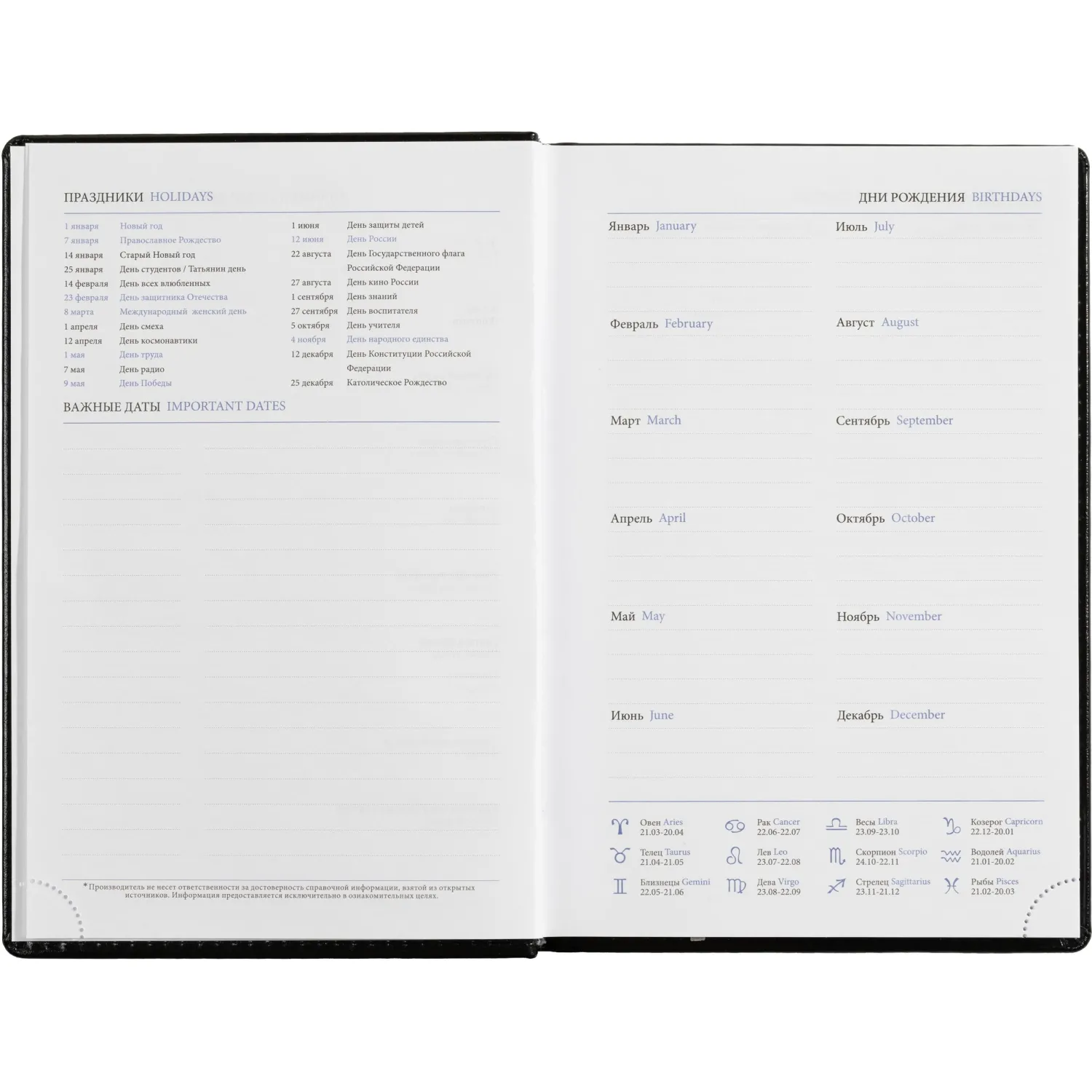 Ежедневник включает информационно-справочный блок с разделами: личные данные, праздники, междугородные телефонные коды городов России, важные телефоны Москвы и Санкт-Петербурга, международные размеры одежды, знаки зодиака, штриховой код, сведения по странам, справочная информация о мерах длины, температуре, международных форматах бумаги, цифровые коды ГИБДД, планы на год.